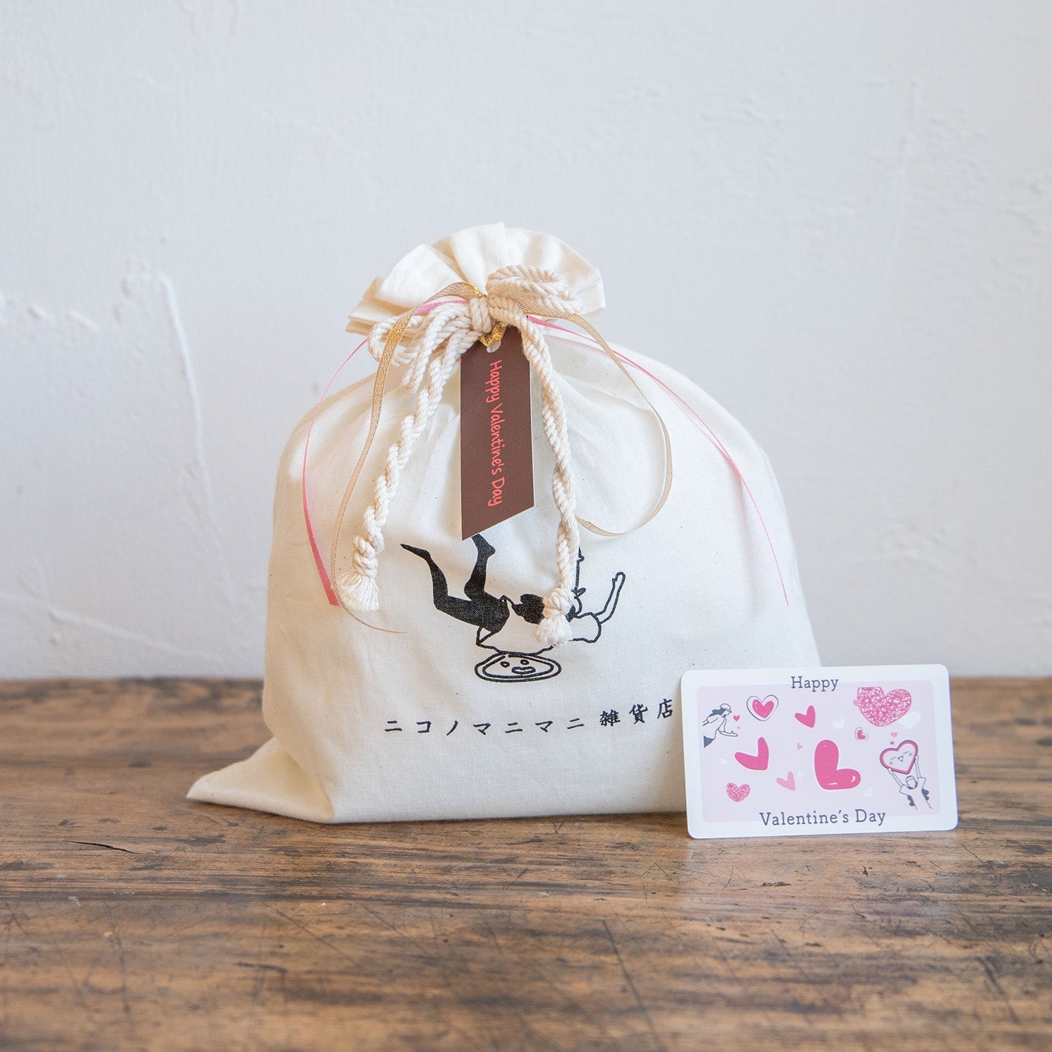 ニコノマニマニ雑貨店オリジナルのコットンギフトバッグに商品を入れて、メッセージとイラストが描かれたタグをつけてお届けします。