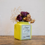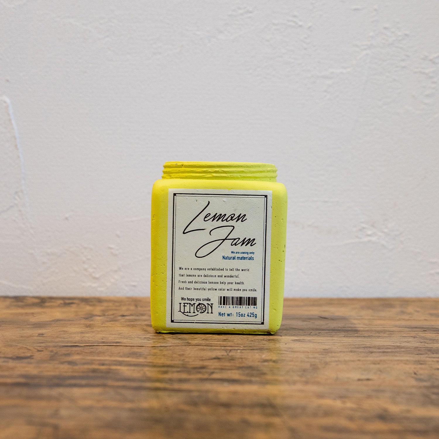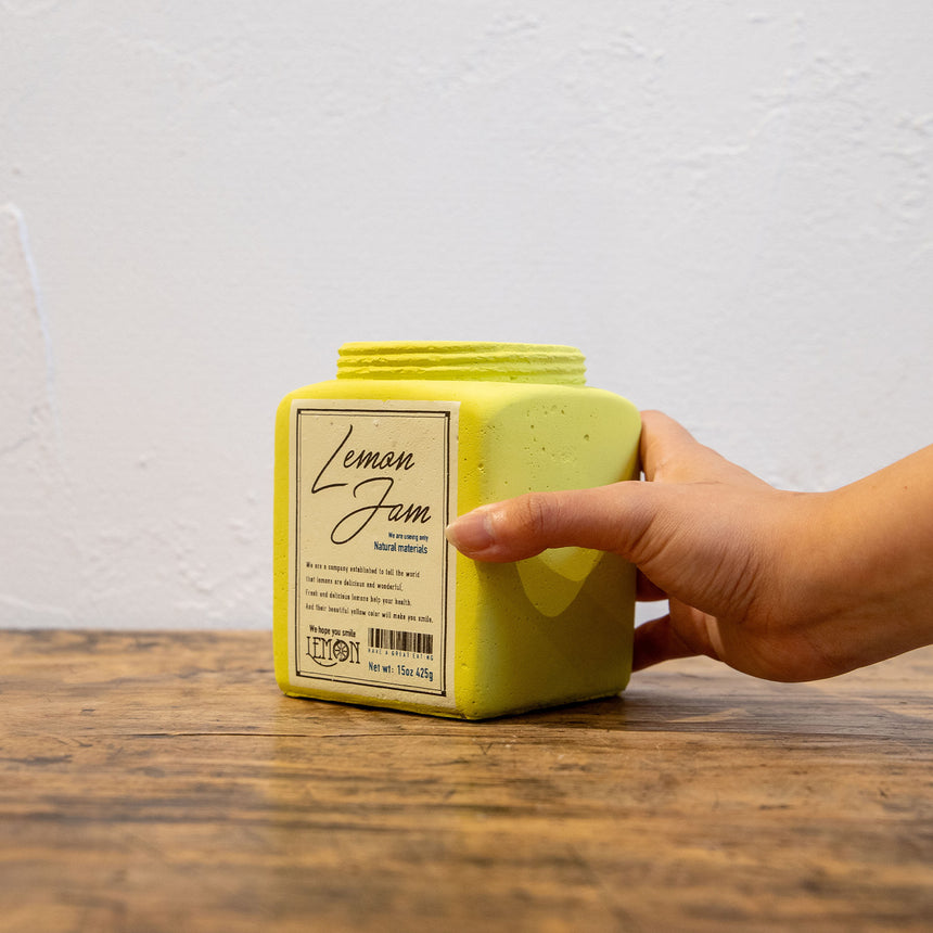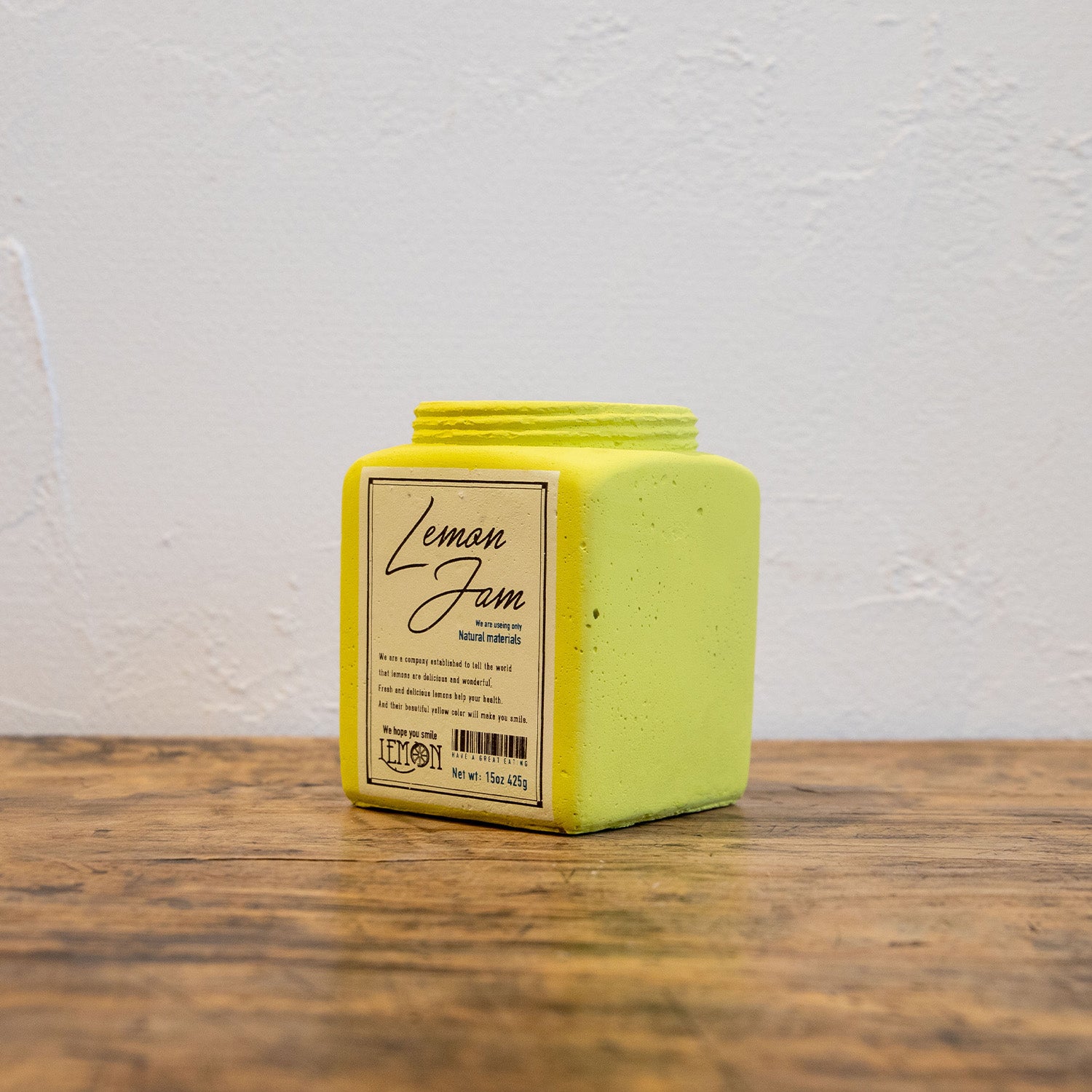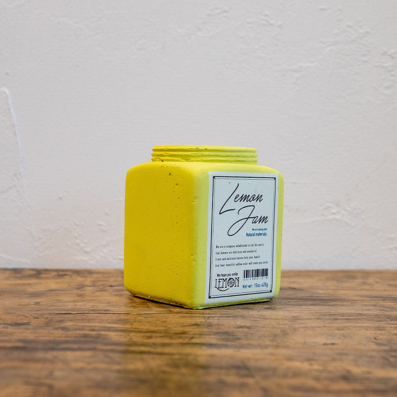 自由度の高いセメント素材で作られているため、角は瓶らしく丸みを帯びており、よりジャムビンらしさをさを作り出しています。黄色い色合いもポップで、グリーンや多肉植物との相性も良く、お部屋のアクセントにぴったりなインテリアポットです。