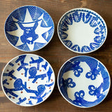 独自の世界観にあるれている松永武さんと高井知恵さんご夫婦による型染めユニット「katakata(カタカタ)」さんと倉敷意匠計画室が一緒に作った「印判手」のお皿シリーズ。