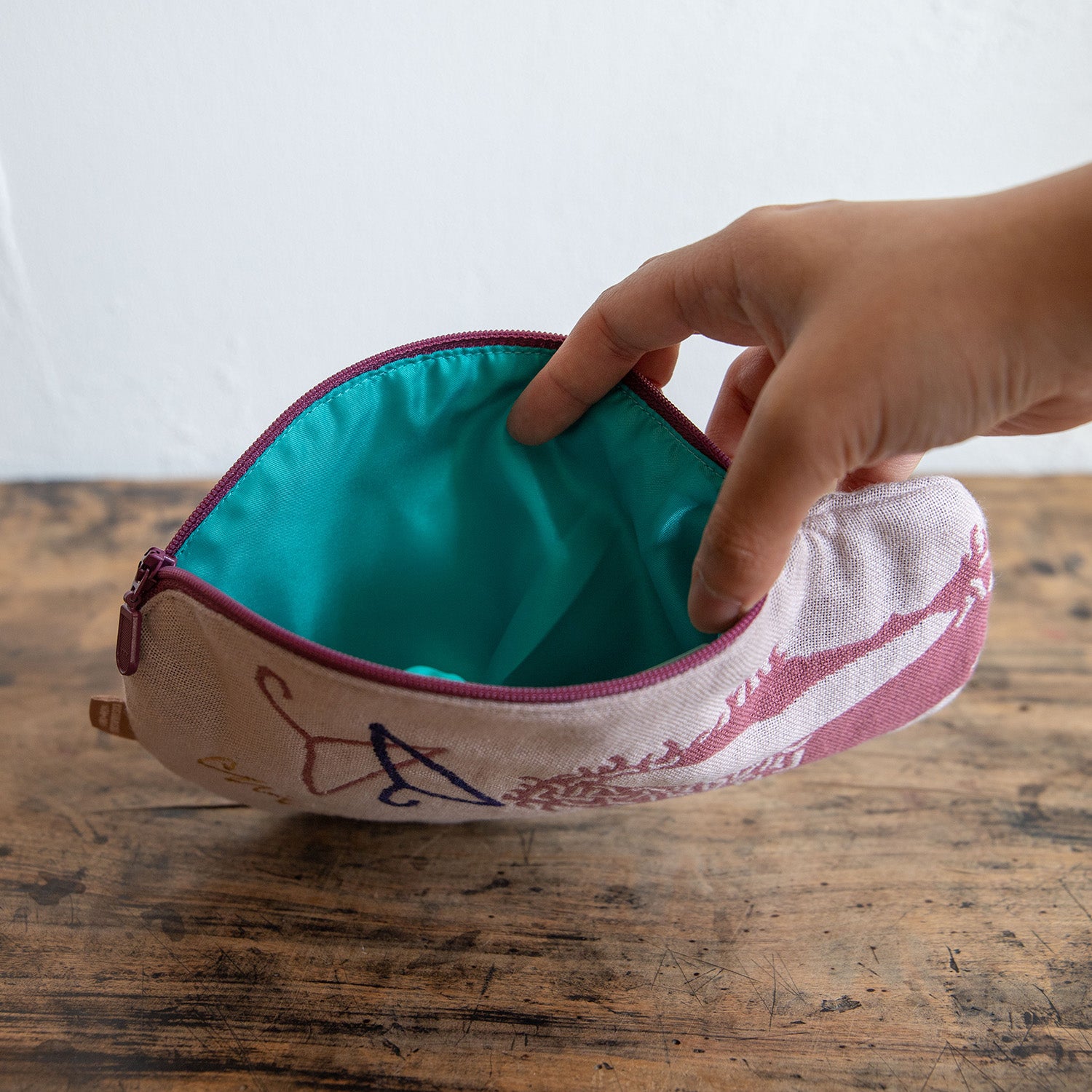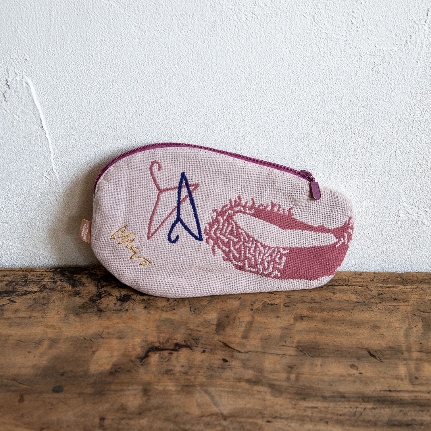 ゆっくりとした世界に暮らす生き物たちのカワイイ形のポーチです。MiWさんの不思議な世界が広がります。少ししっかりめに織ったガーゼ生地だから丈夫。ファスナーを開けるとパッと飛び込んでくるビビッドな色が新鮮です。毎日楽しみながら・・アイデア次第で使い方いろいろ。文具、メモ帳などをポンと入れたり、携帯電話もすっと入れたり、ハンカチやティッシュなどまとめてすぐに出せてとっても便利。バックの中の整理整頓に欠かせないポーチですですが、かわいいのでみんなにも見せたくなります!ガーゼハンカチとおそろいの柄のセットで使ってみてはいかがでしょう。