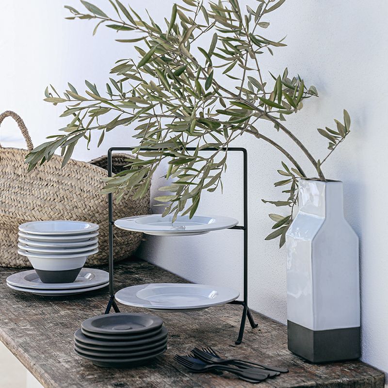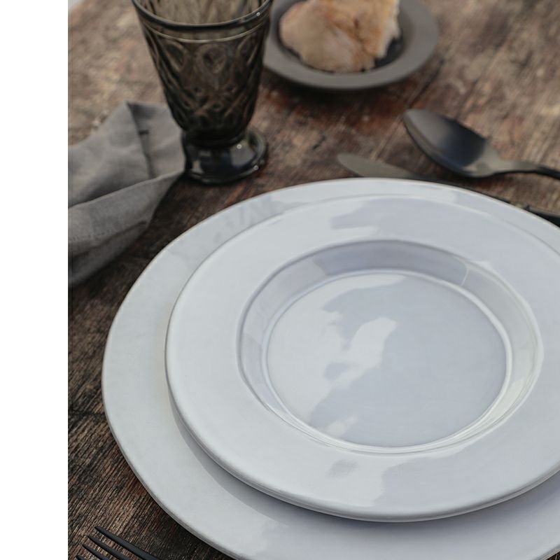 ぽってりと厚みのある、シンプルでアンティークなデザインがハイセンスな食器です。少しムラのある風味でかけられた白い釉薬と、そこからうっすら透ける濃いチャコールグレーの素地が、使い込まれたブロカントの食器のようなイメージに。素朴でナチュラルな風合いと、清潔で凛とした佇まいが、ポルトガルのブランドでありながら北欧の雰囲気もある、美しいデザインです。食卓を静かな路地裏のカフェやビストロのようなイメージに見せてくれそうですね。
