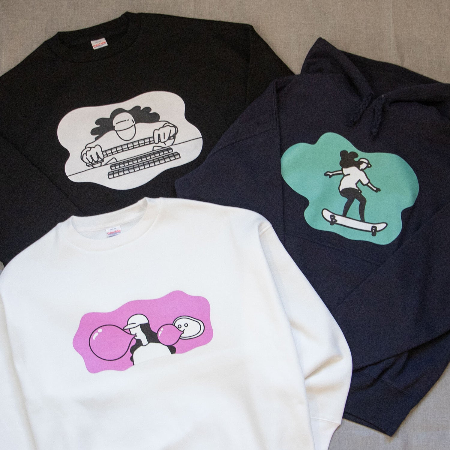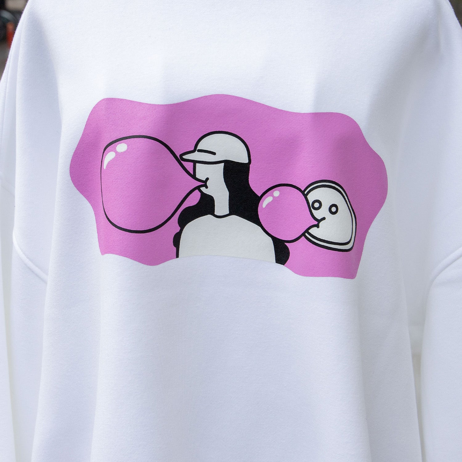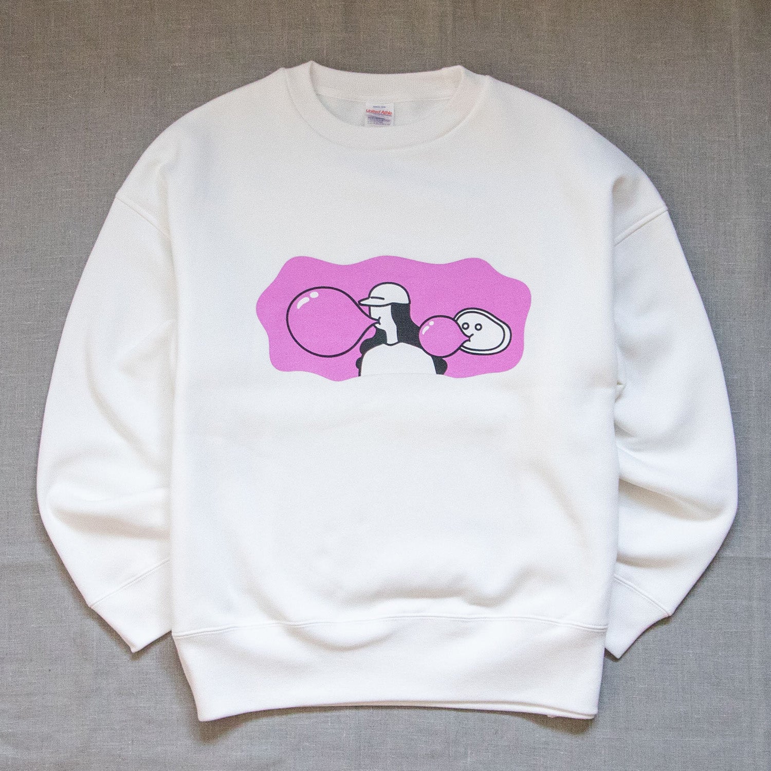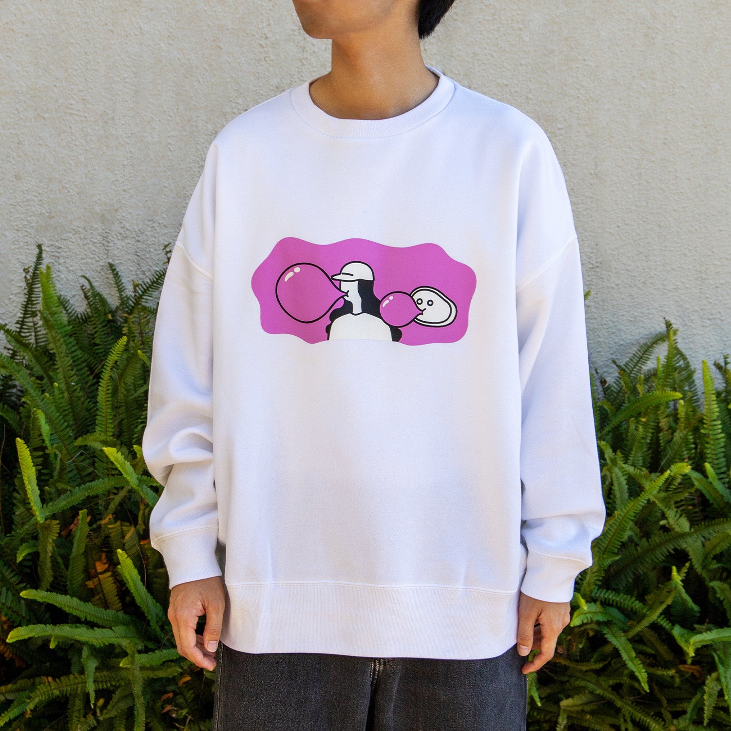 風船は大きければ大きい方がいい。ゴム風船も、水風船も、シャボン玉も。当然チューイングガムも特大に。一束全部口に入れてくっちゃらくっちゃら。割れて顔面に張り付くまでがニコマニ流。バブルでポップなチューイングガム。 そんな2024AWの新作。  ビッグシルエット 10.0オンス 裏起毛のゆったり暖かいスウェットです。