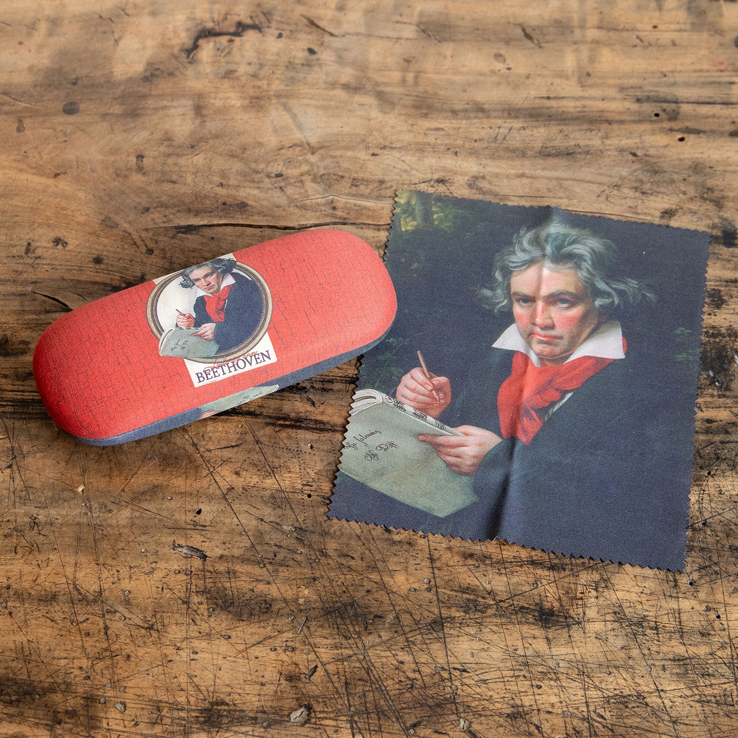 最も有名な肖像画のひとつ、画家J.K.シュティーラーによって描かれたベートーヴェン肖像画のメガネケース。同デザインのメガネクロス付きです。