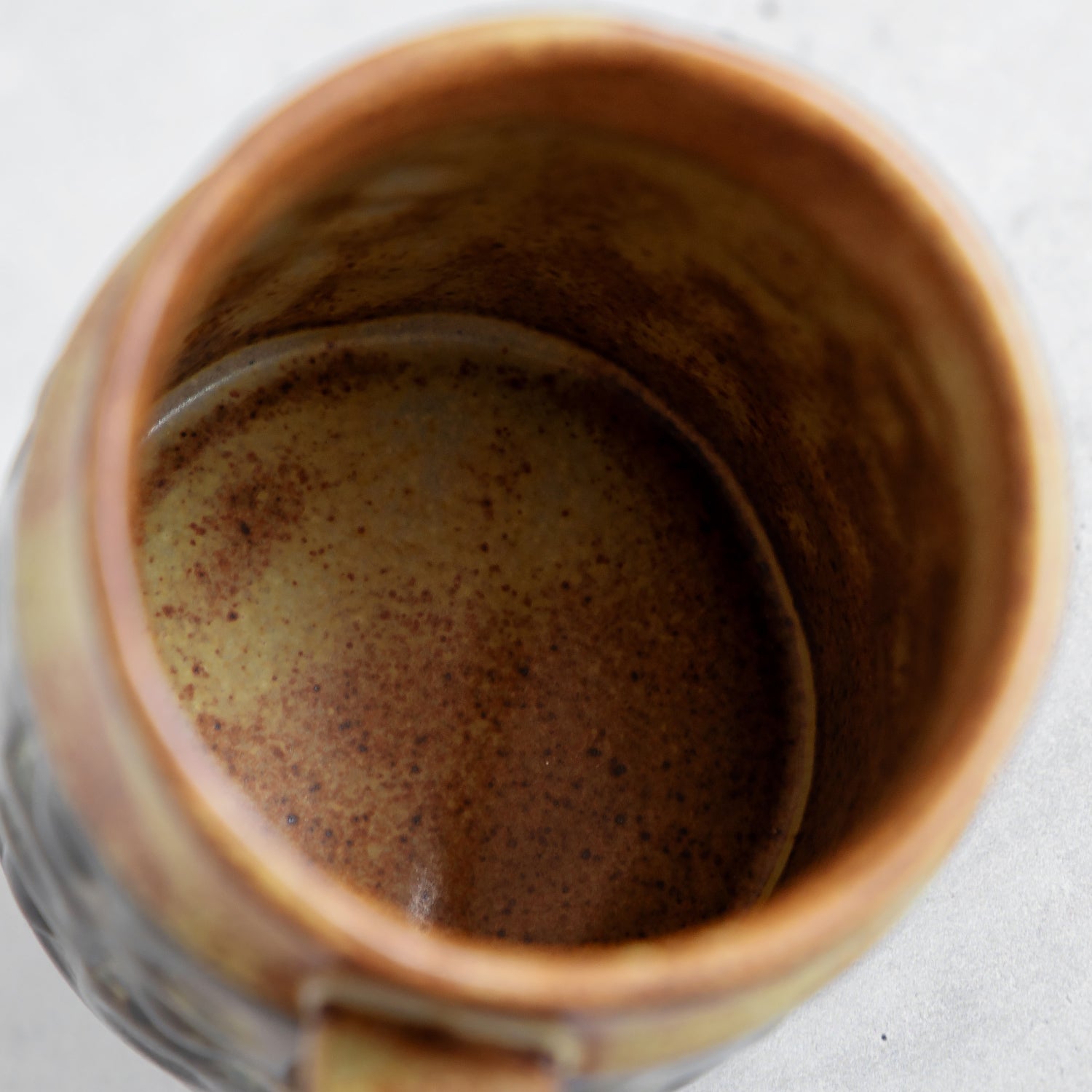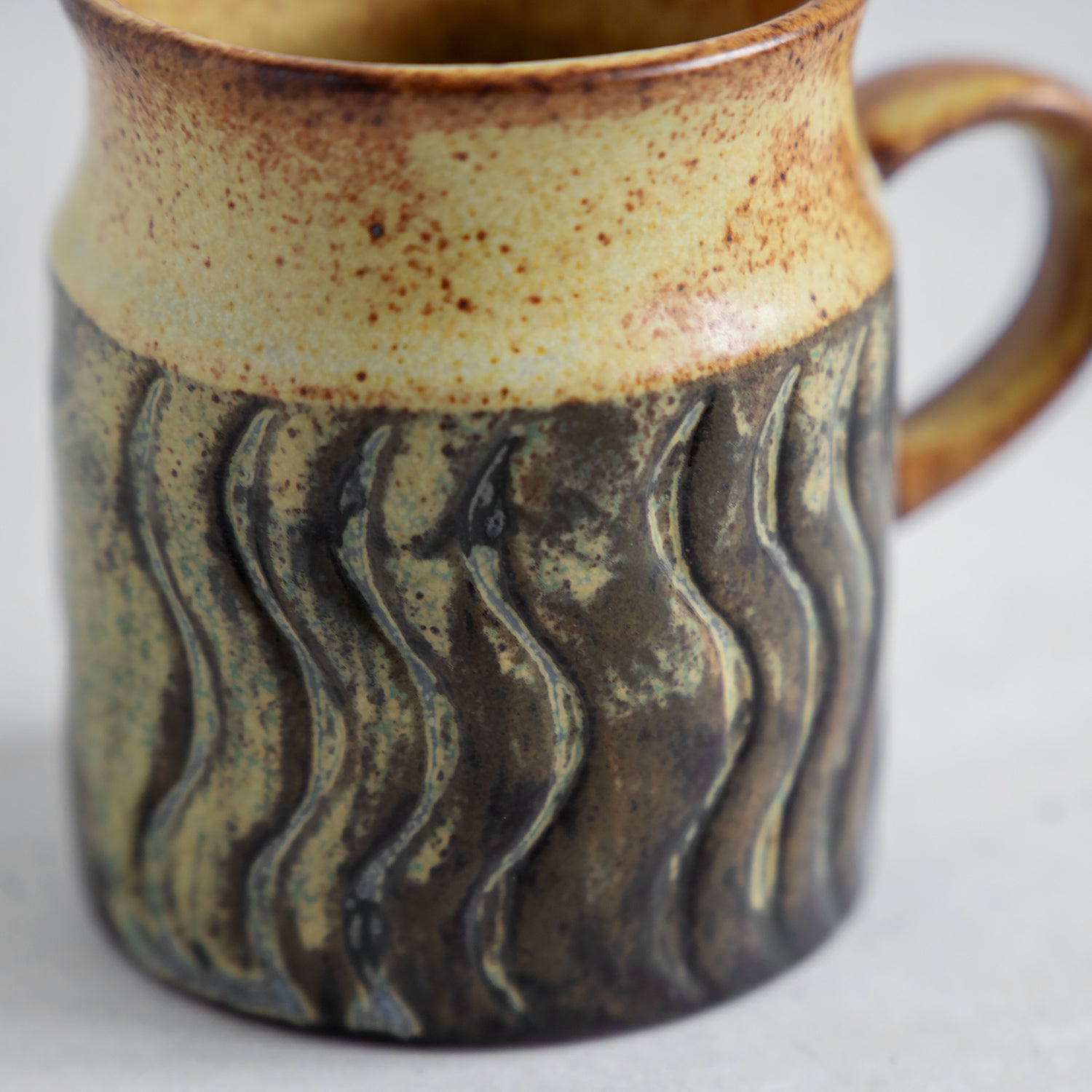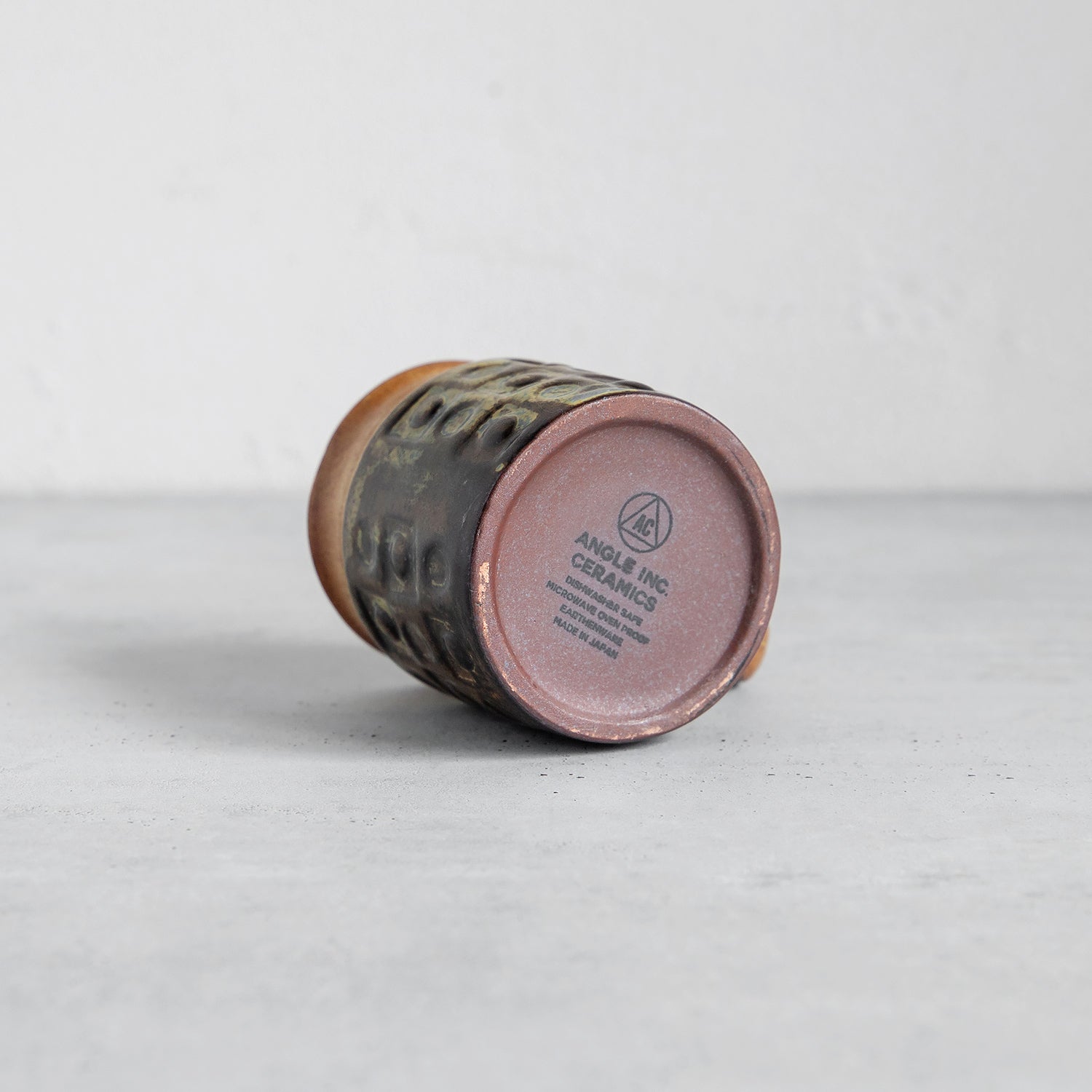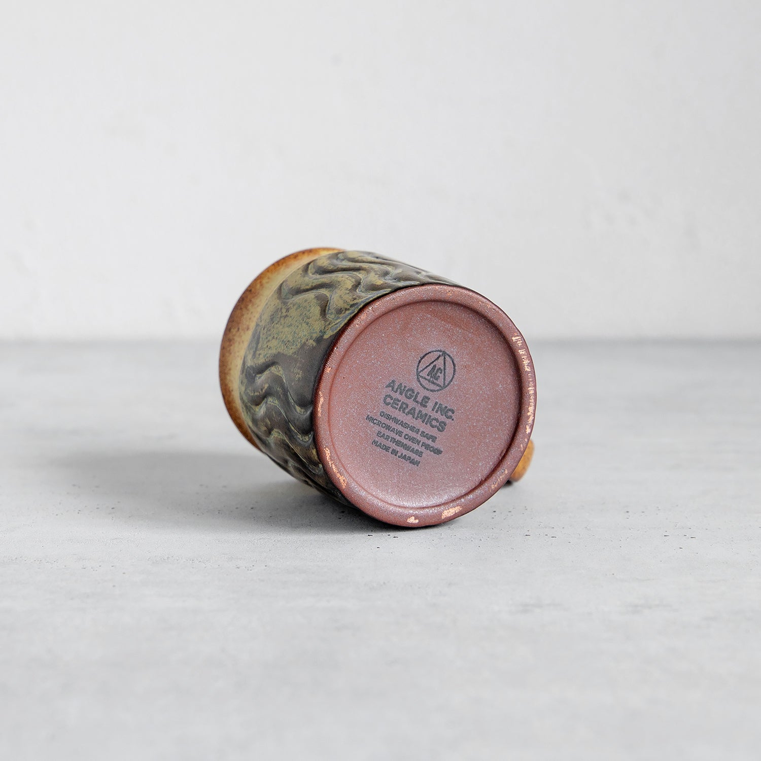 こちらのマグカップは、愛知県・瀬戸で作られた赤土ベースの陶器で、瀬戸焼ならではの温かみと深みのある表情が魅力です。釉薬には複数の色を重ねて使い、濃淡のあるヴィンテージライクな風合いに仕上げています。同じ釉薬・同じデザインでも、一点ずつ模様の出方や色の濃さが異なり、それぞれが唯一無二の個性を持っています。