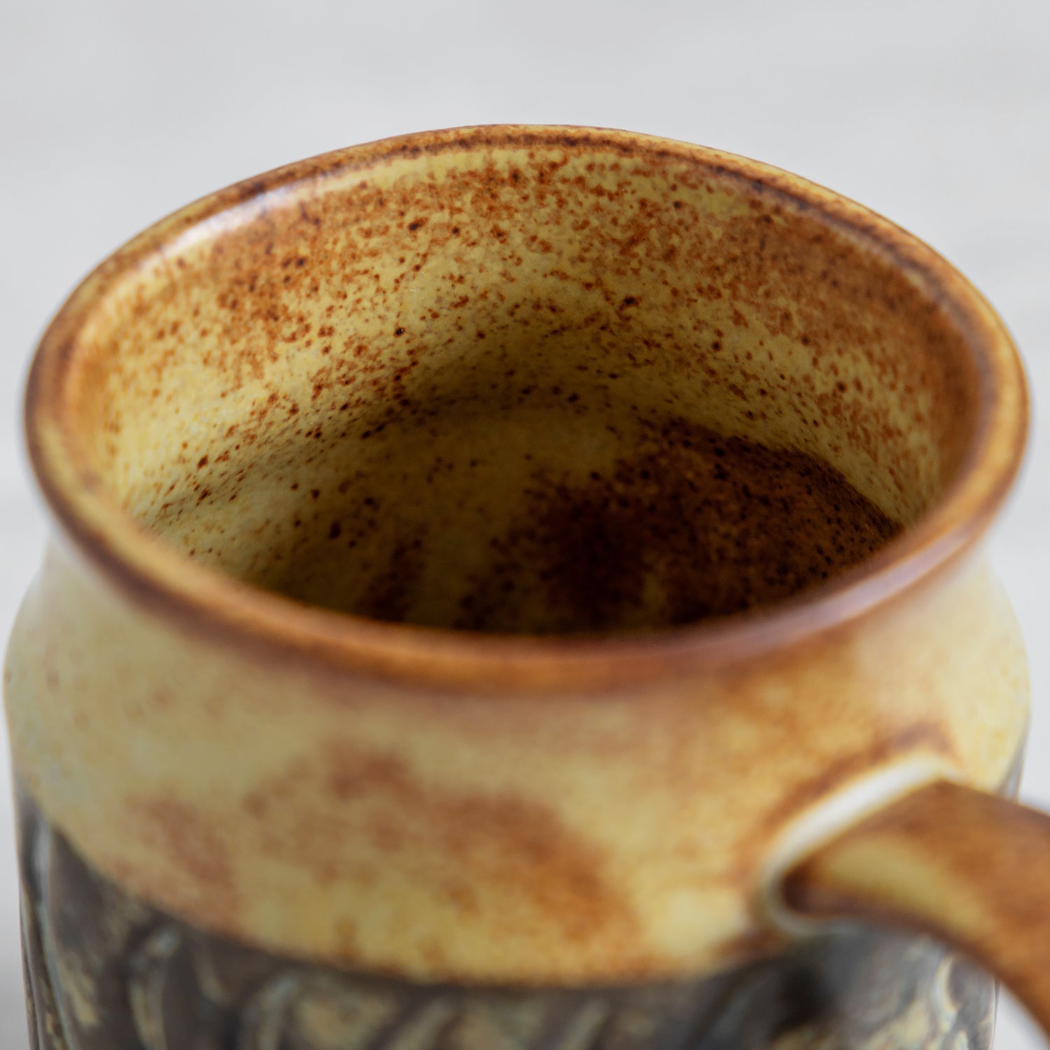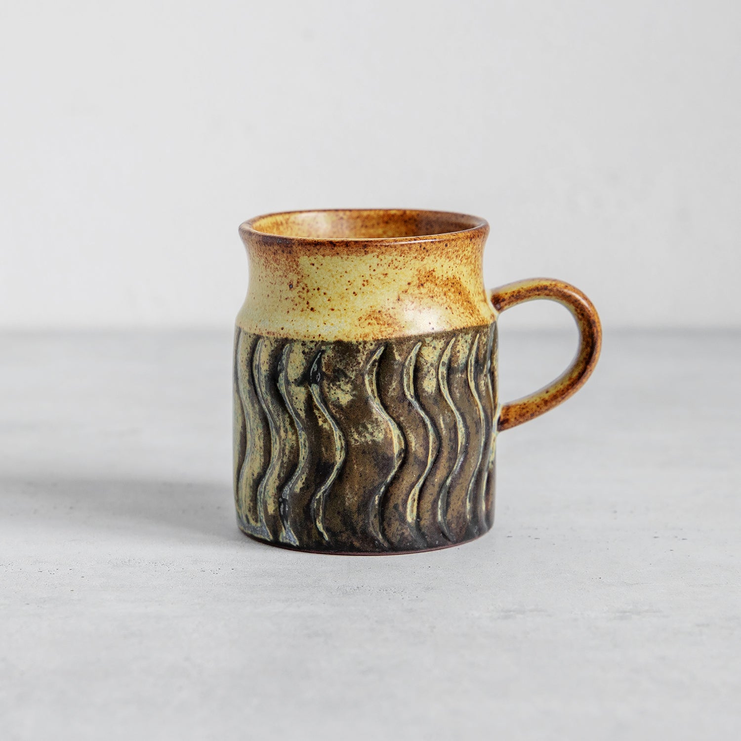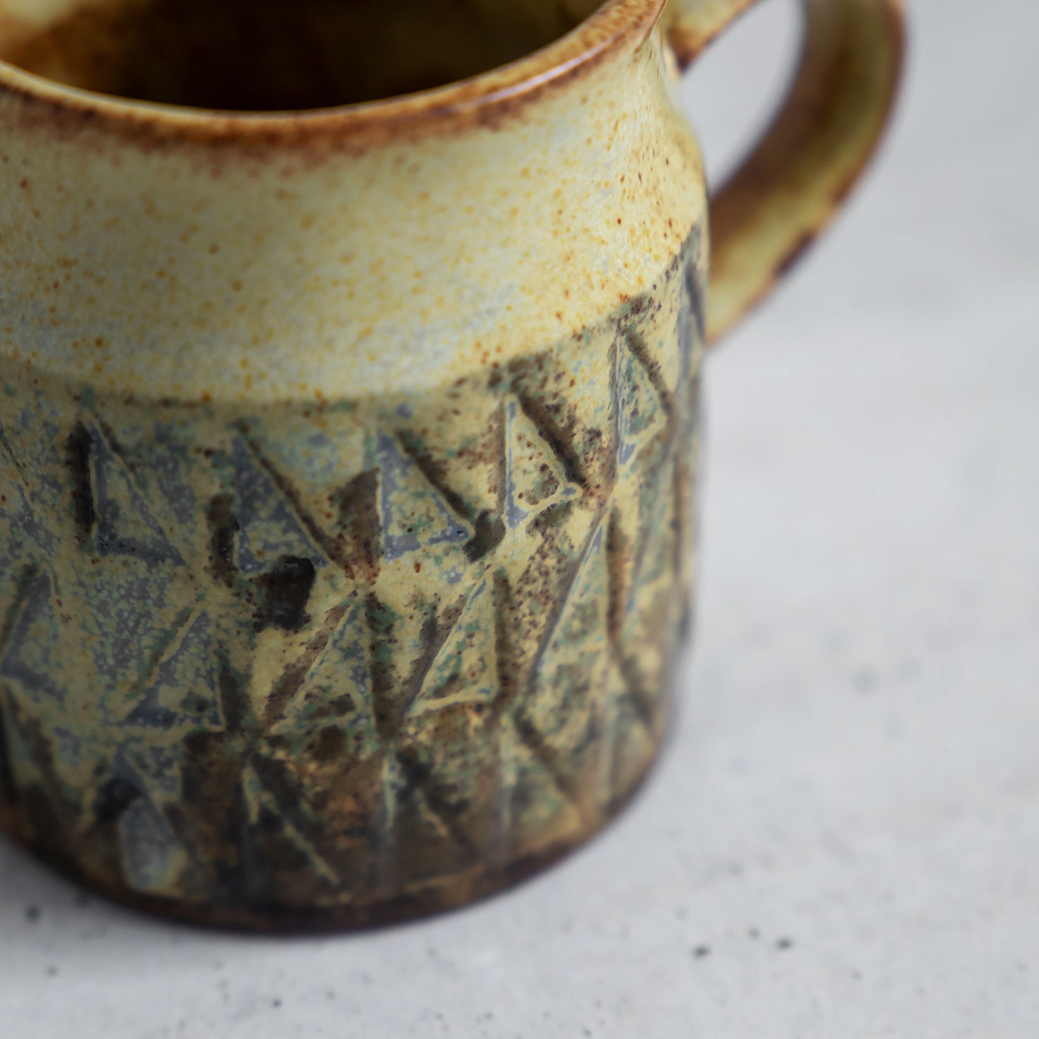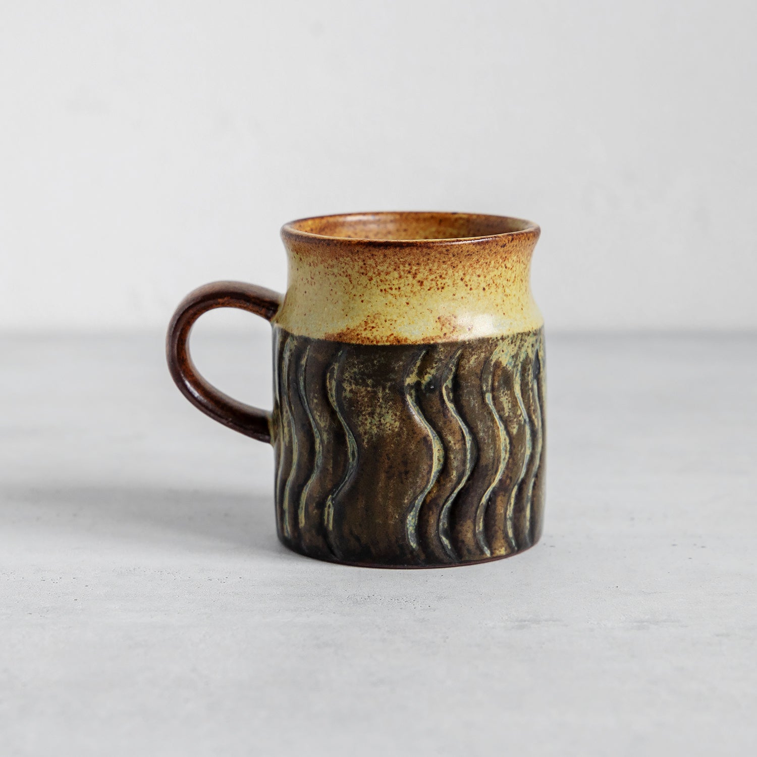 こちらのマグカップは、愛知県・瀬戸で作られた赤土ベースの陶器で、瀬戸焼ならではの温かみと深みのある表情が魅力です。釉薬には複数の色を重ねて使い、濃淡のあるヴィンテージライクな風合いに仕上げています。同じ釉薬・同じデザインでも、一点ずつ模様の出方や色の濃さが異なり、それぞれが唯一無二の個性を持っています。