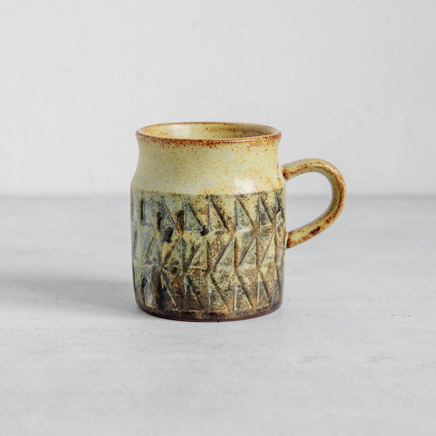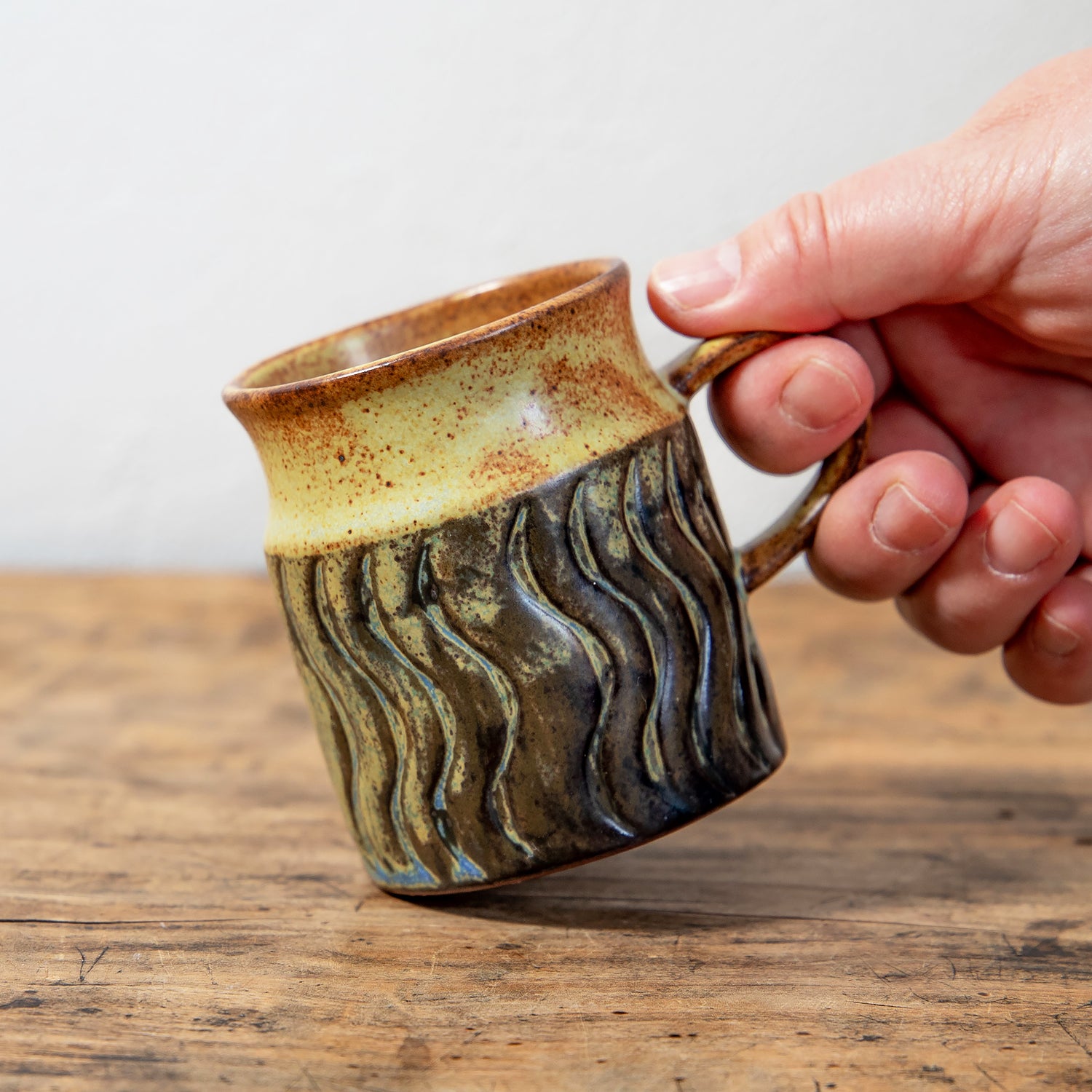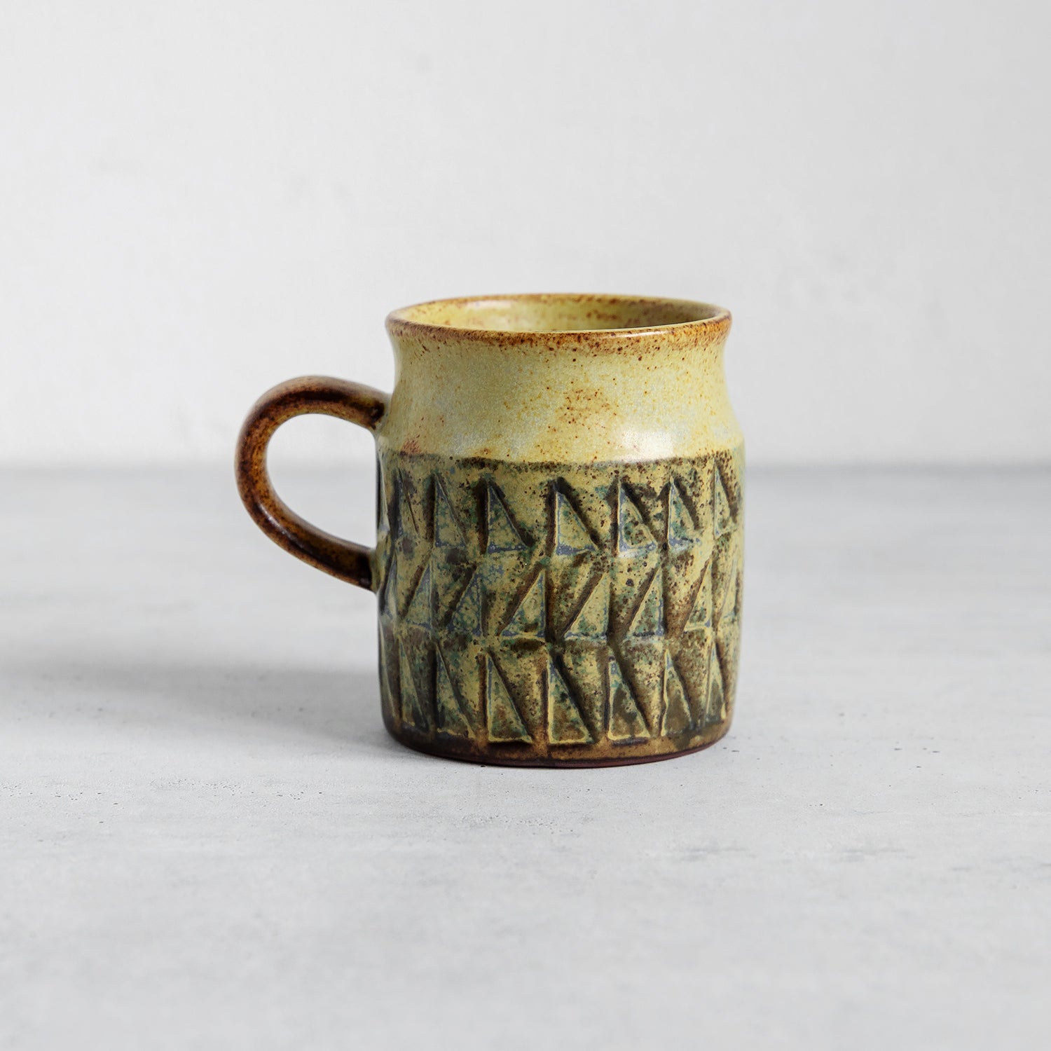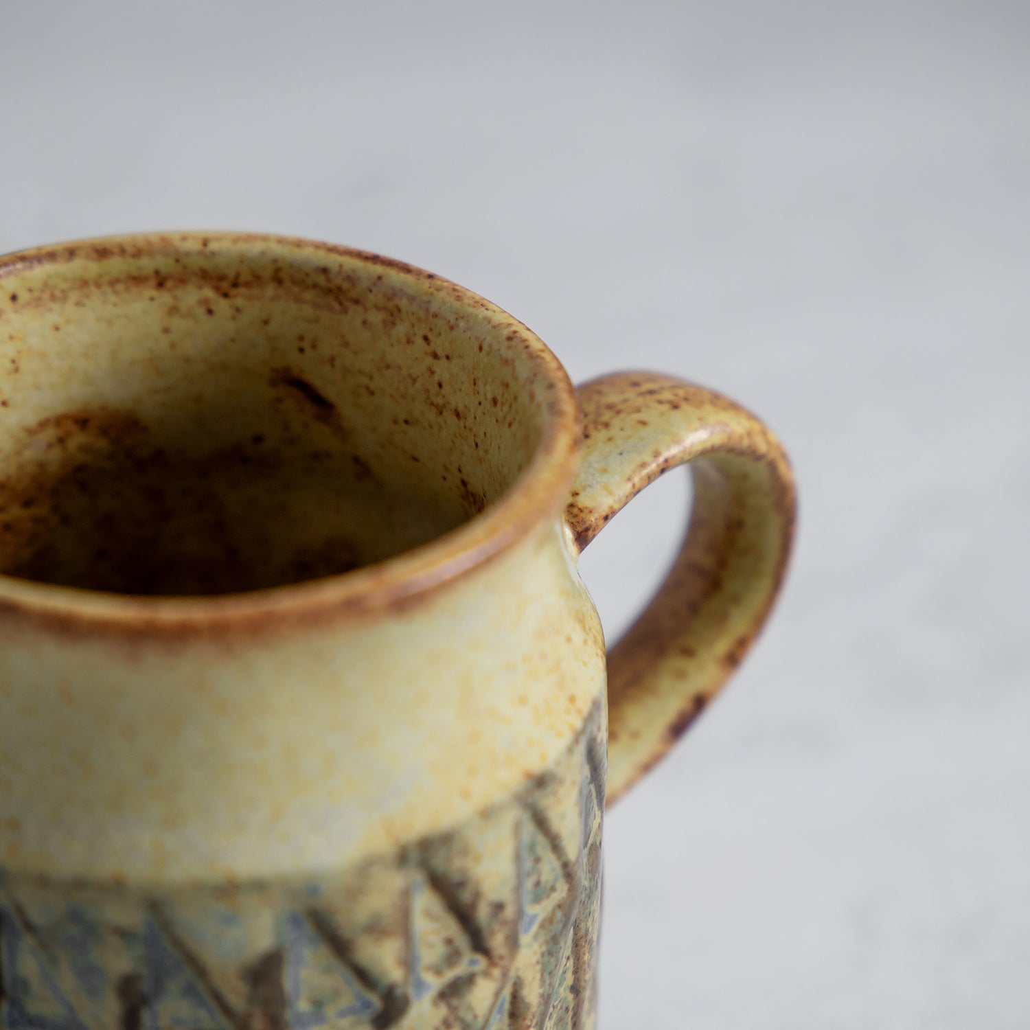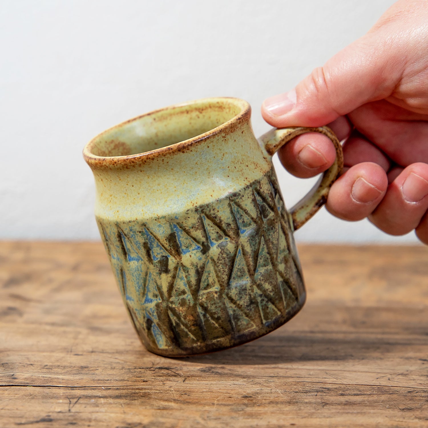 こちらのマグカップは、愛知県・瀬戸で作られた赤土ベースの陶器で、瀬戸焼ならではの温かみと深みのある表情が魅力です。釉薬には複数の色を重ねて使い、濃淡のあるヴィンテージライクな風合いに仕上げています。同じ釉薬・同じデザインでも、一点ずつ模様の出方や色の濃さが異なり、それぞれが唯一無二の個性を持っています。