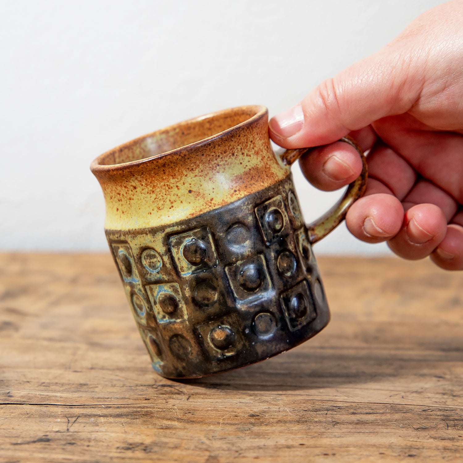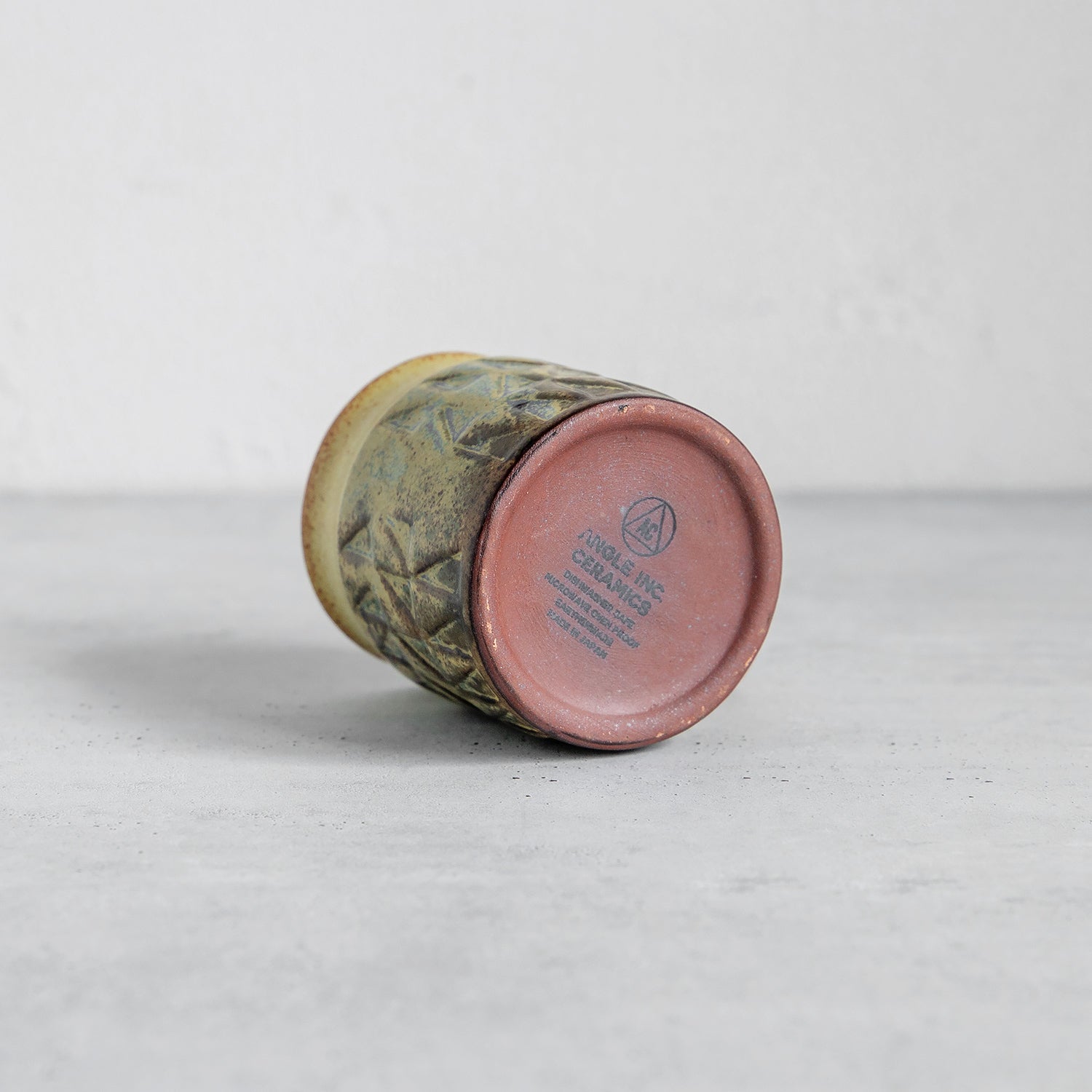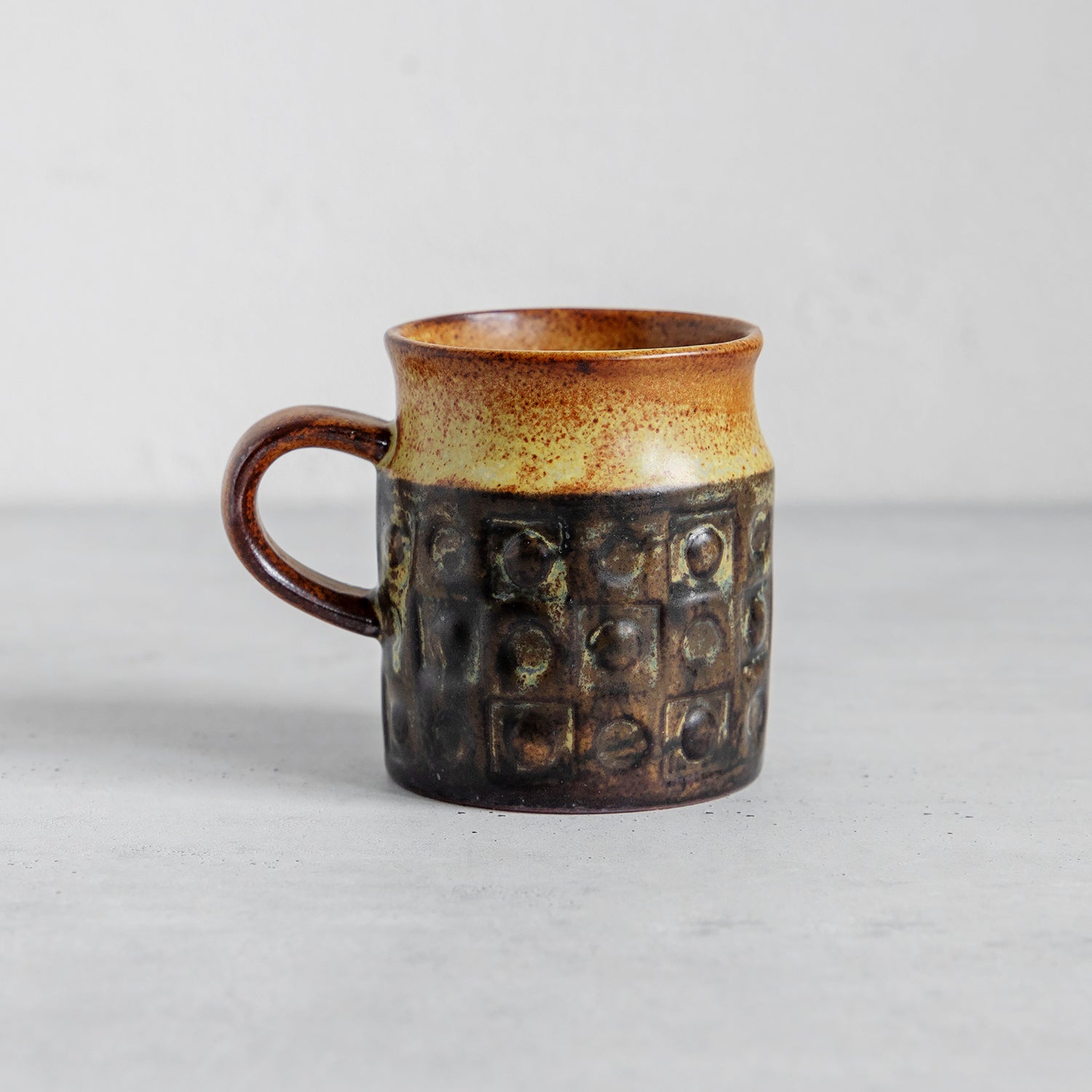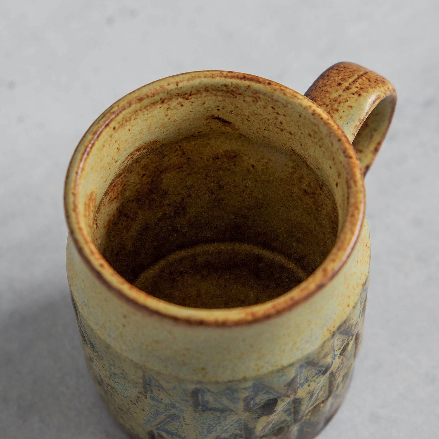 こちらのマグカップは、愛知県・瀬戸で作られた赤土ベースの陶器で、瀬戸焼ならではの温かみと深みのある表情が魅力です。釉薬には複数の色を重ねて使い、濃淡のあるヴィンテージライクな風合いに仕上げています。同じ釉薬・同じデザインでも、一点ずつ模様の出方や色の濃さが異なり、それぞれが唯一無二の個性を持っています。