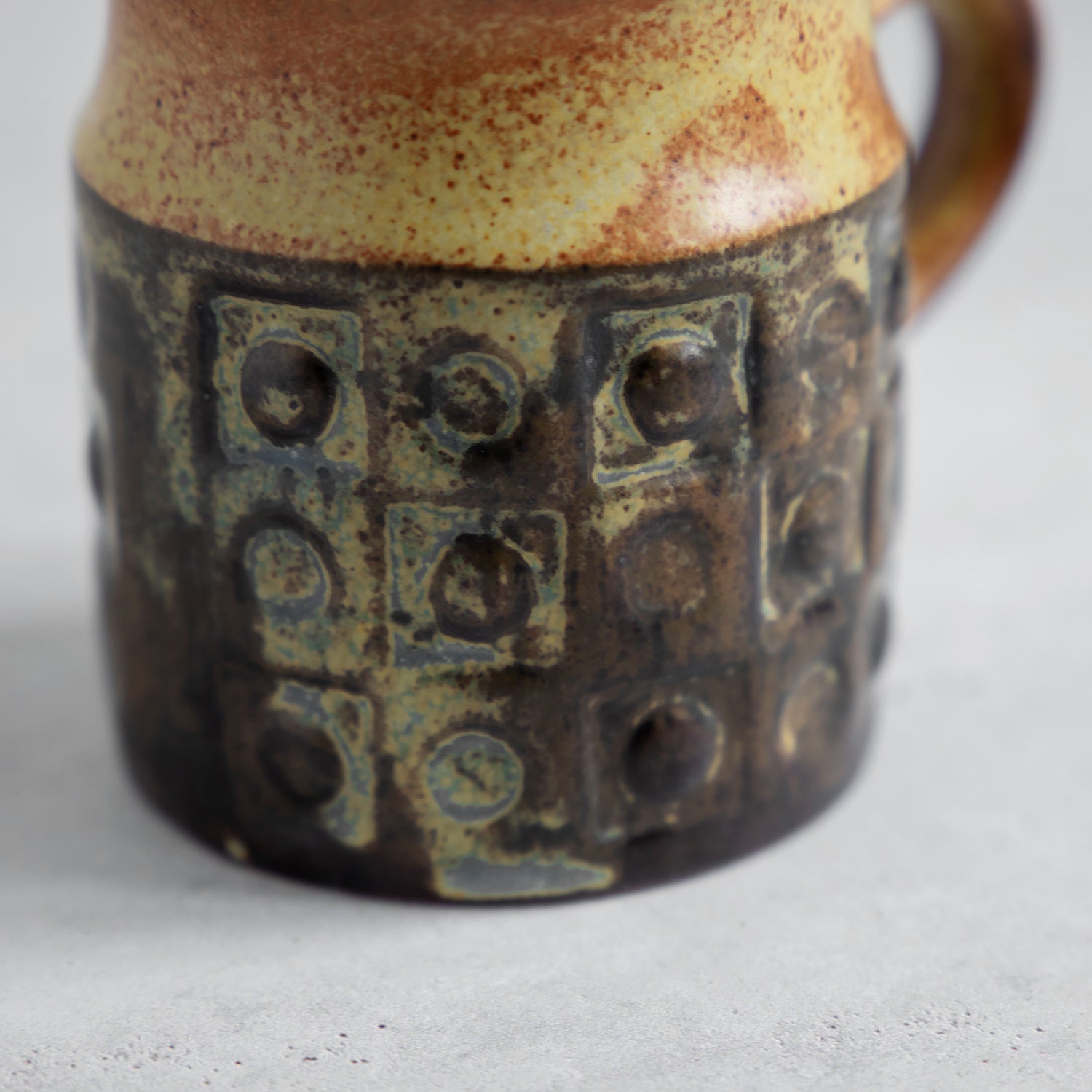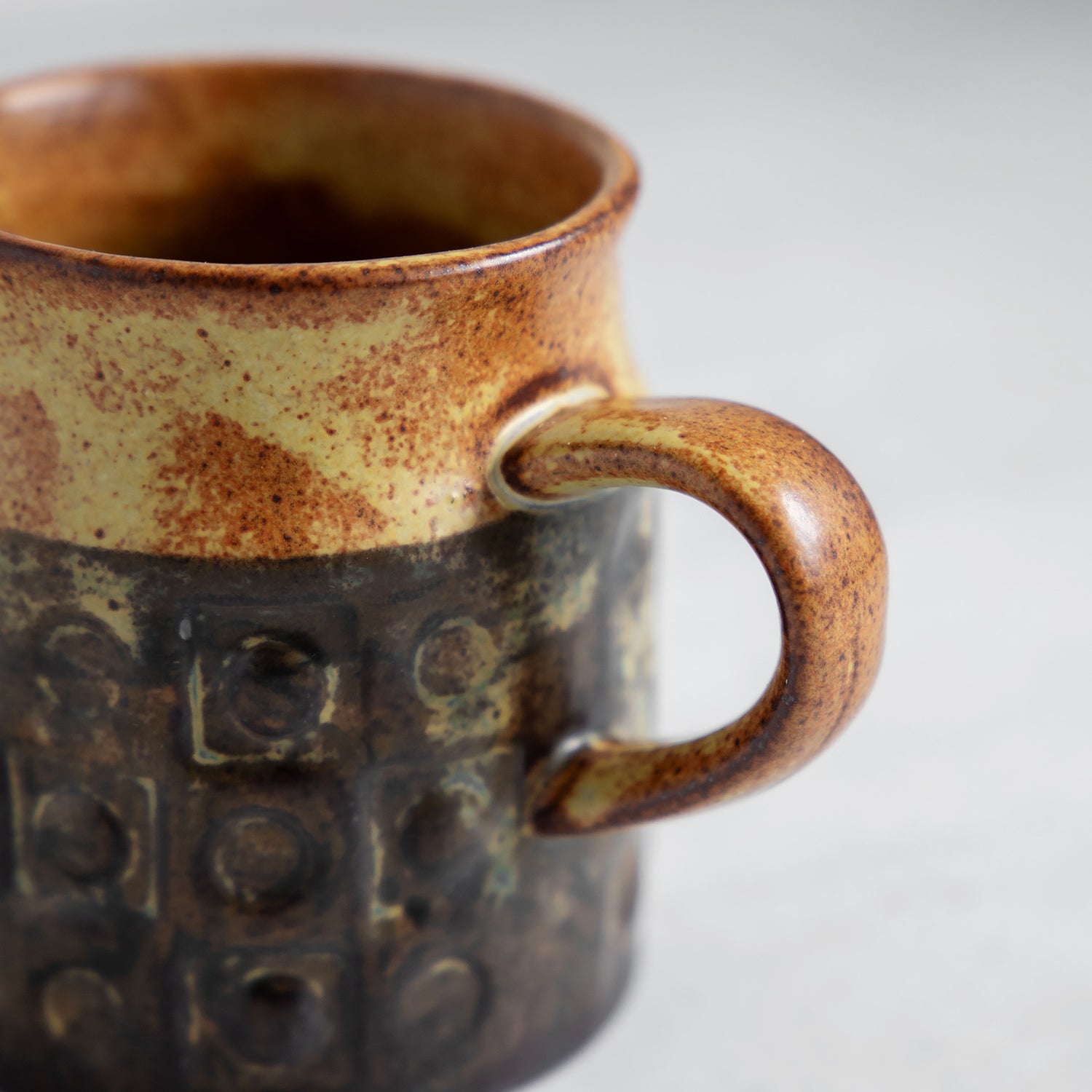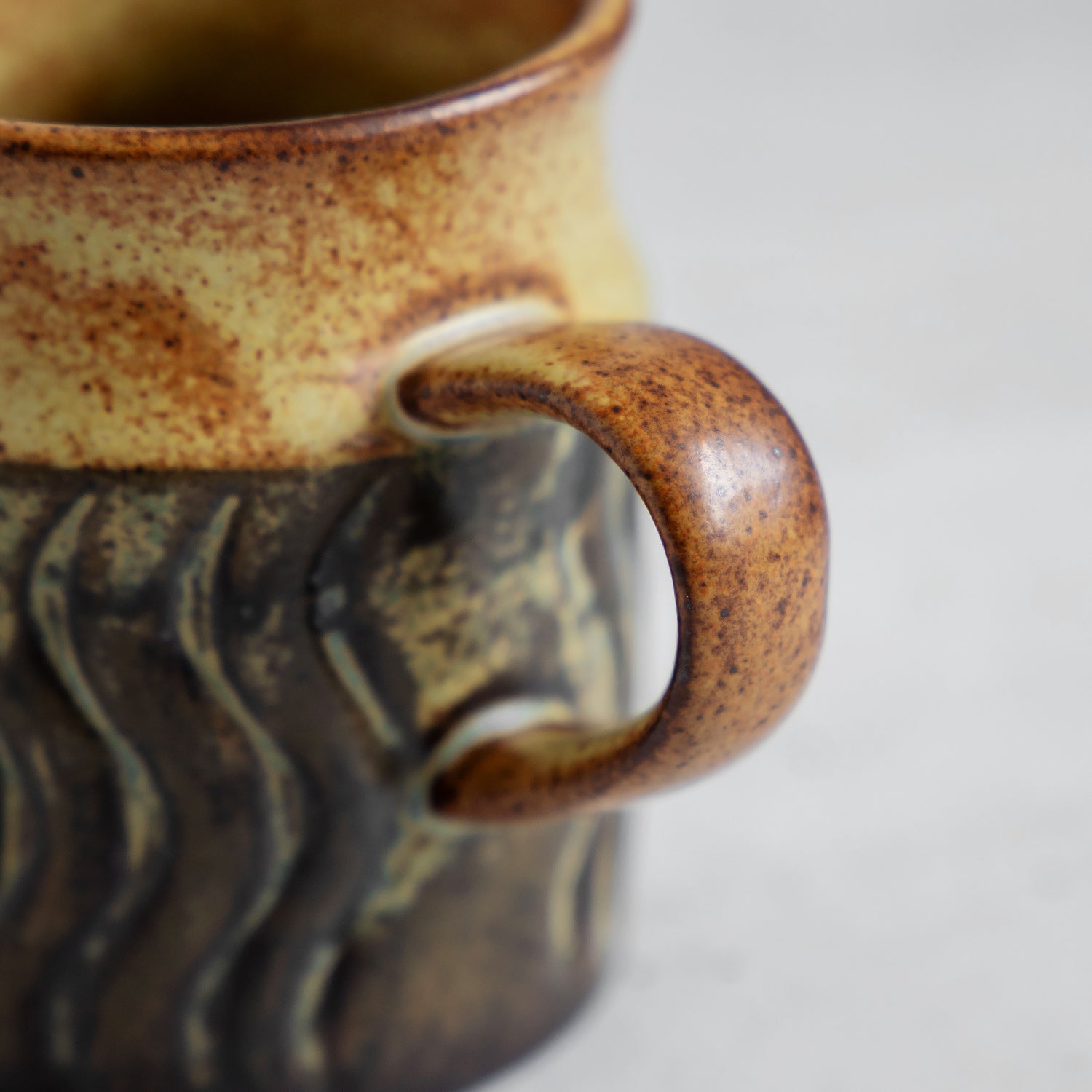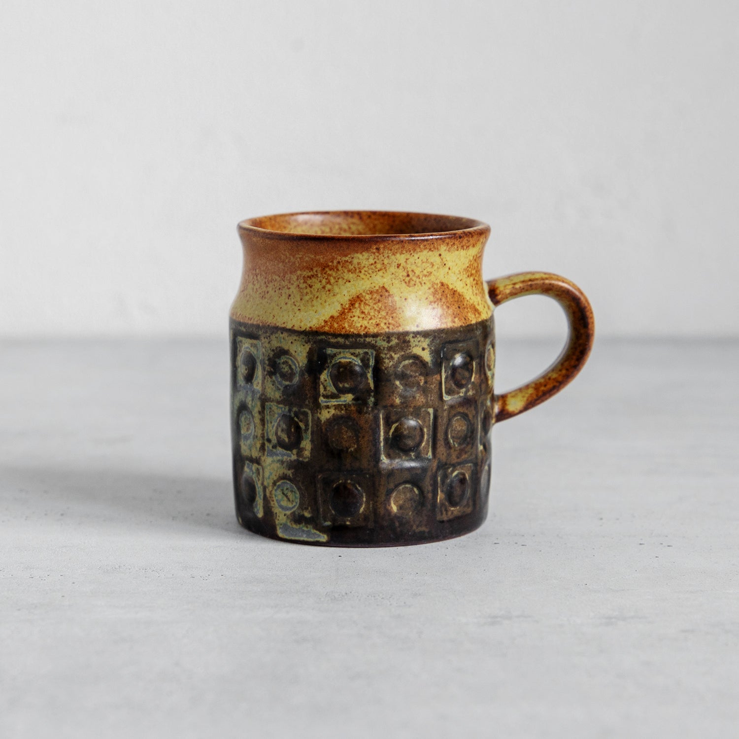 こちらのマグカップは、愛知県・瀬戸で作られた赤土ベースの陶器で、瀬戸焼ならではの温かみと深みのある表情が魅力です。釉薬には複数の色を重ねて使い、濃淡のあるヴィンテージライクな風合いに仕上げています。同じ釉薬・同じデザインでも、一点ずつ模様の出方や色の濃さが異なり、それぞれが唯一無二の個性を持っています。