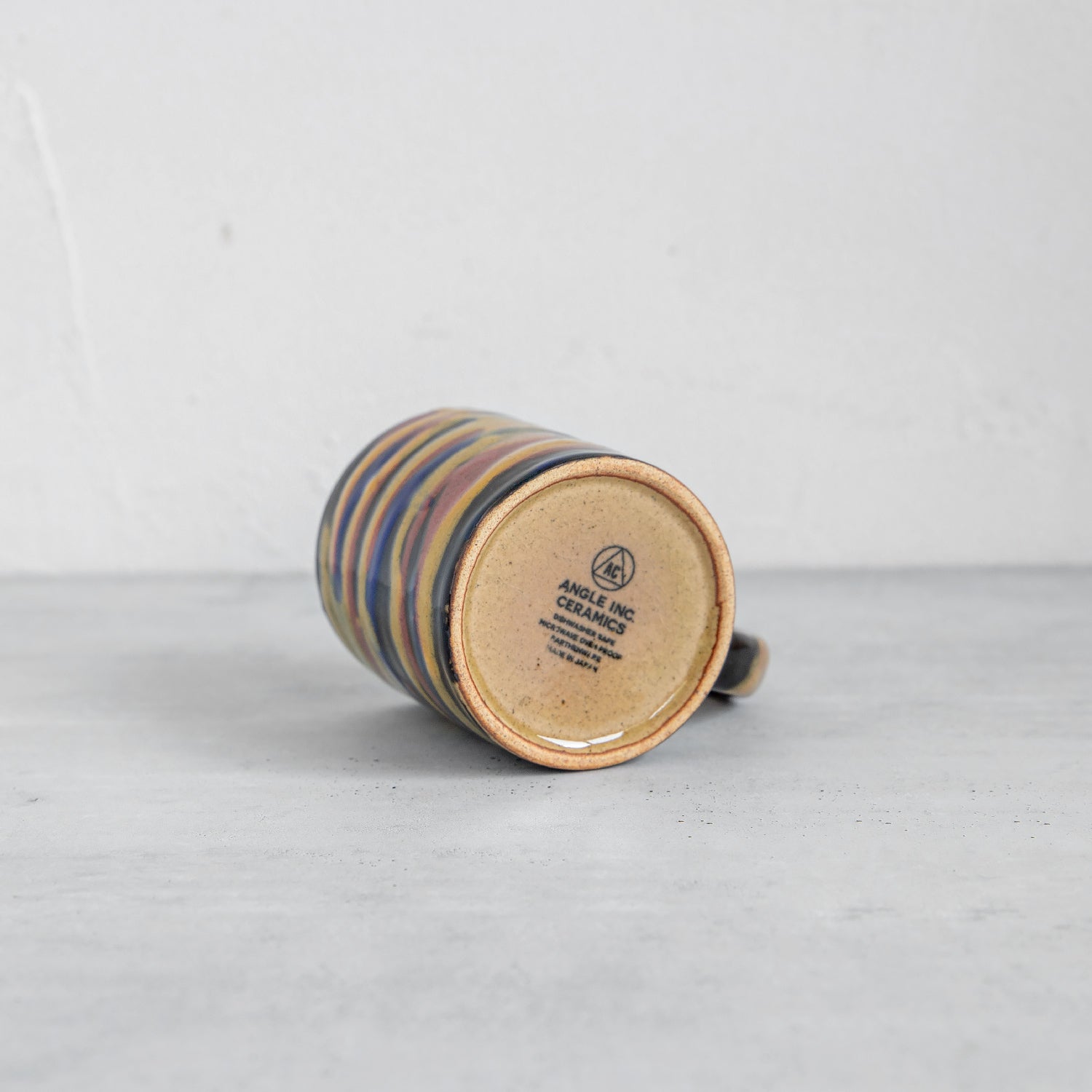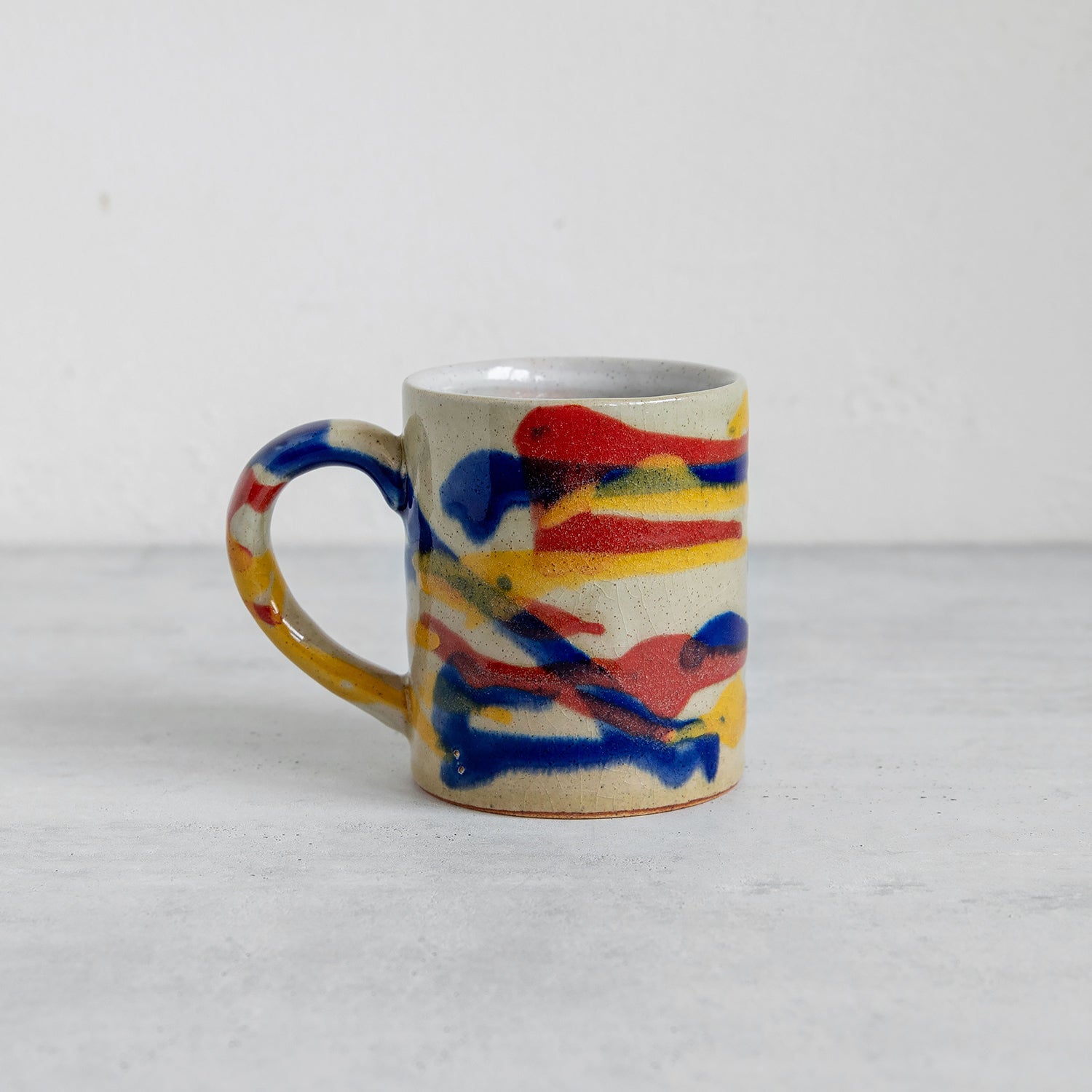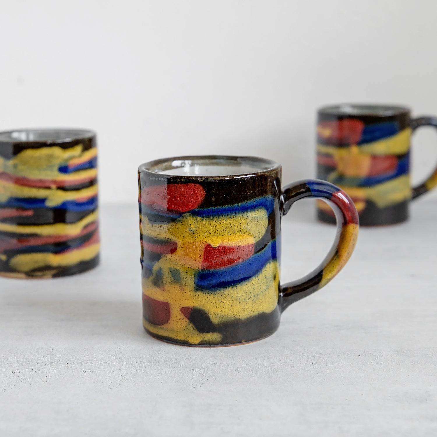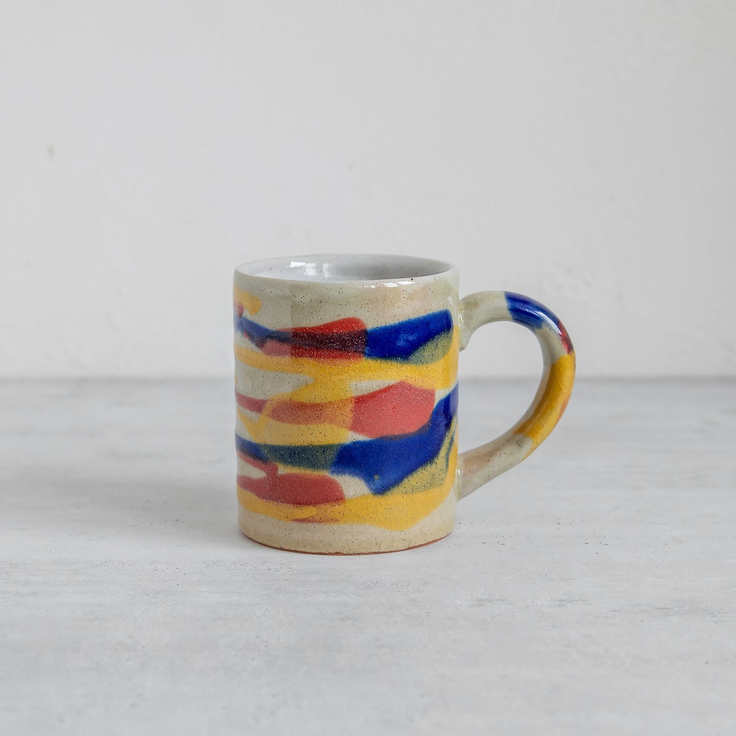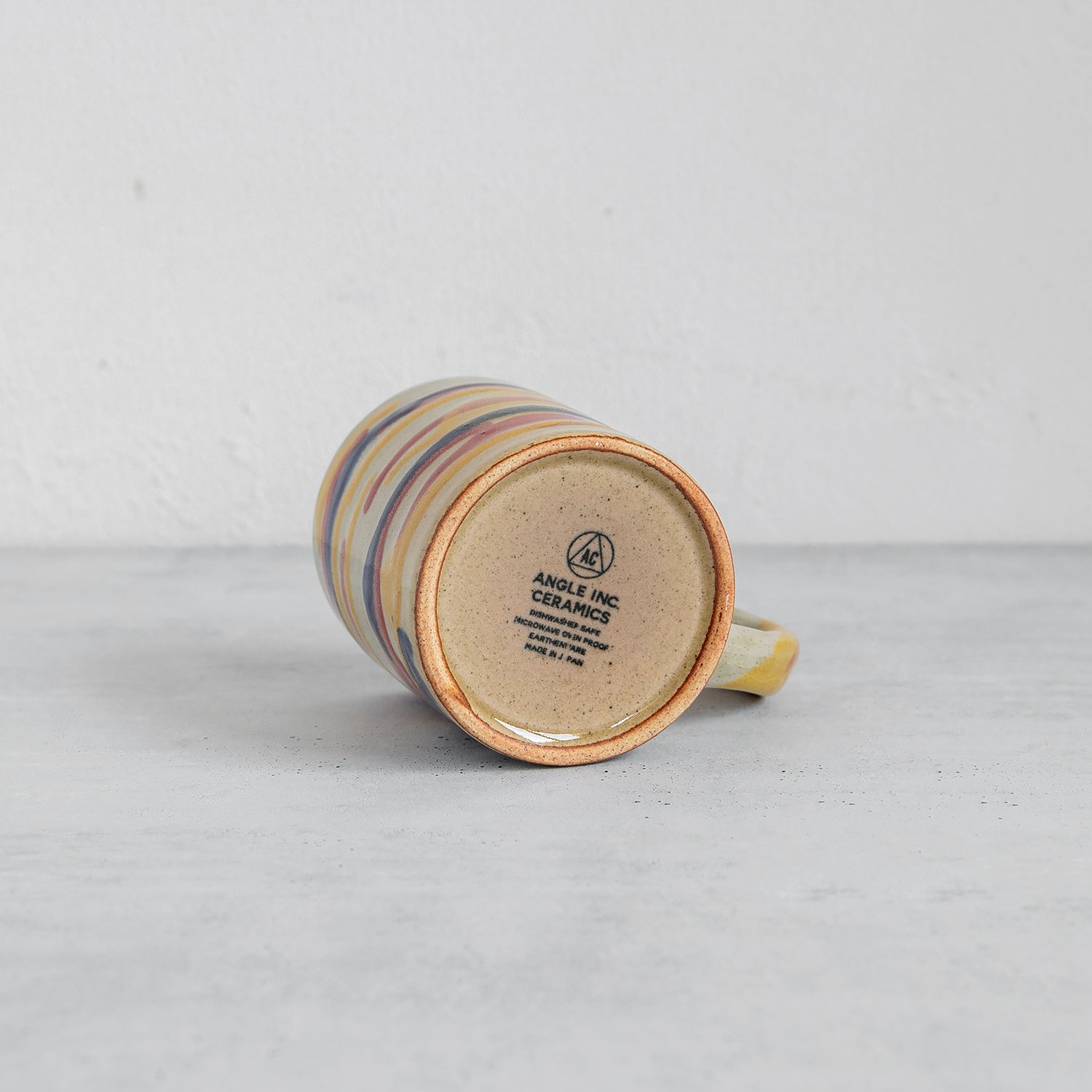 このマグカップは、日本の職人さんの手によって、1色ずつ丁寧に釉薬が塗り重ねられています。3色の釉薬が自由に交わり、偶然に生まれる色の重なり。その上を指先でなぞると、ぽこぽことした釉薬の凹凸があり、プリントでは決して表せない、奥行きある表情に出会えます。