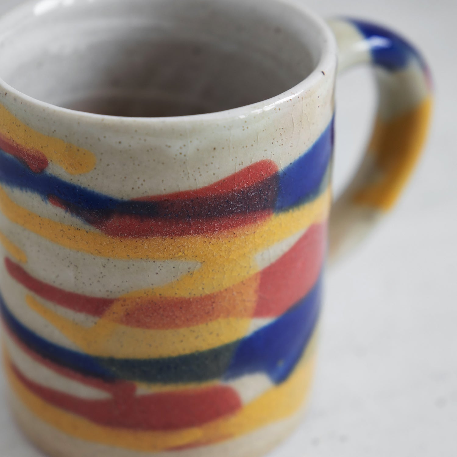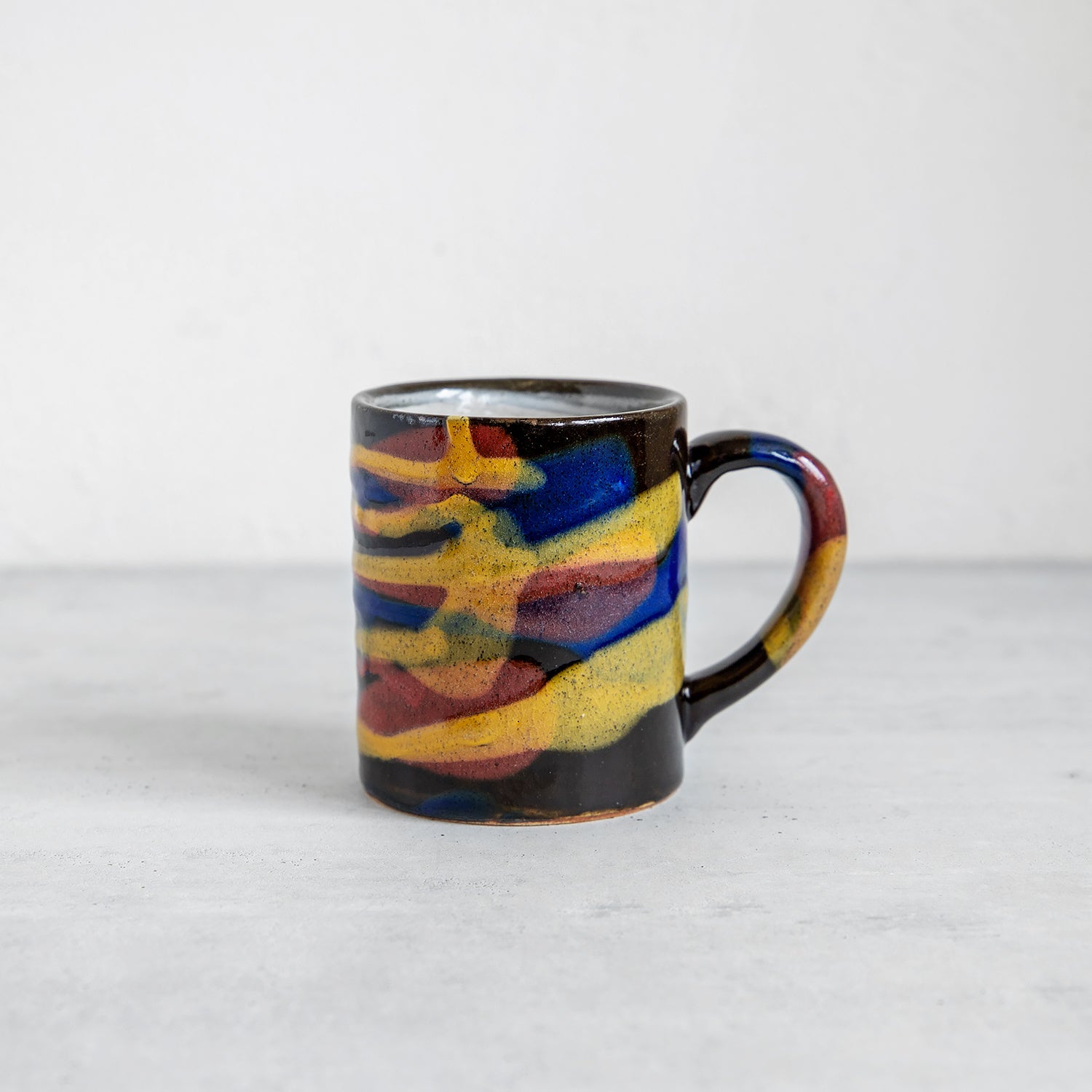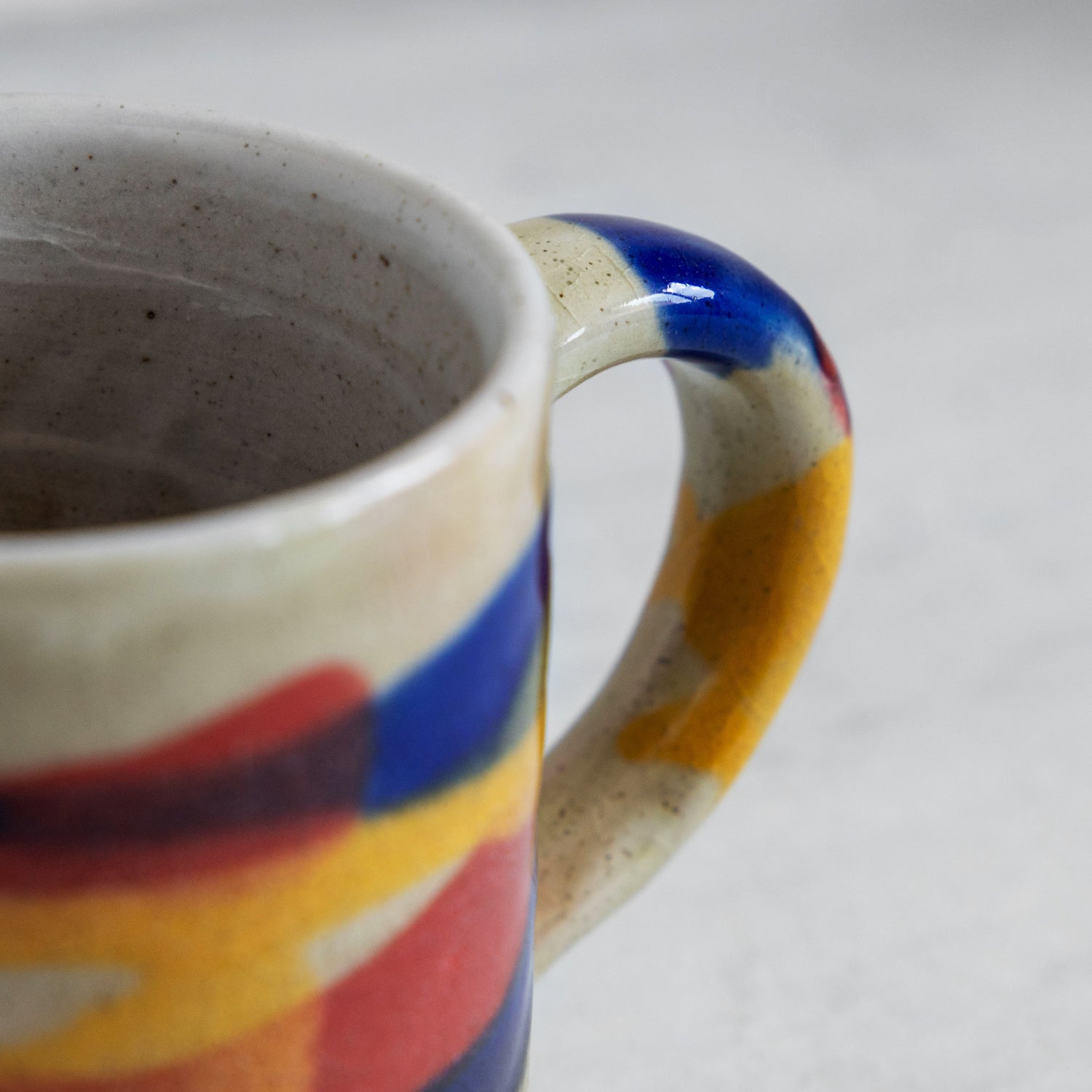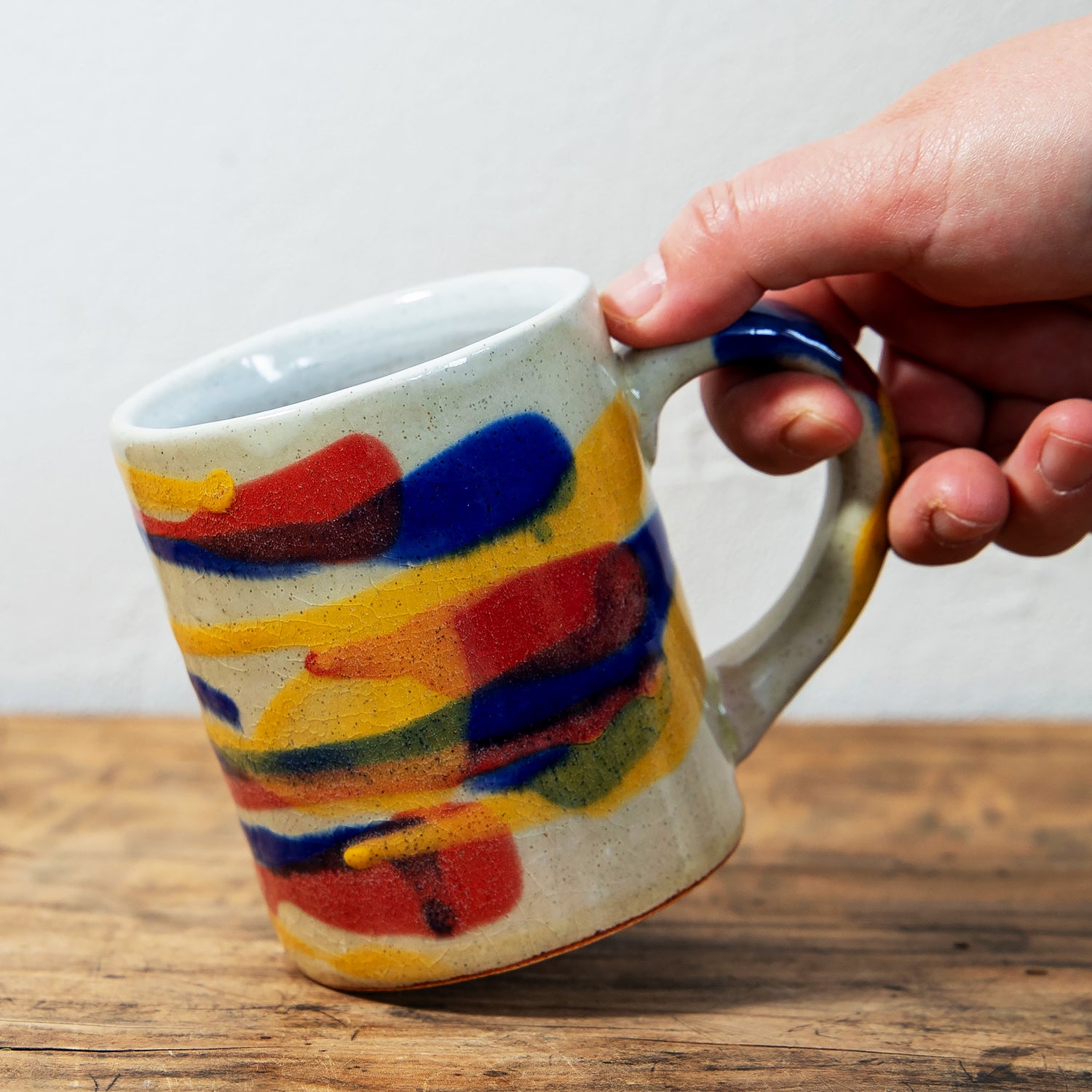 このマグカップは、日本の職人さんの手によって、1色ずつ丁寧に釉薬が塗り重ねられています。3色の釉薬が自由に交わり、偶然に生まれる色の重なり。その上を指先でなぞると、ぽこぽことした釉薬の凹凸があり、プリントでは決して表せない、奥行きある表情に出会えます。