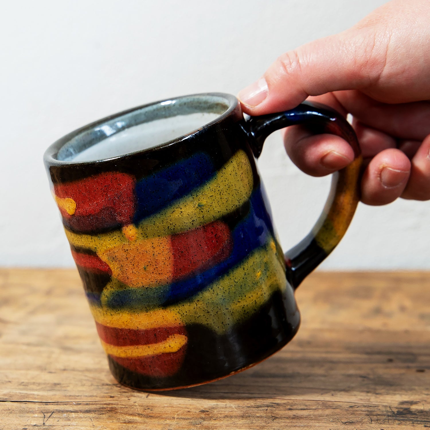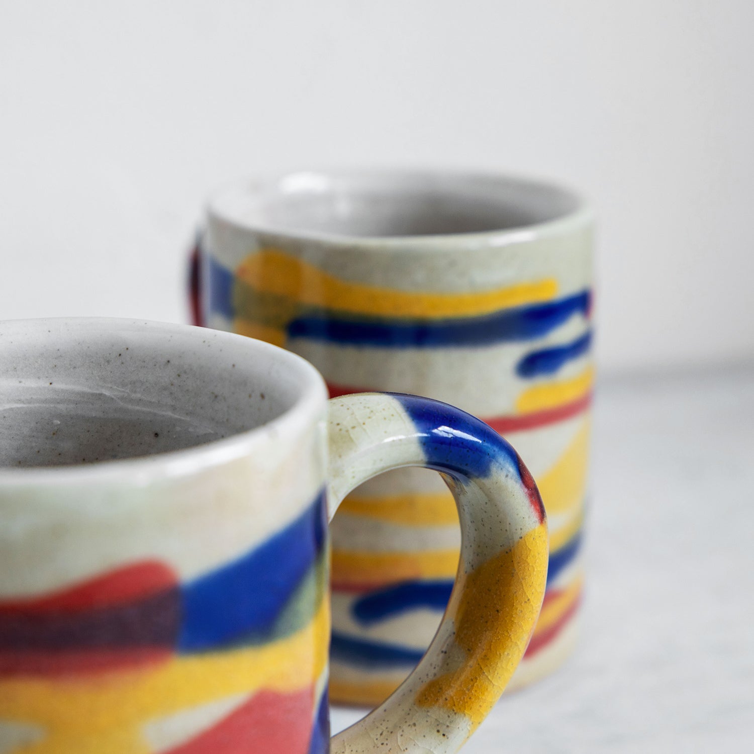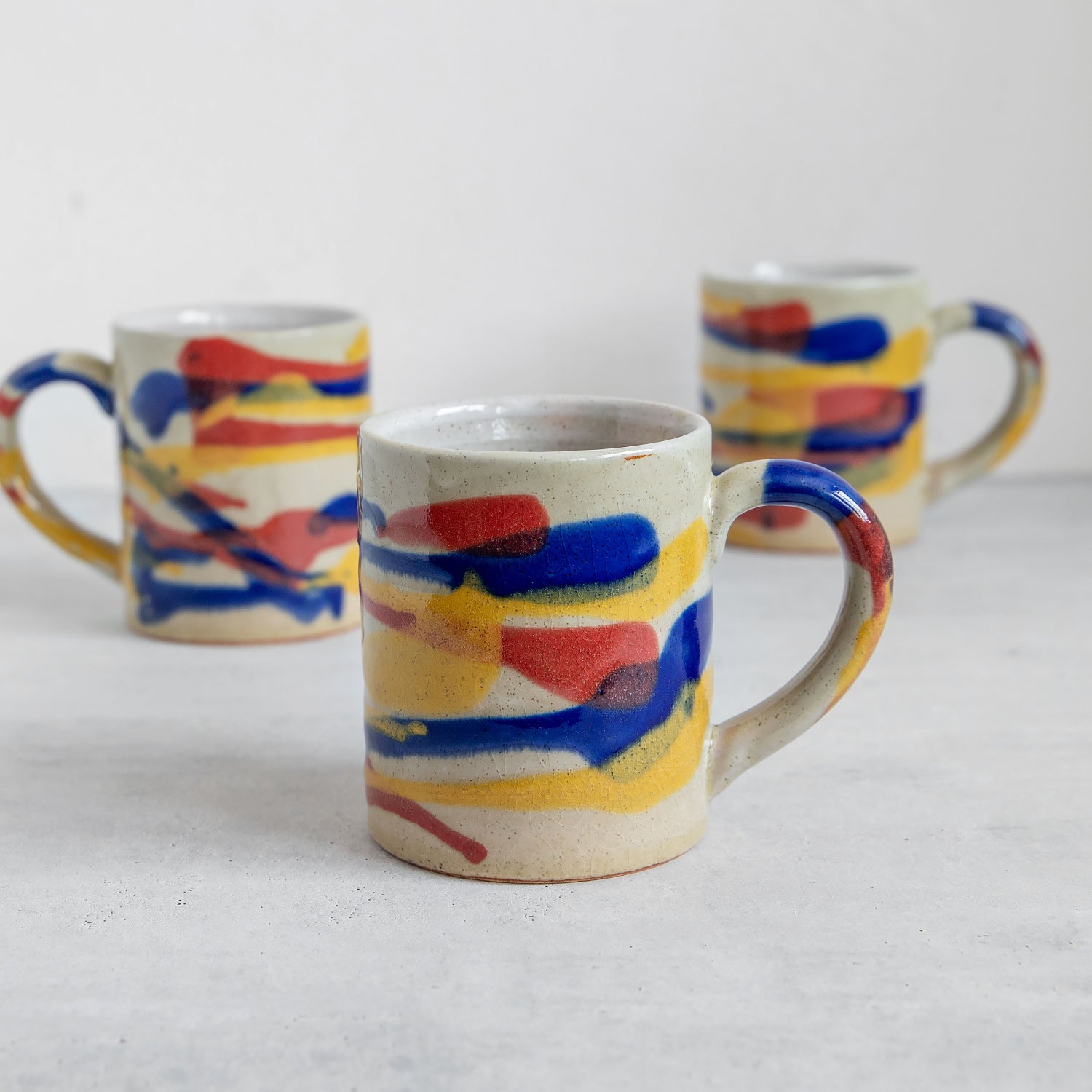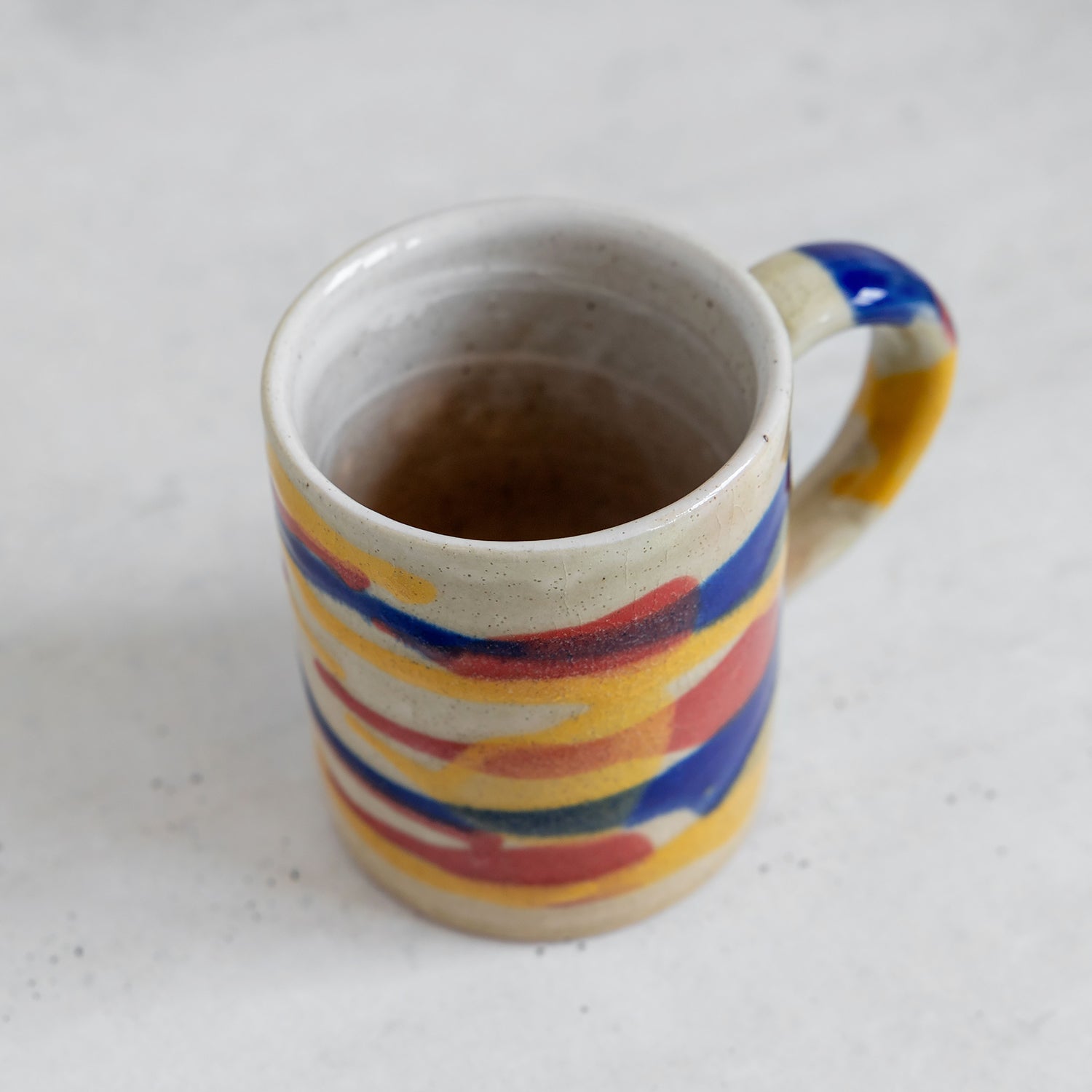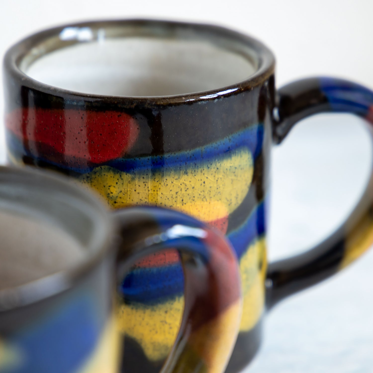 このマグカップは、日本の職人さんの手によって、1色ずつ丁寧に釉薬が塗り重ねられています。3色の釉薬が自由に交わり、偶然に生まれる色の重なり。その上を指先でなぞると、ぽこぽことした釉薬の凹凸があり、プリントでは決して表せない、奥行きある表情に出会えます。