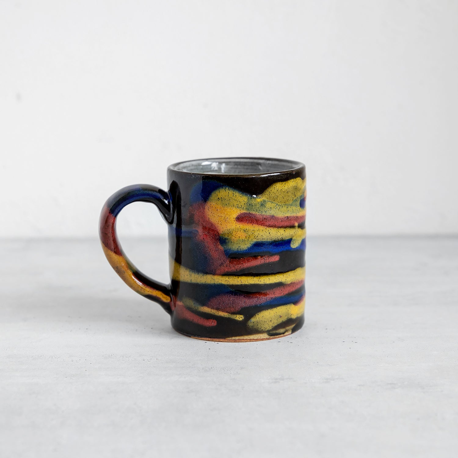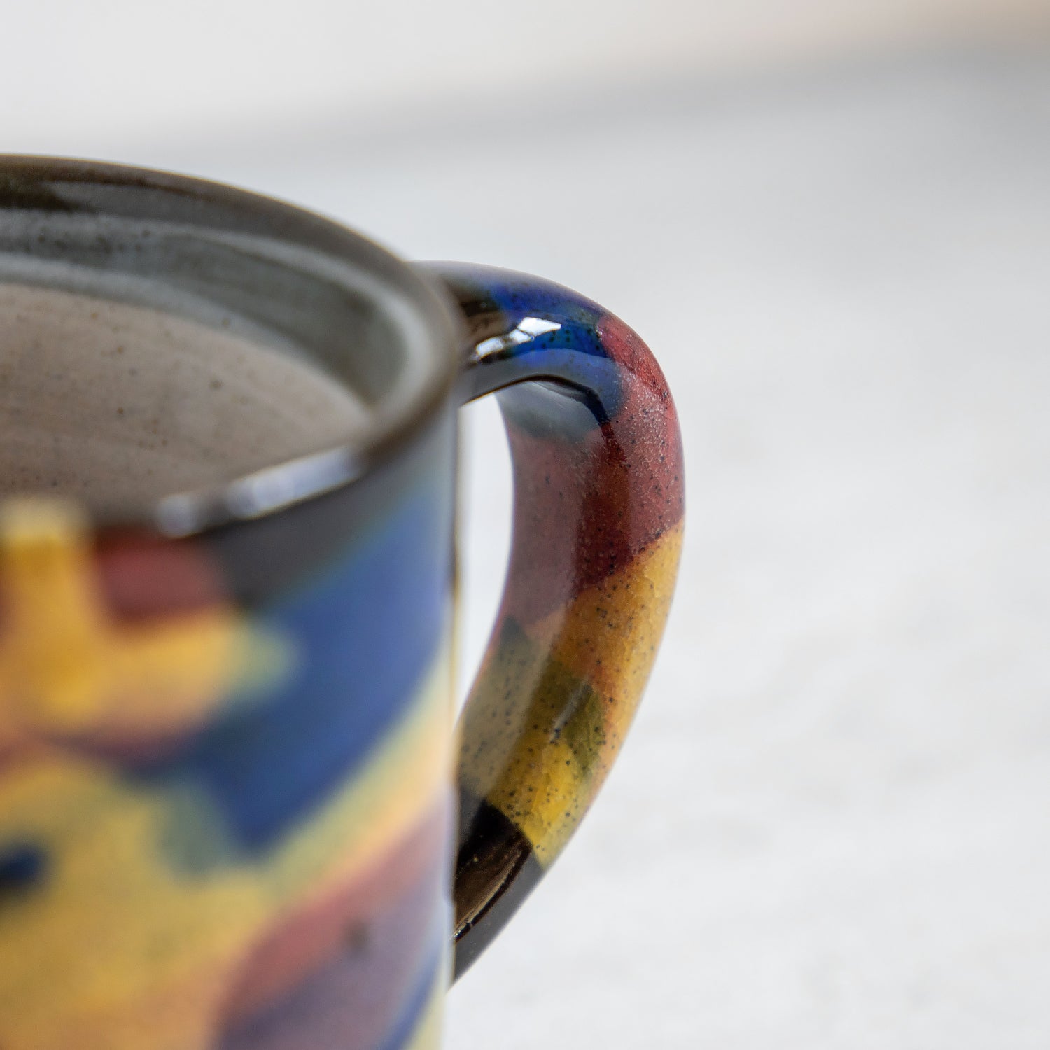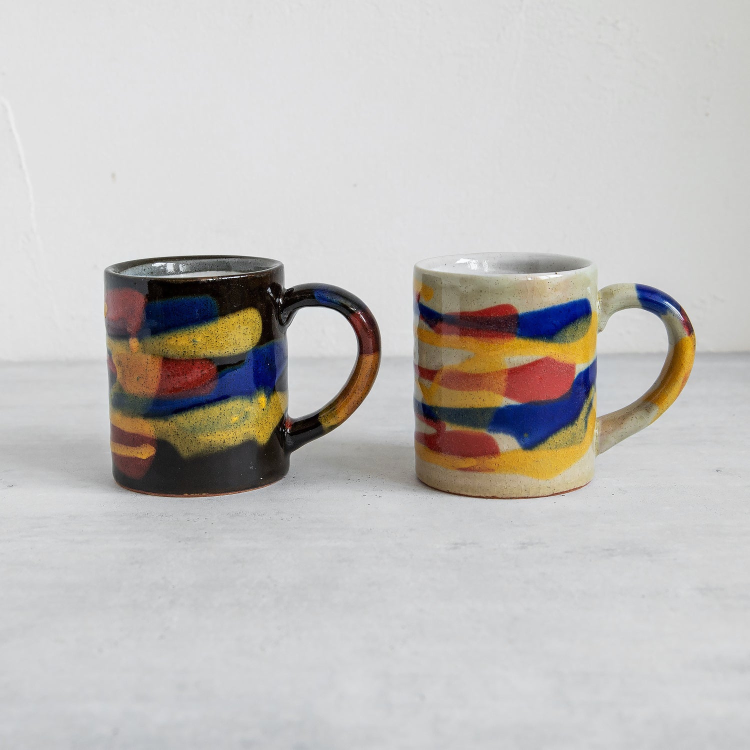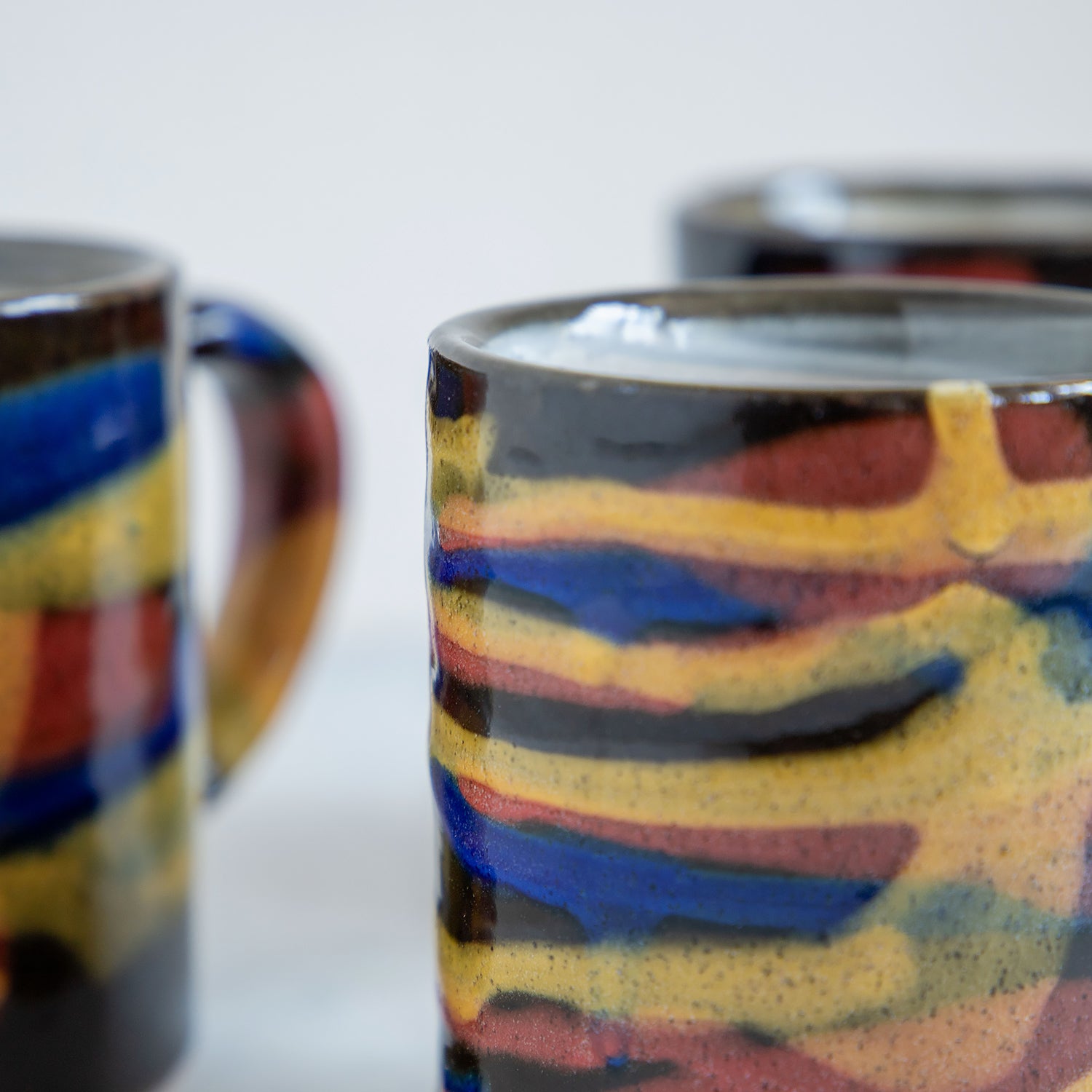 このマグカップは、日本の職人さんの手によって、1色ずつ丁寧に釉薬が塗り重ねられています。3色の釉薬が自由に交わり、偶然に生まれる色の重なり。その上を指先でなぞると、ぽこぽことした釉薬の凹凸があり、プリントでは決して表せない、奥行きある表情に出会えます。