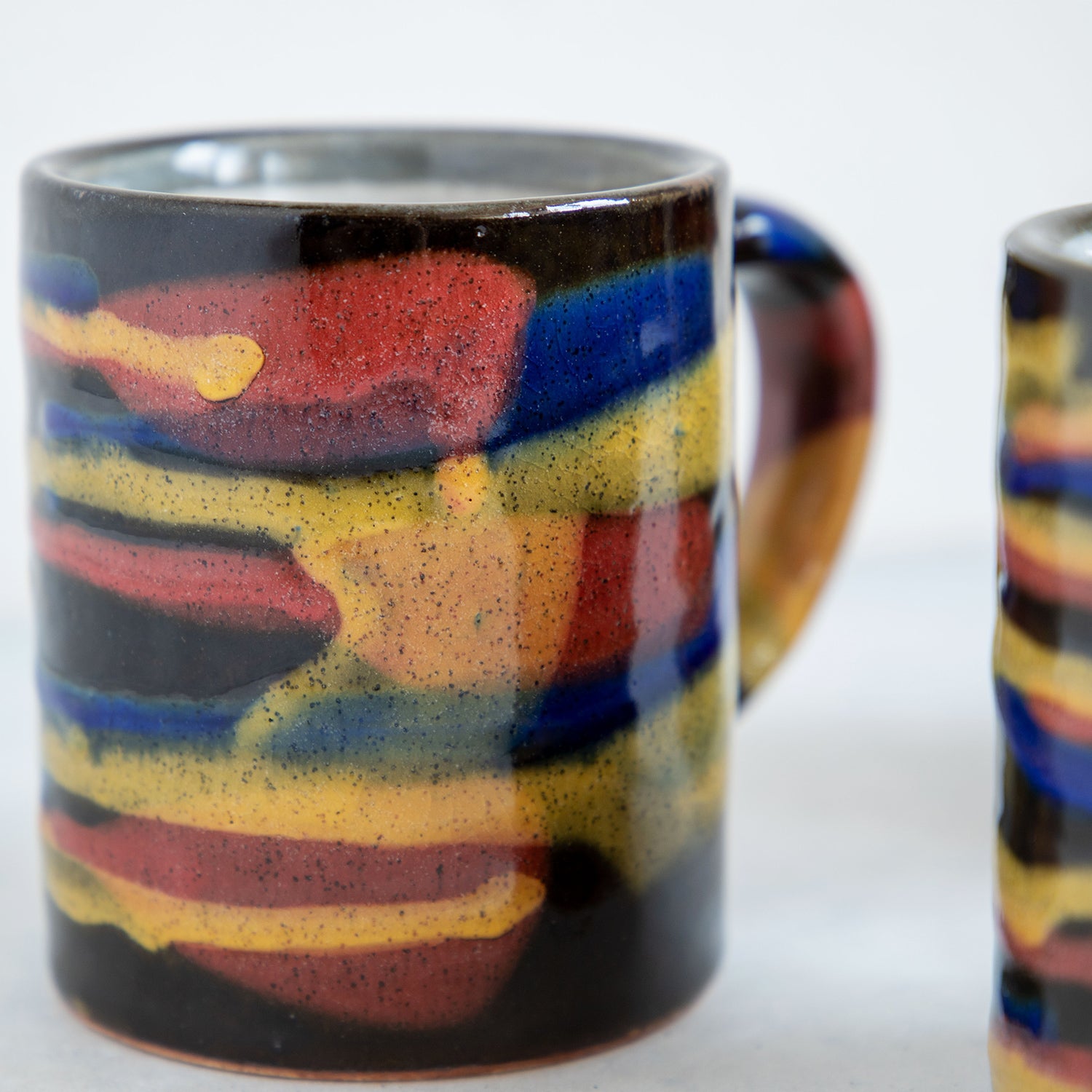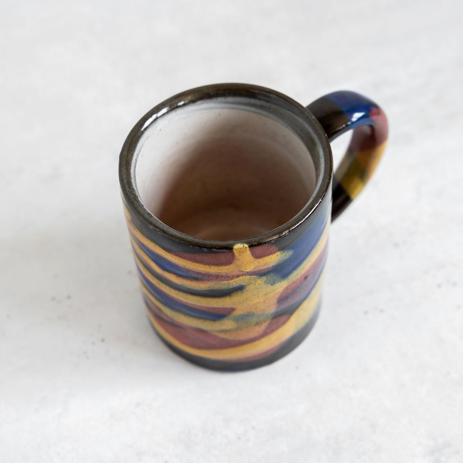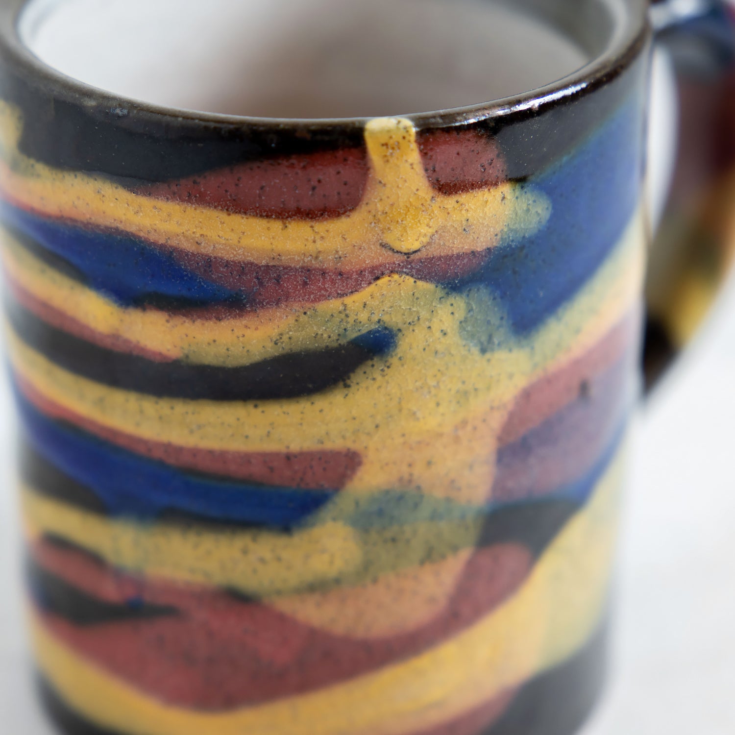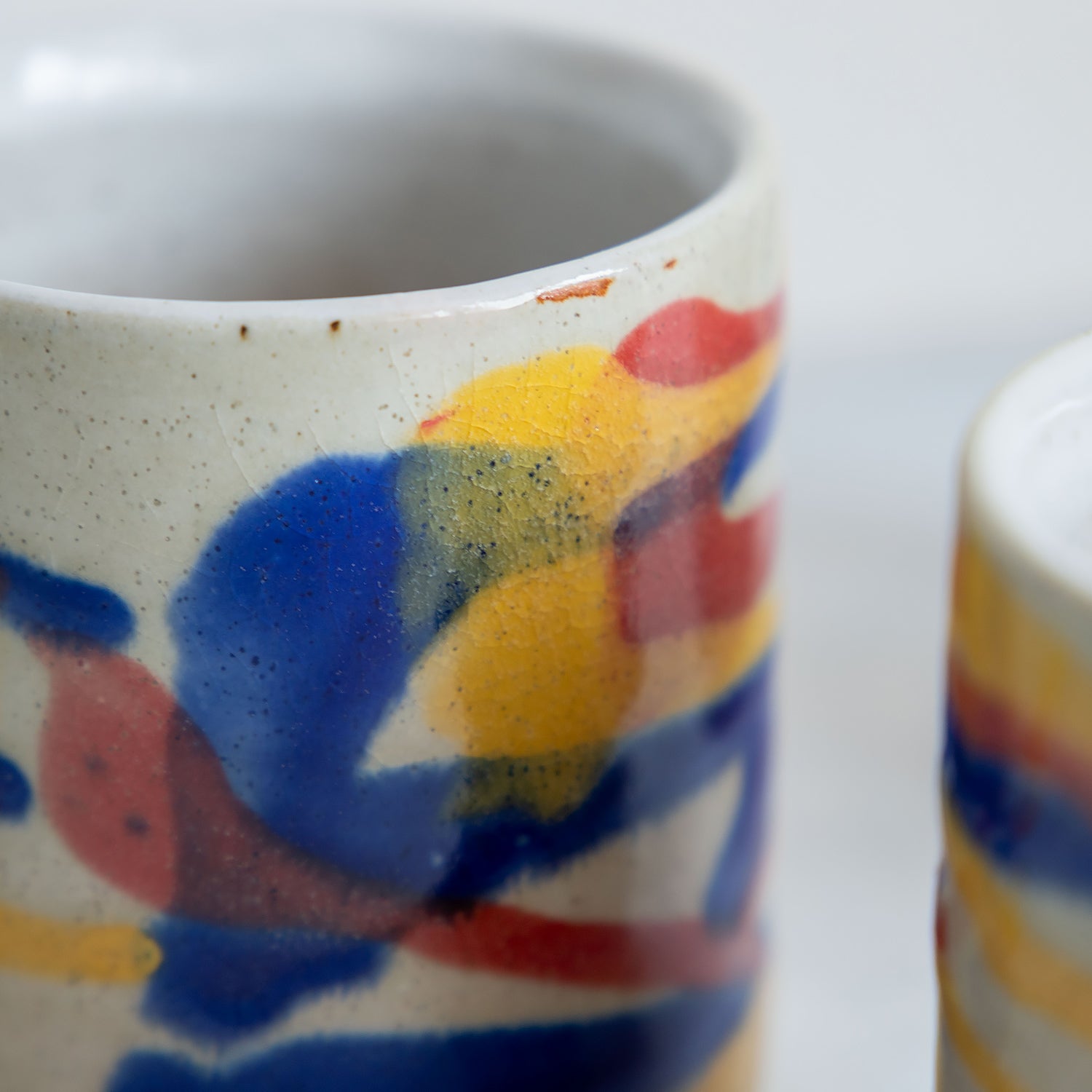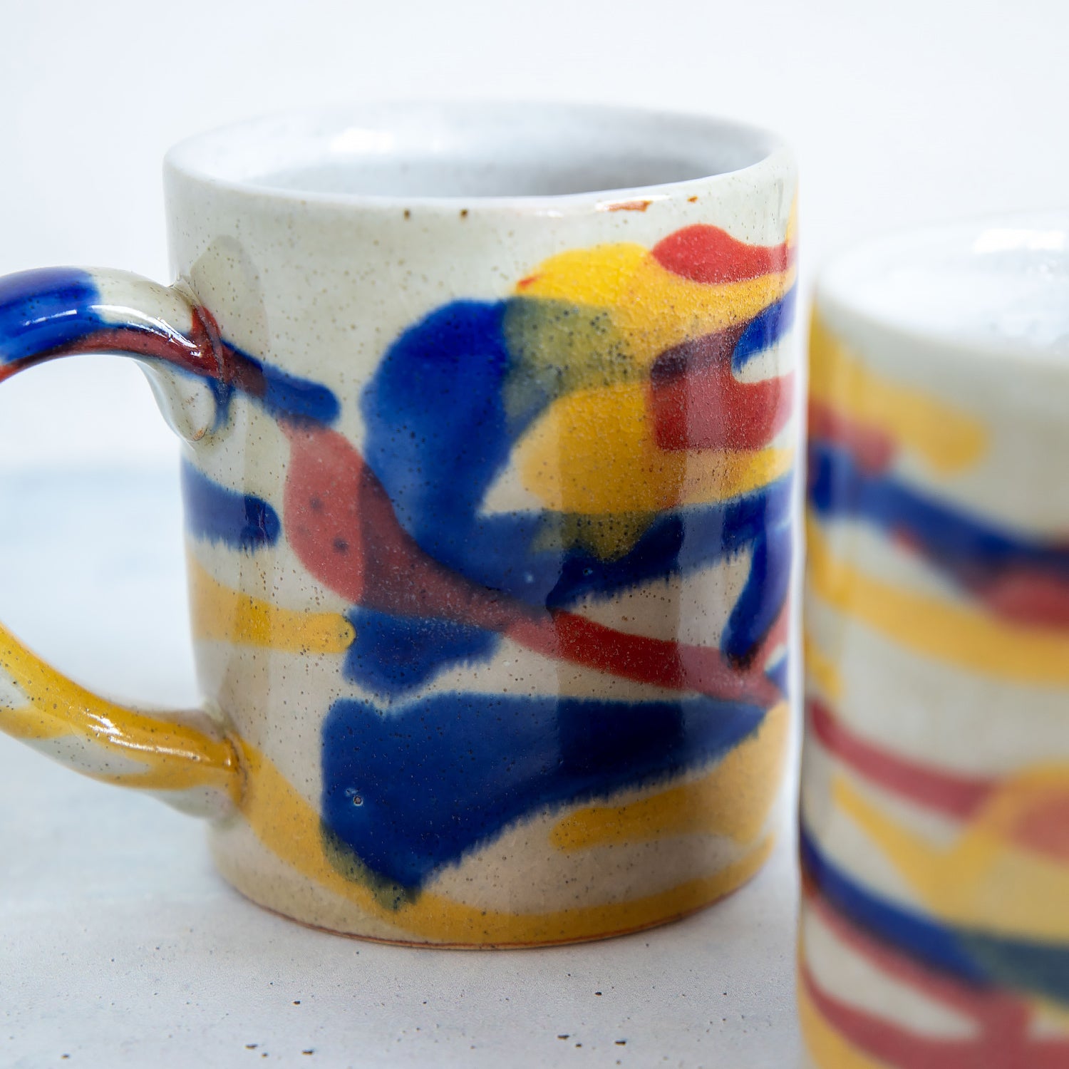 このマグカップは、日本の職人さんの手によって、1色ずつ丁寧に釉薬が塗り重ねられています。3色の釉薬が自由に交わり、偶然に生まれる色の重なり。その上を指先でなぞると、ぽこぽことした釉薬の凹凸があり、プリントでは決して表せない、奥行きある表情に出会えます。