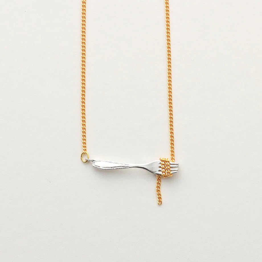 シルバーのフォークとゴールドのチェーンの組み合わせが軽やかで、
