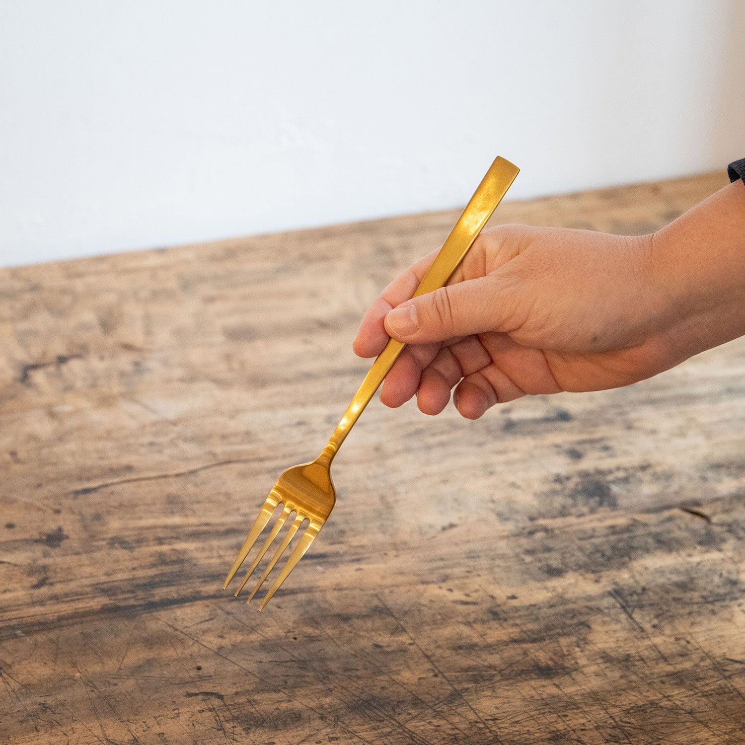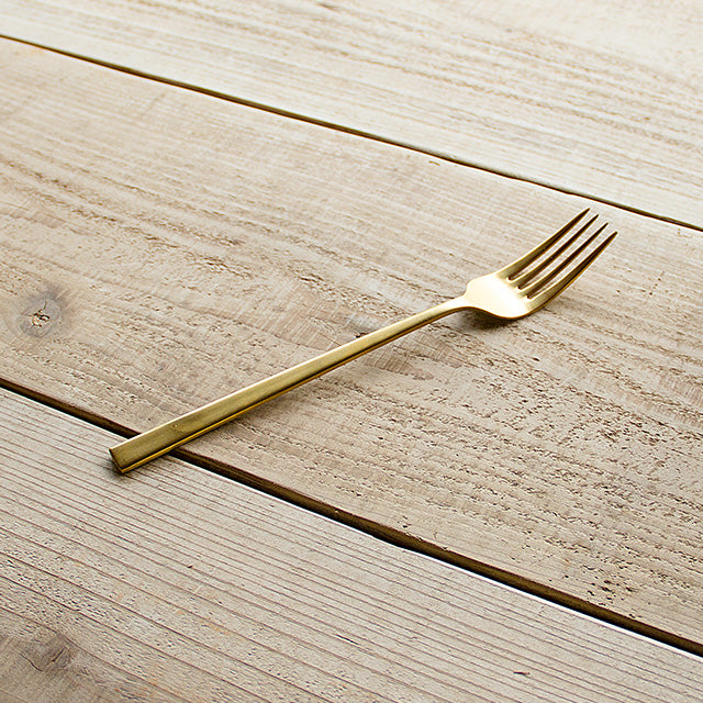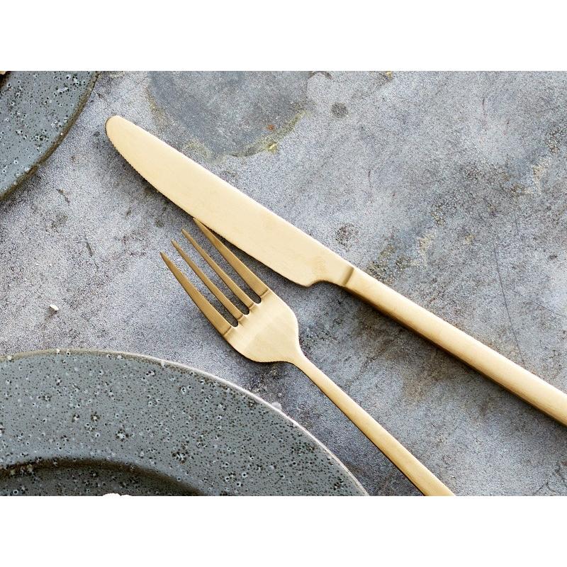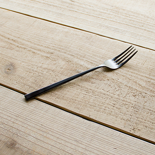Bitzのカトラリーは鈍く光るブラックと、金管楽器のような少しクラシックな輝きのブラス。同ブランドのストーンウェアに合わせて作られています。どちらも個性的なカトラリーにもかかわらず、シンプルなデザインなので、Bitz商品はもちろん、他の食器にも意外と合わせやすいのが使いやすいですね。ブラックは、マットな風合いですが、光の加減ではクローム調に光る、不思議な質感です。ブラスは明るく輝くゴールドというよりは、金管楽器のようなシブい質感です。ありそうで見かけない、そんなオリジナリティあふれるカトラリーたちです。