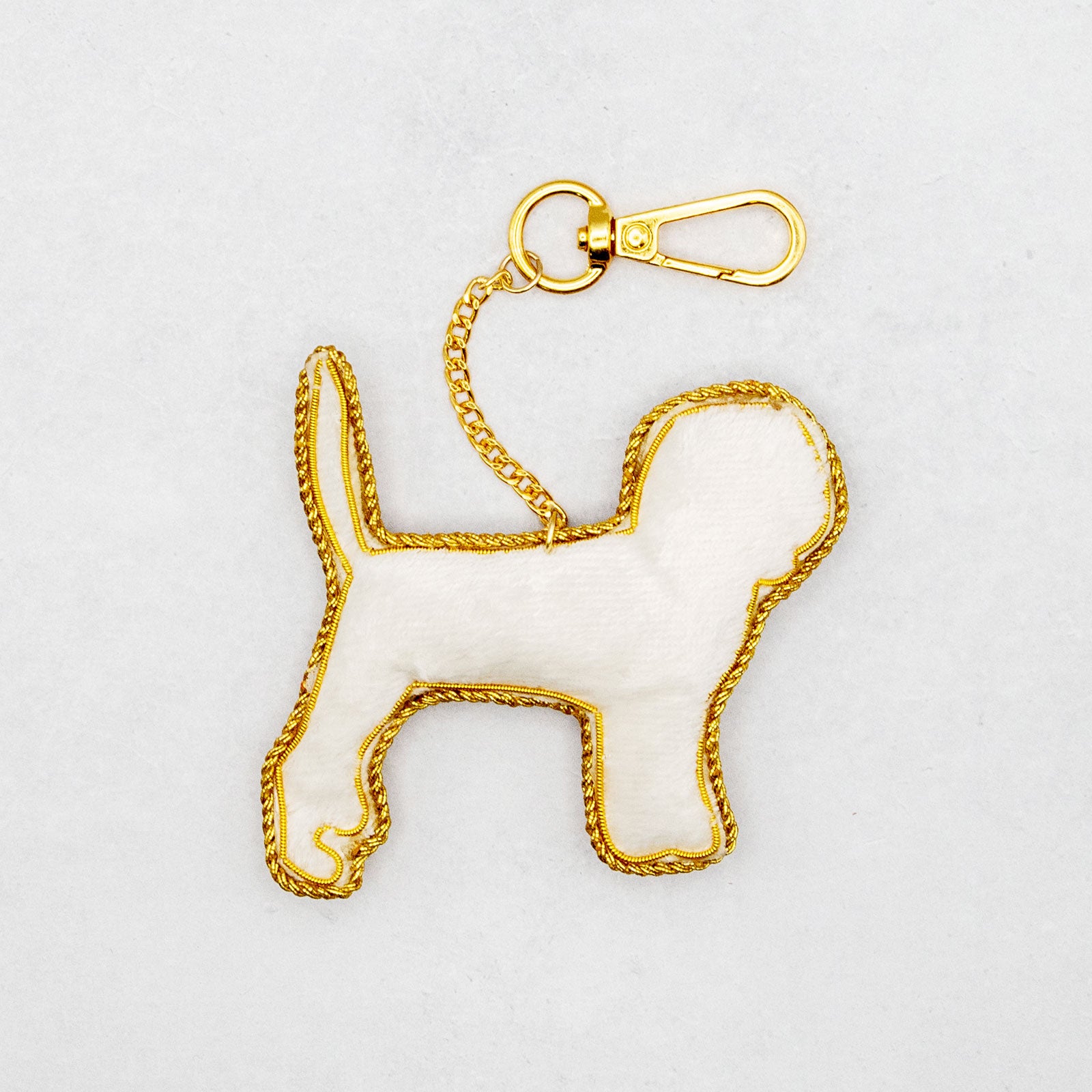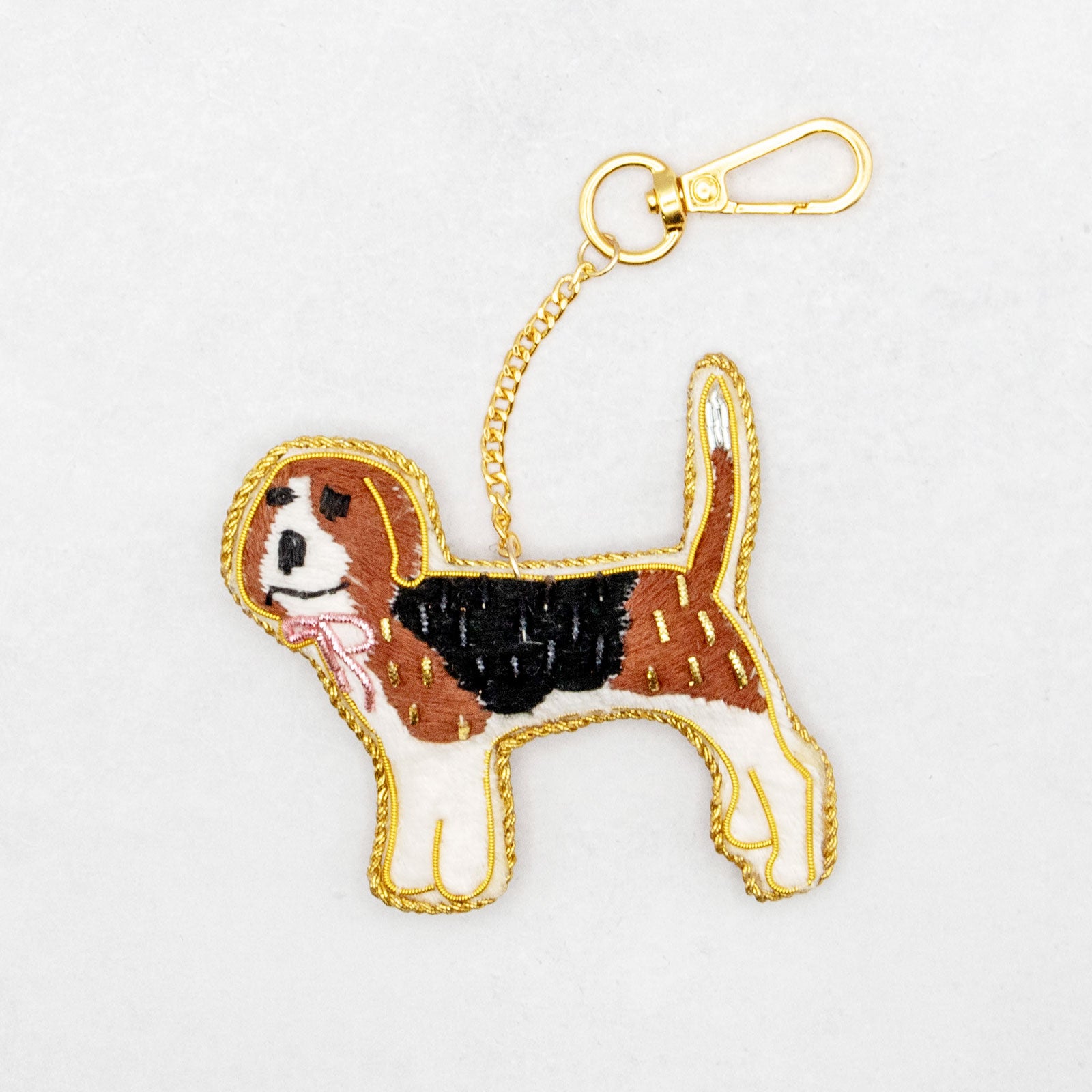 インドの職人が一針ずつ丁寧に仕上げた、ビーグルモチーフのバッグチャームです。独特なフォルムに繊細なビーズや金糸のザリ刺繍があしらわれ、角度によって輝きが変わる一点もののアートピースとしておすすめです。サイズも携帯にちょうどよく、バッグや鍵、ポーチのアクセントに最適です。