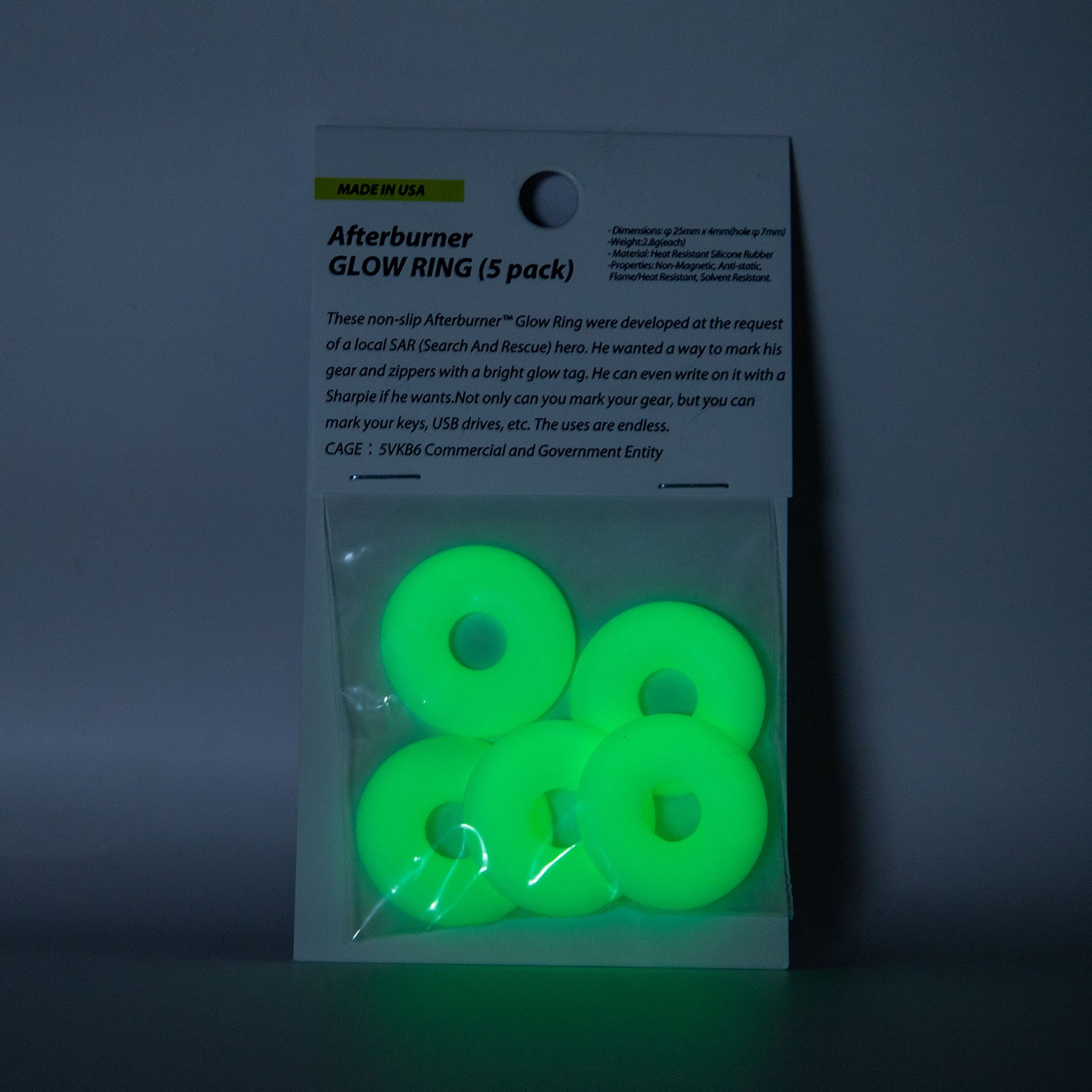 太陽光、スマートフォンのライト等様々な光源から蓄光することができるリングパーツ5個セット。キーリングやジップに付けることで暗い状況でも素早く認識することができます。