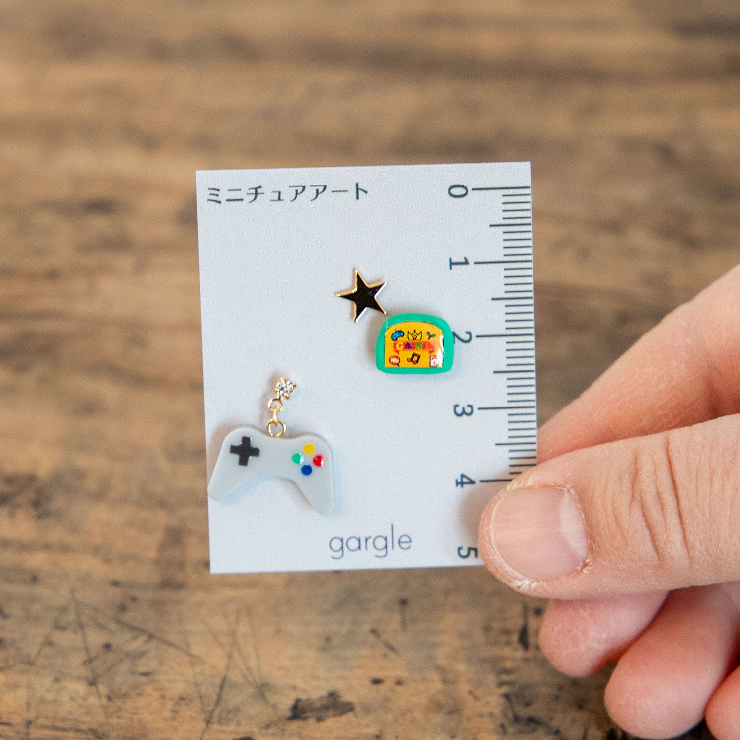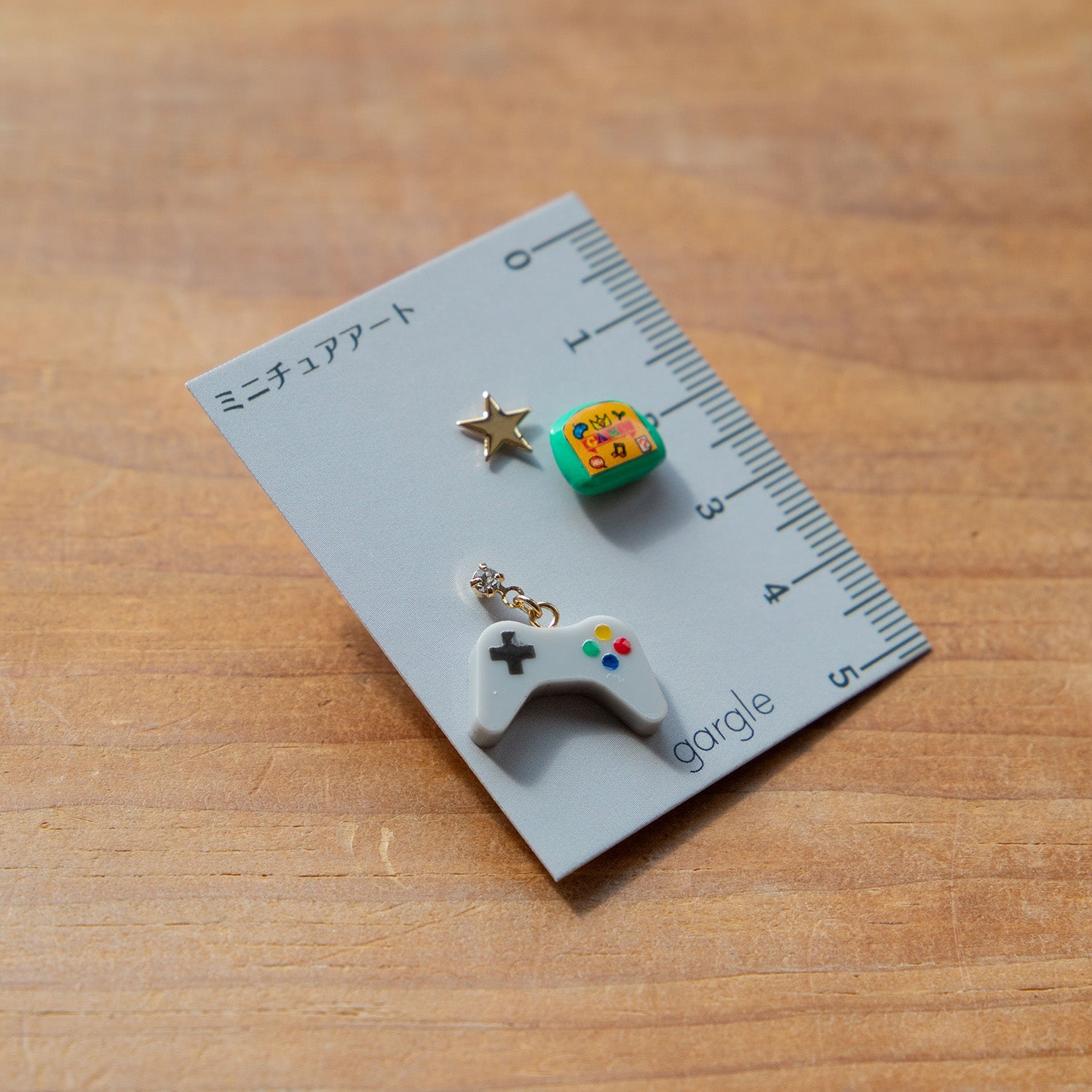 レトロゲームピアスは、コンピューターゲームのコントローラーをモチーフにしたピアスです。 カラフルなボタンが特徴で、スーパーファミコン風のレトロなデザインになっています。