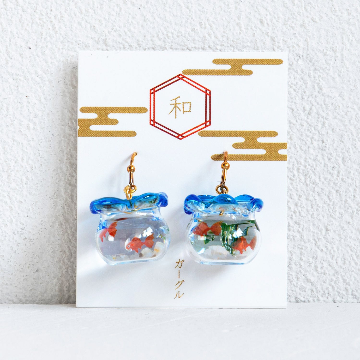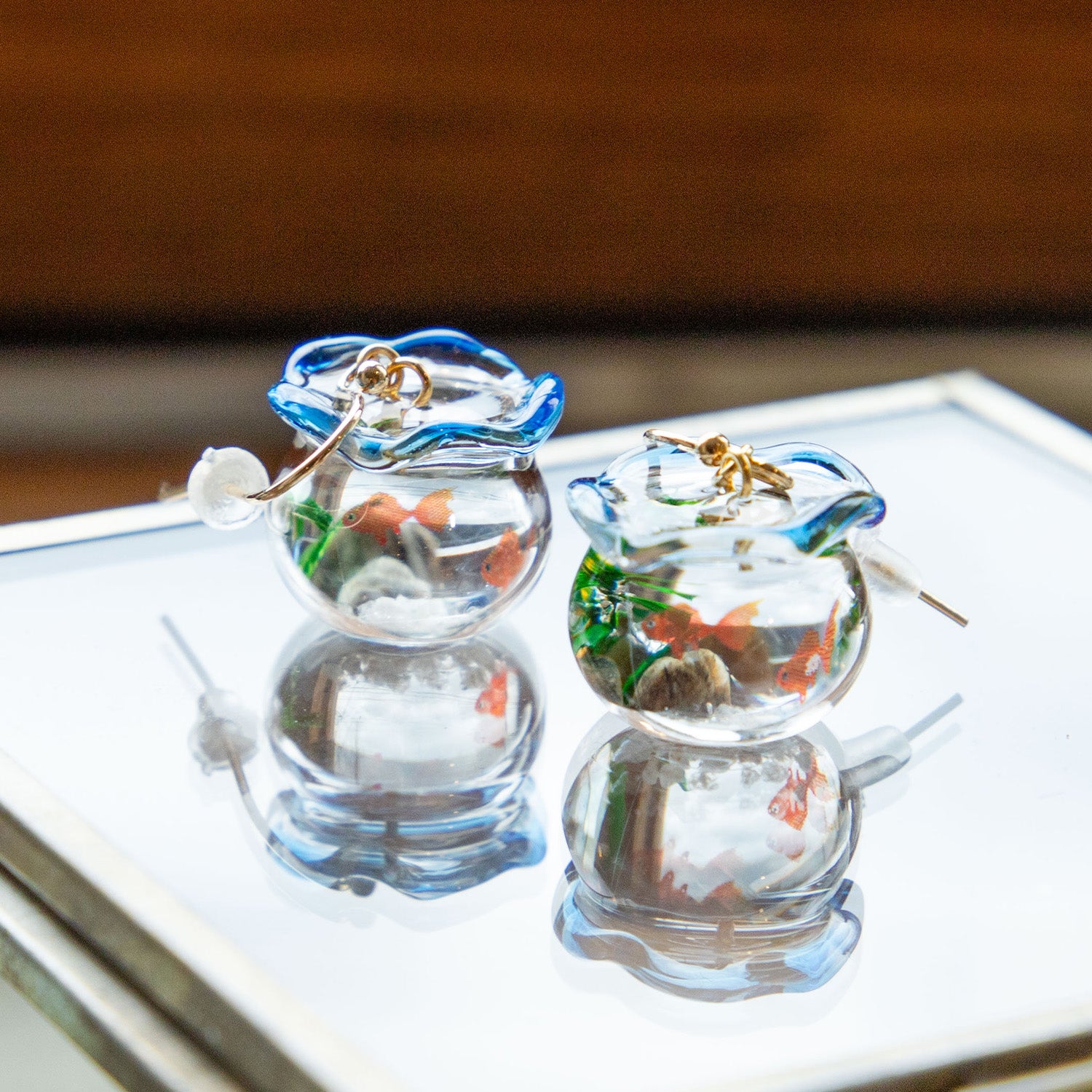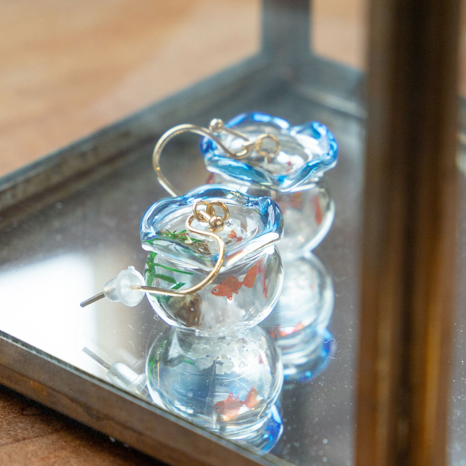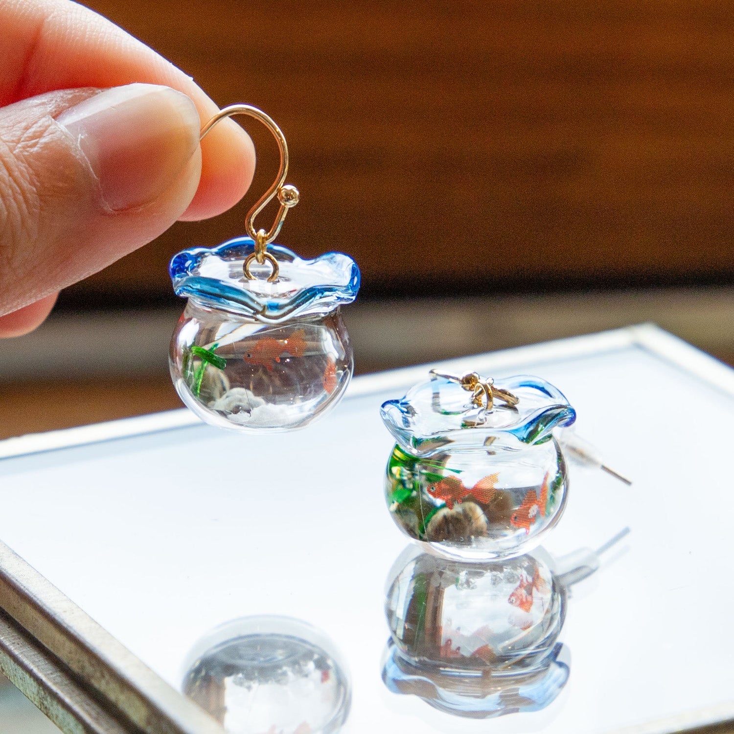 金魚鉢の中で優雅に泳ぐ金魚に癒されるピアスです。