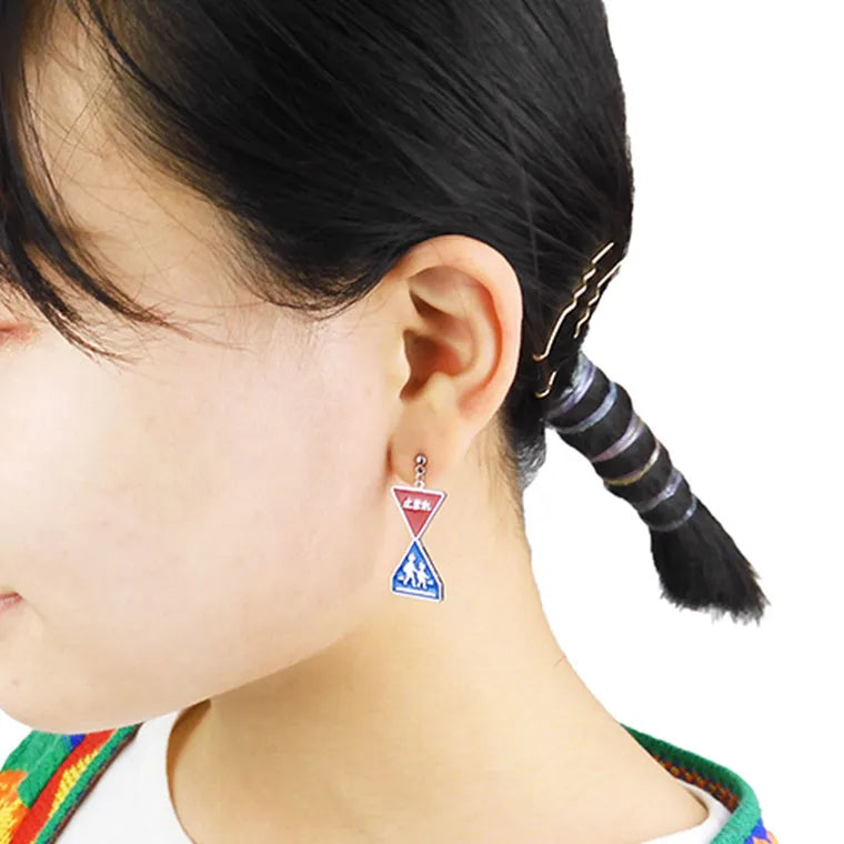 道路標識がピアスになりました!道路で目にしたことがある看板も、ピアスにするとアート感あふれる印象に。ポップなカラーも◎