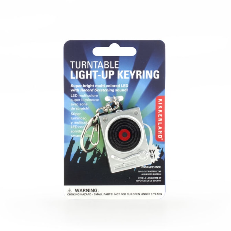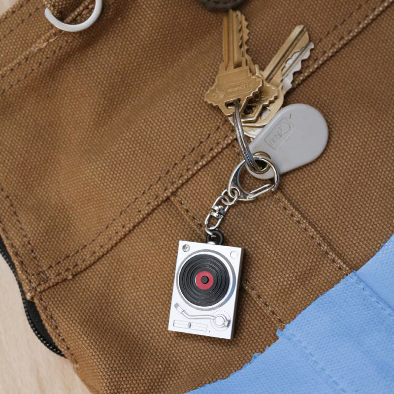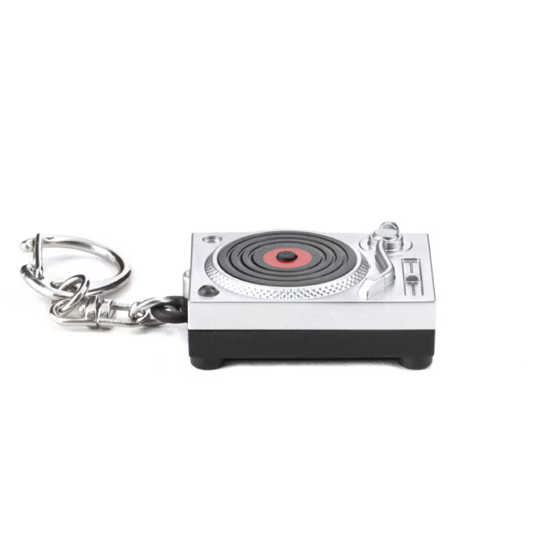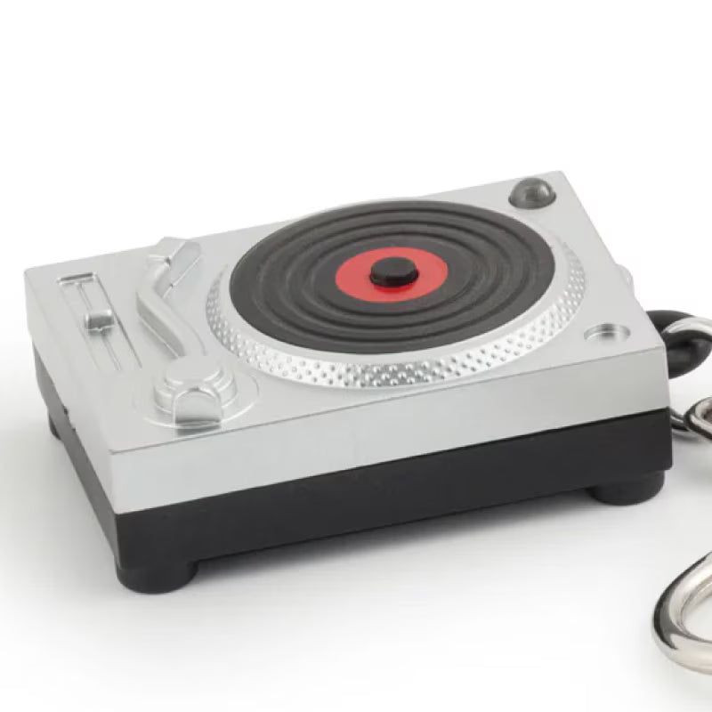ターンテーブルをモチーフにした遊び心のあるキーリング。中央のボタンを押すと、カラフルなLEDが光り、テクニカルなスクラッチ音が流れてミニDJ気分を味わえます。
