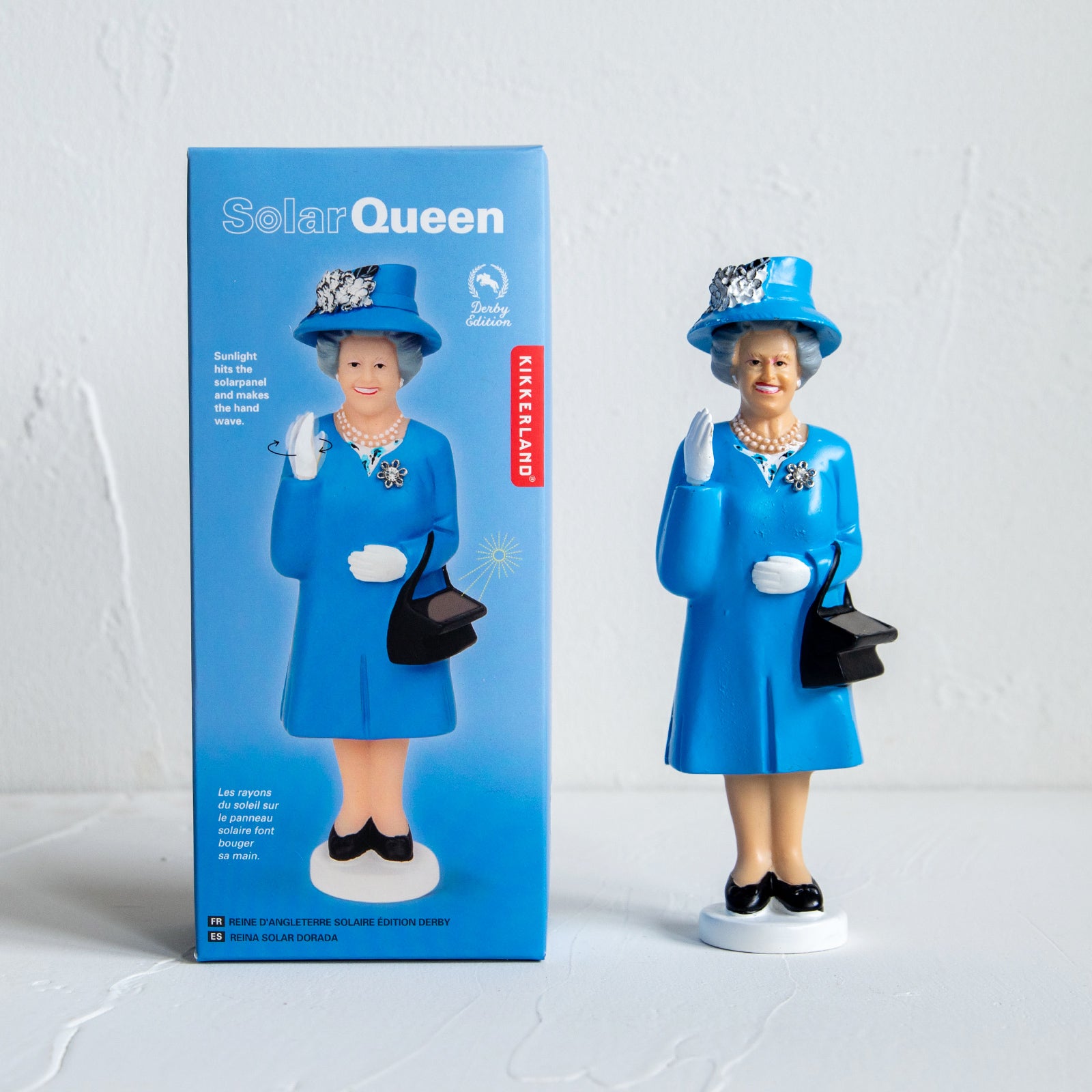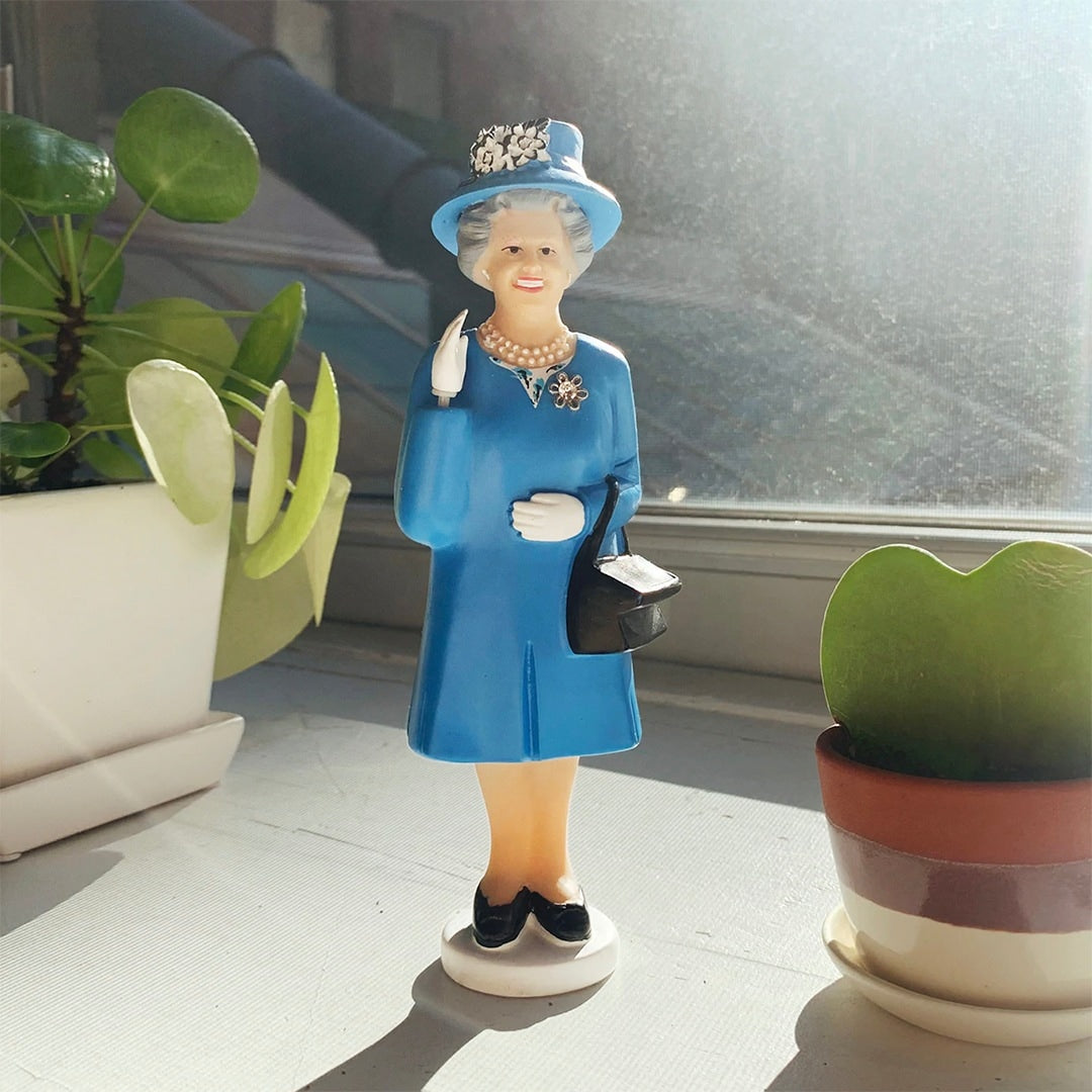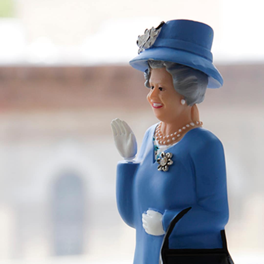 バッグに付いたソーラーパネルに光が当たると、女王陛下のお手振りが見られるありがたいオブジェ。