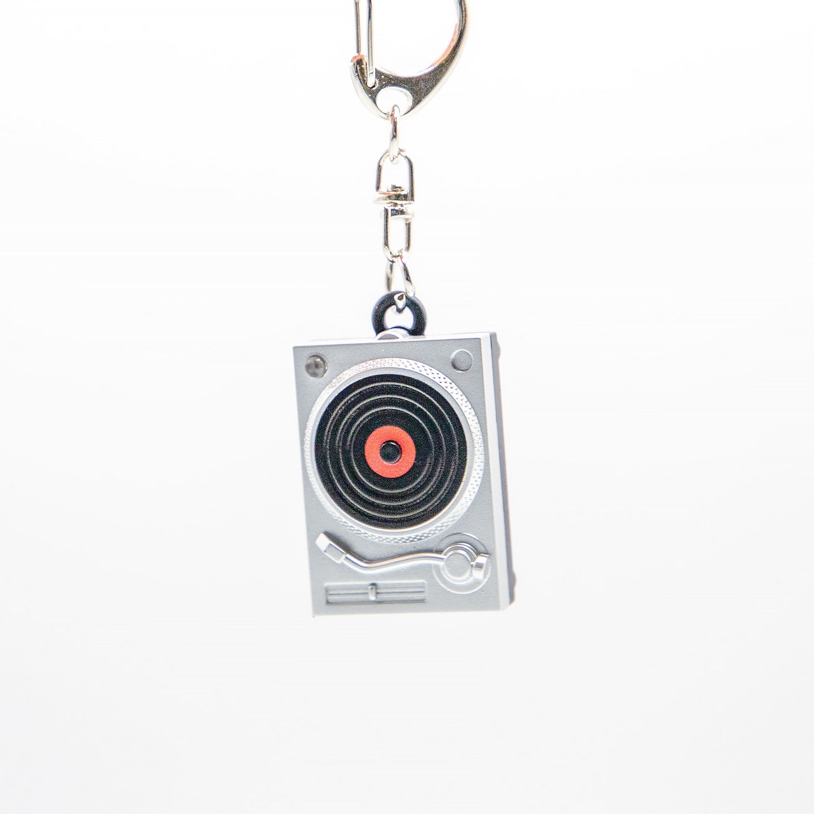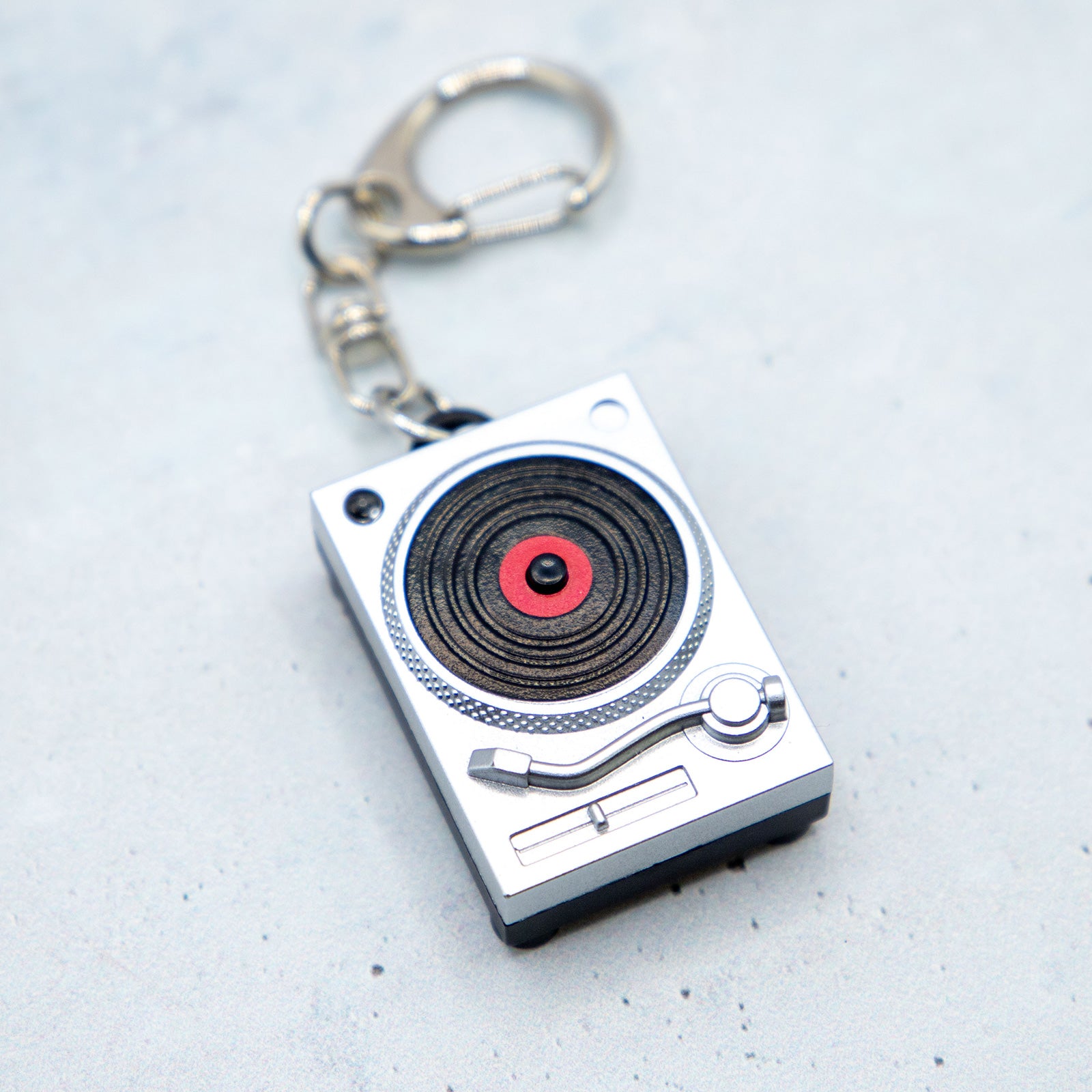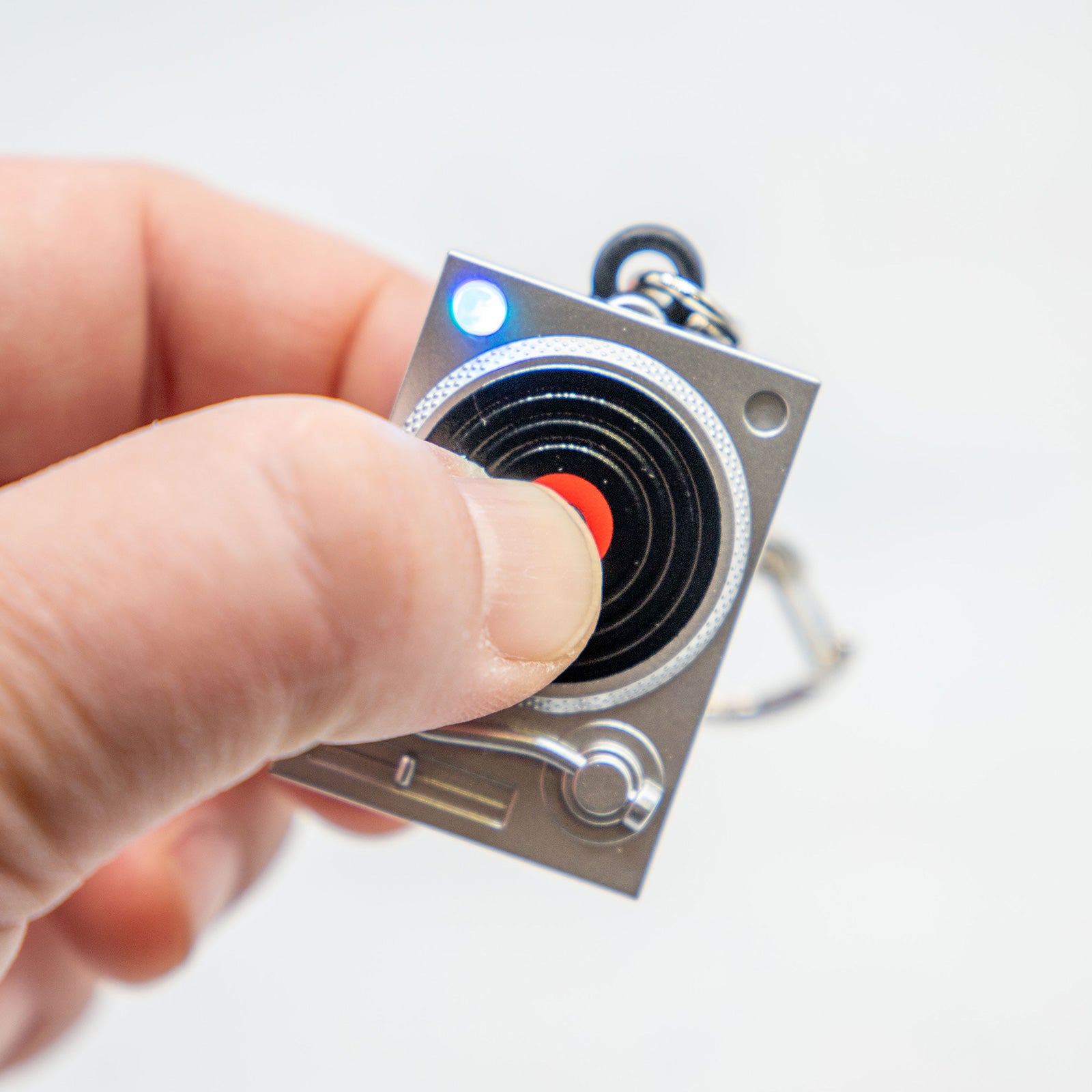 ターンテーブルをモチーフにした遊び心のあるキーリング。中央のボタンを押すと、カラフルなLEDが光り、テクニカルなスクラッチ音が流れてミニDJ気分を味わえます。