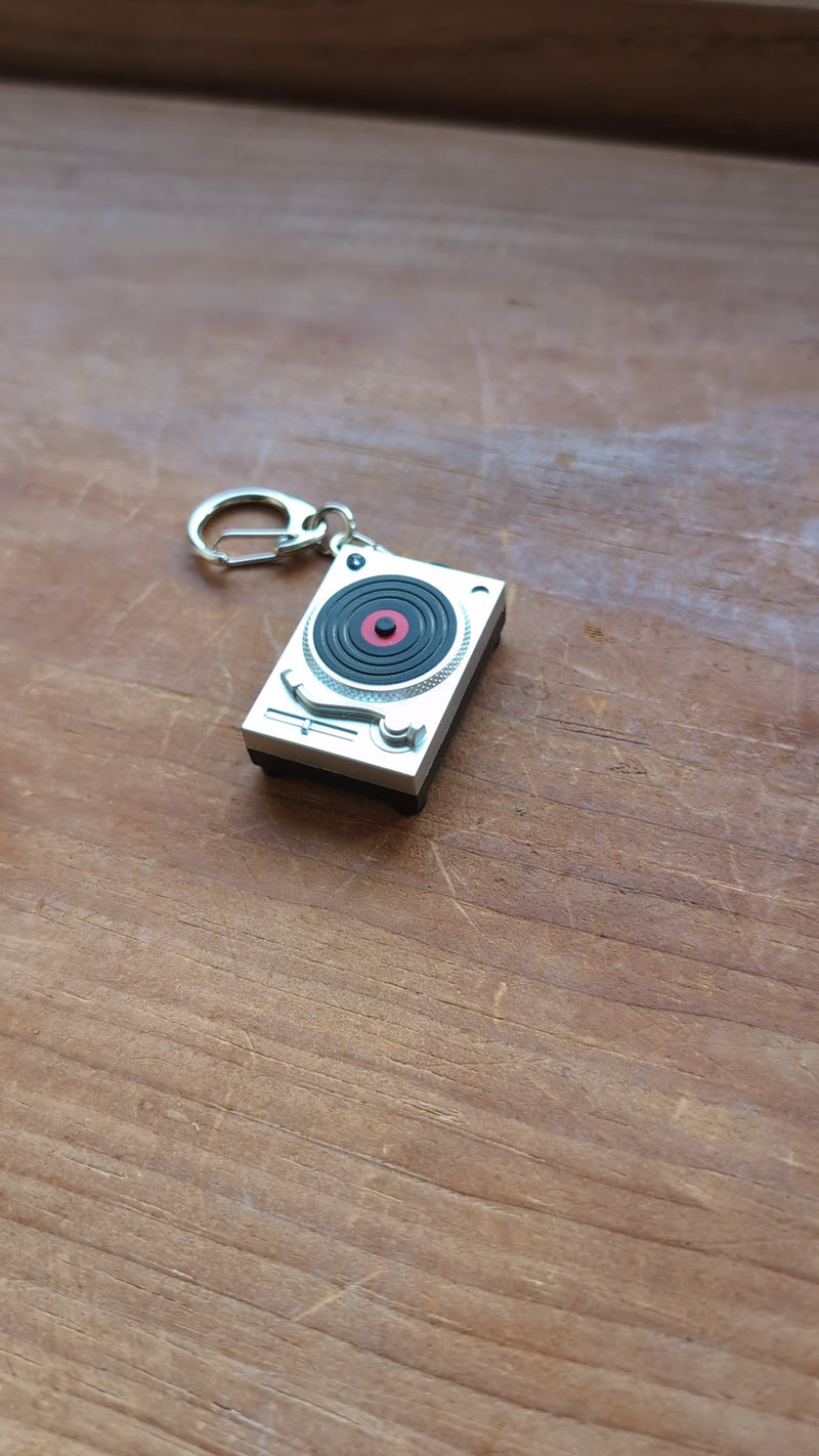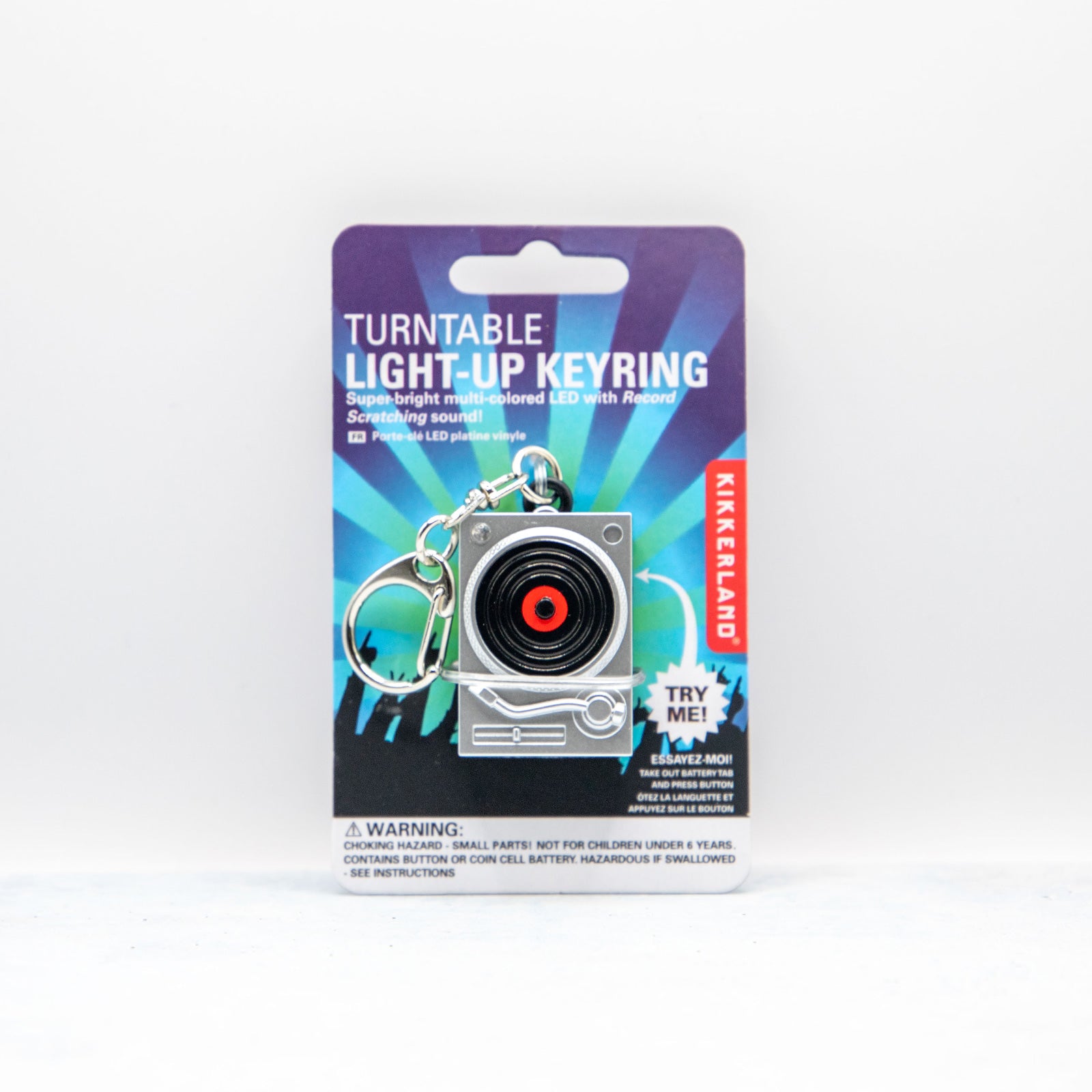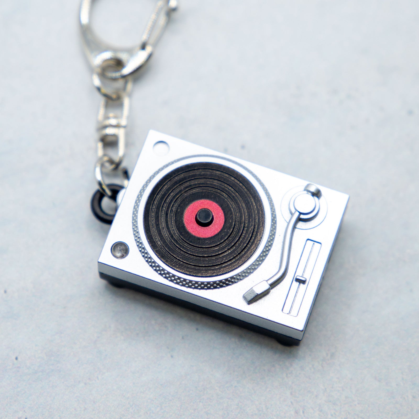 ターンテーブルをモチーフにした遊び心のあるキーリング。中央のボタンを押すと、カラフルなLEDが光り、テクニカルなスクラッチ音が流れてミニDJ気分を味わえます。
