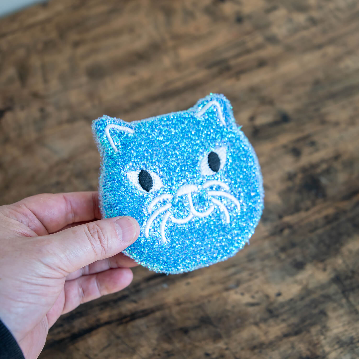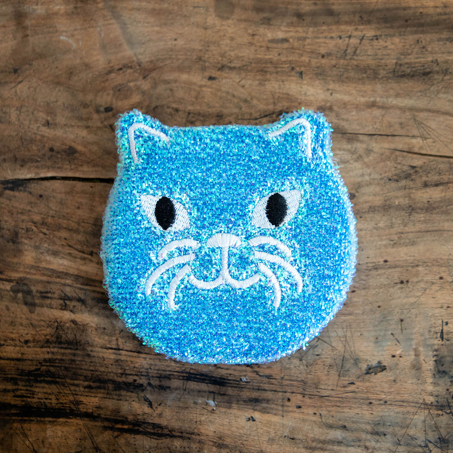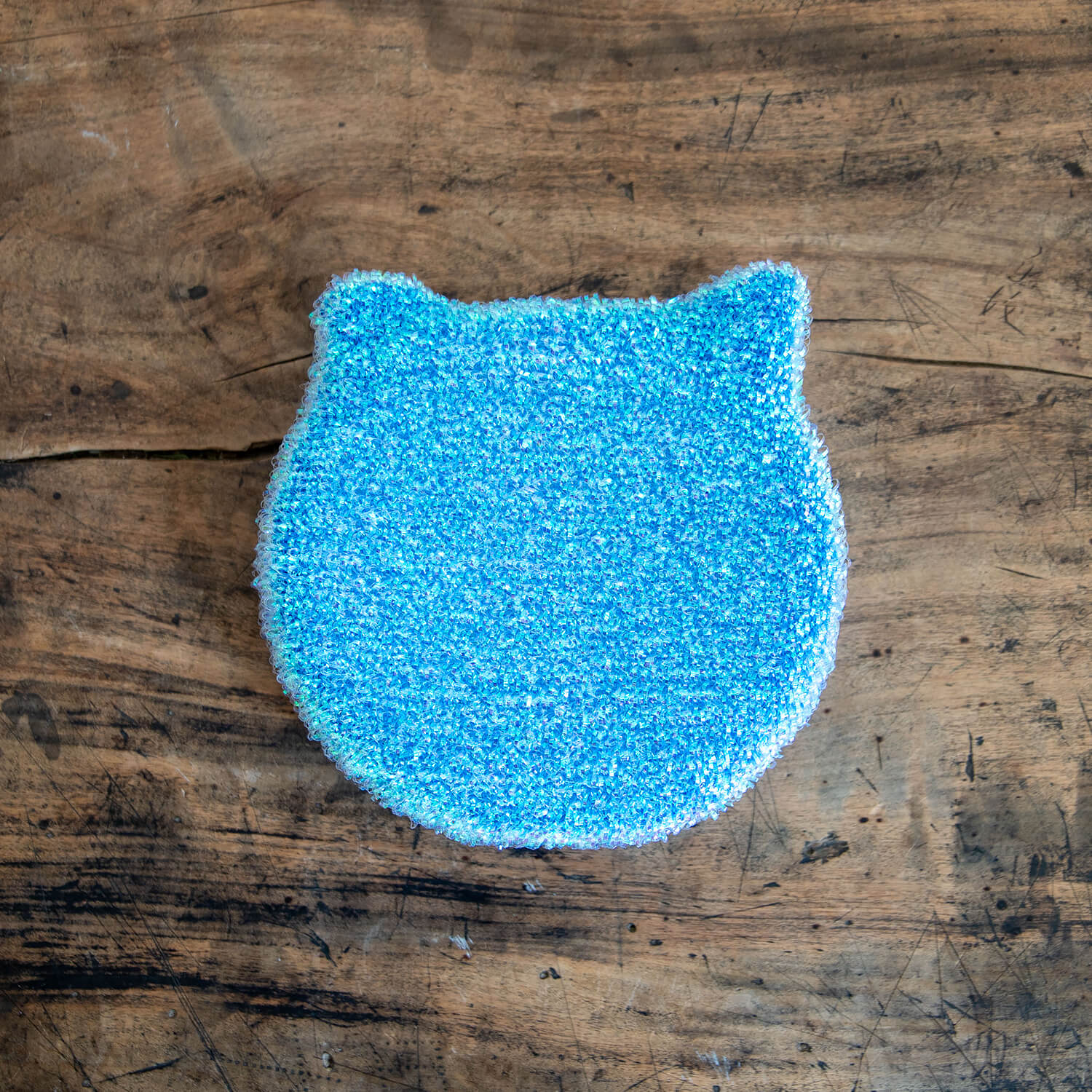 なんとも憎めない表情でこちらを見つめるデザイン。スポンジ表面はキラキラしたループ状の繊維なので、汚れもしっかり落とします。