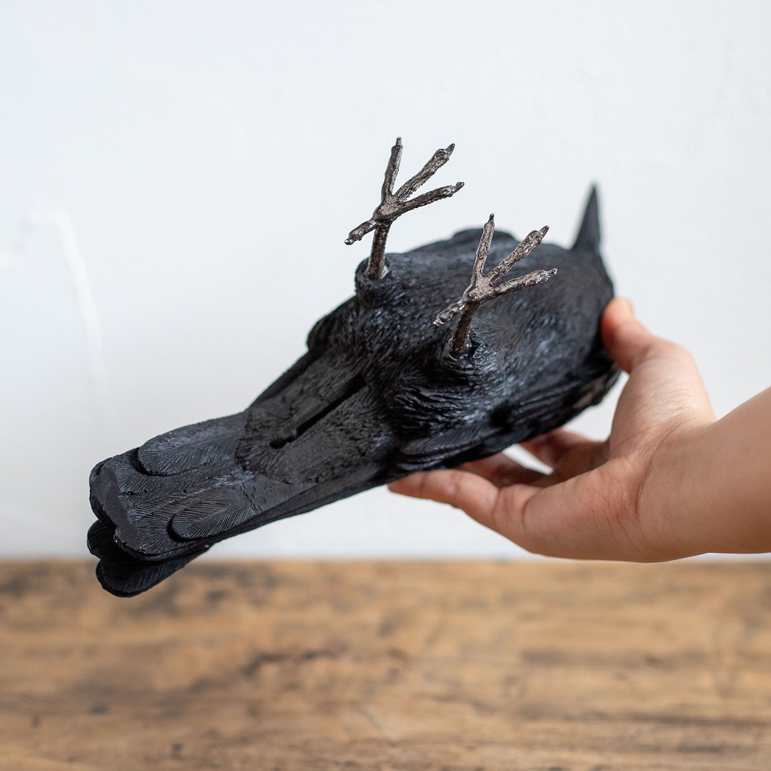こちらは、ハシブトガラスが口を閉じてじっとこちらを観察しているような、思わず目が合ってしまうカラス好きにはたまらない貯金箱。