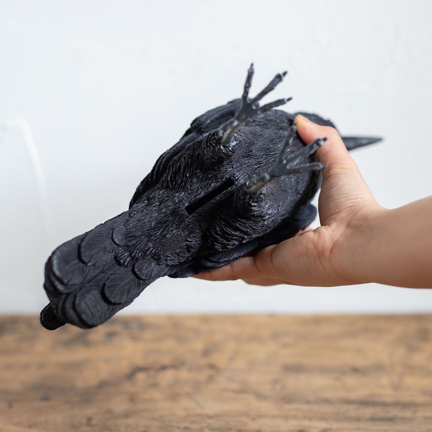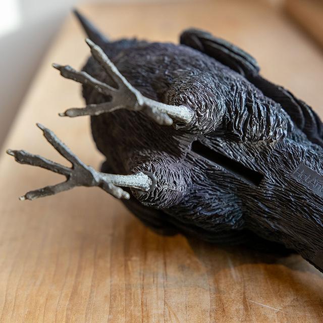 こちらは、ハシブトガラスが口を開けて「カーー!」と言ってそうな、思わず撫でてしまいそうな貯金箱。