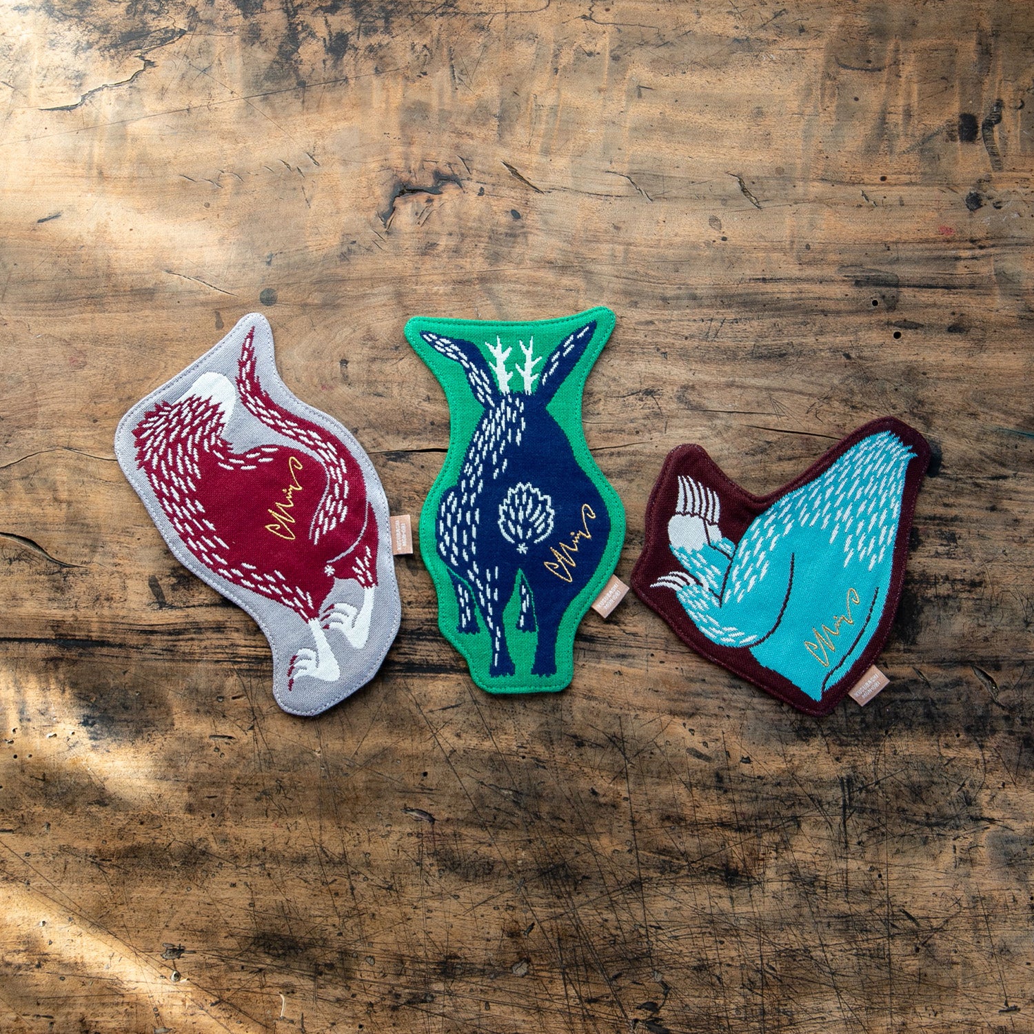 ユニークなポーズの絵柄は3タイプ。3重ガーゼ織りです。