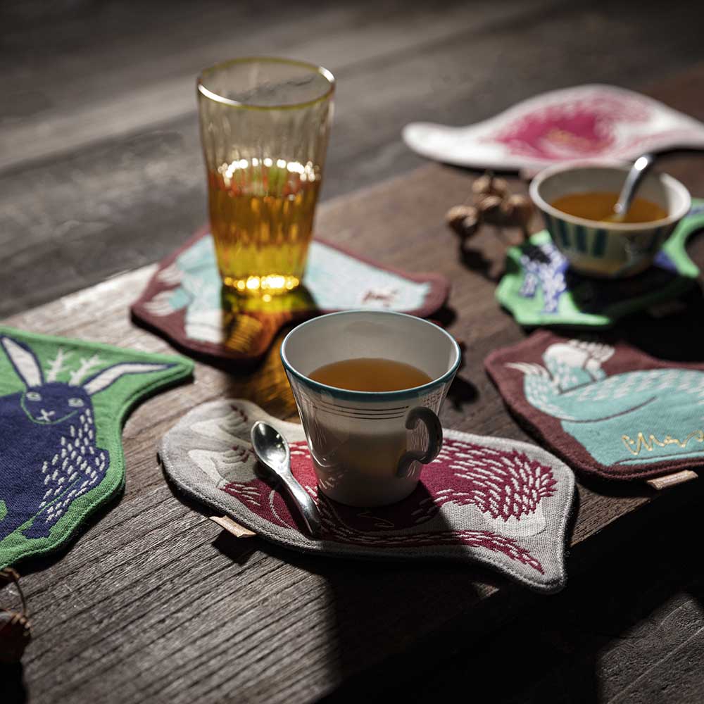 MiWさんの不思議な絵の世界を映し出すテーブウェアとして、食卓やリビングを華やかにしてくれます。