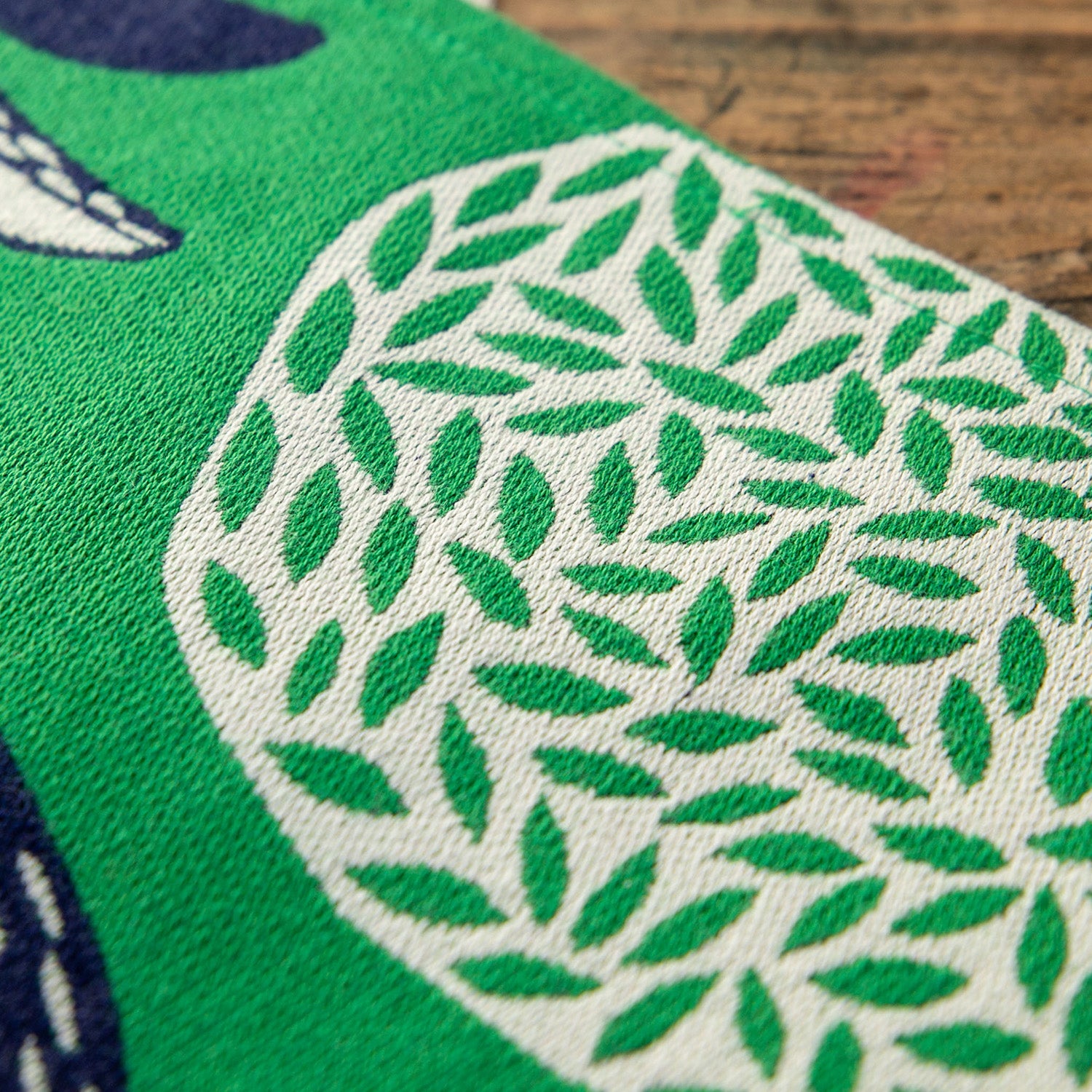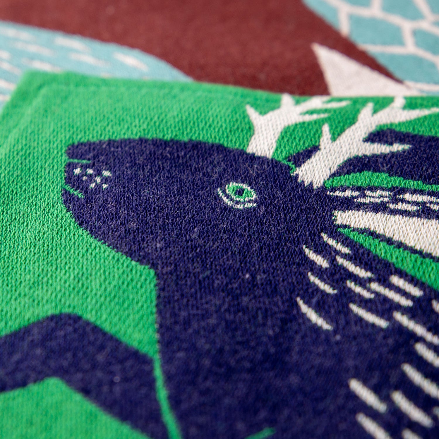ユニークなドウブツたちが軽やかに遊ぶ絵柄は織りで描かれ、ややしっかりした厚手の生地となっています。