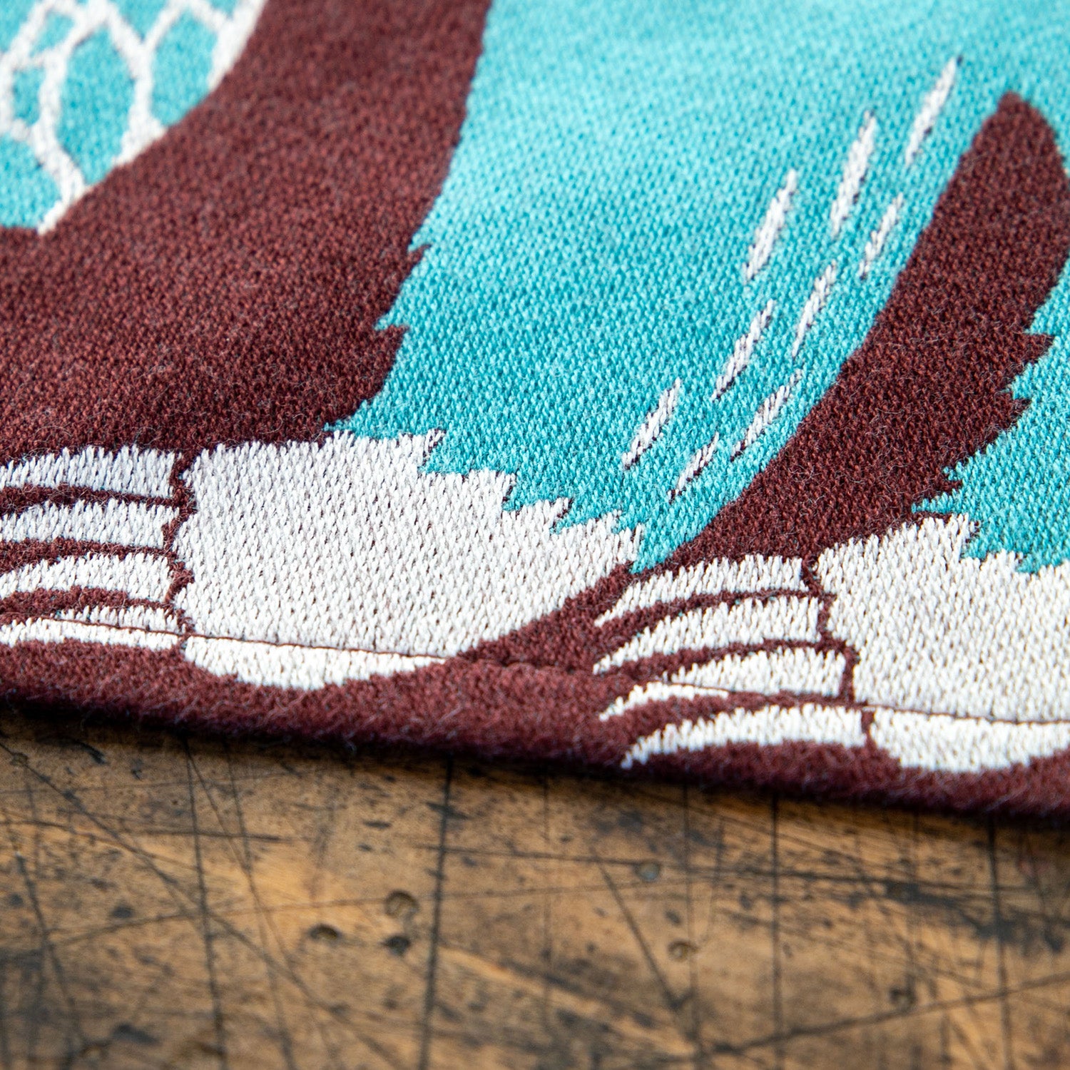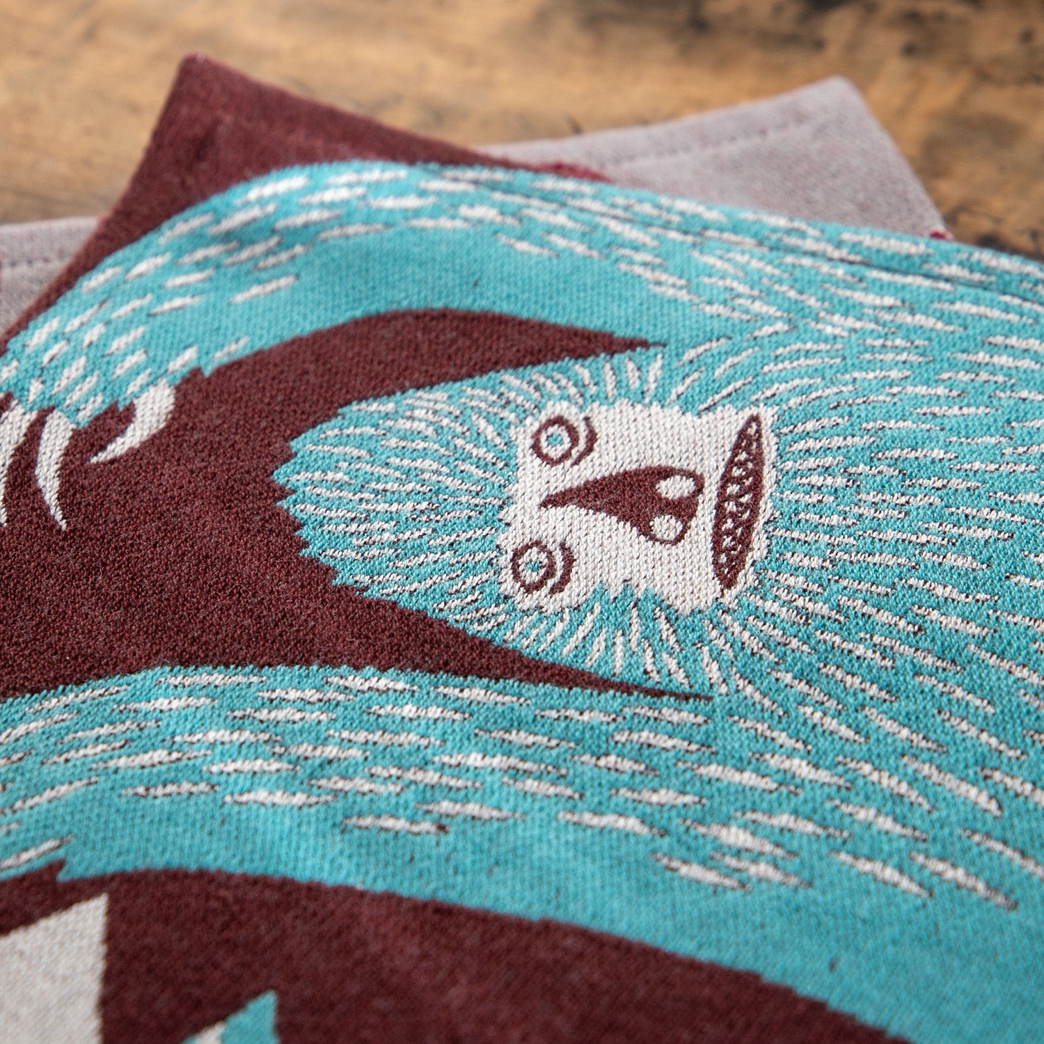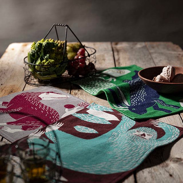 ユニークなドウブツたちが軽やかに遊ぶ絵柄は織りで描かれ、ややしっかりした厚手の生地となっています。