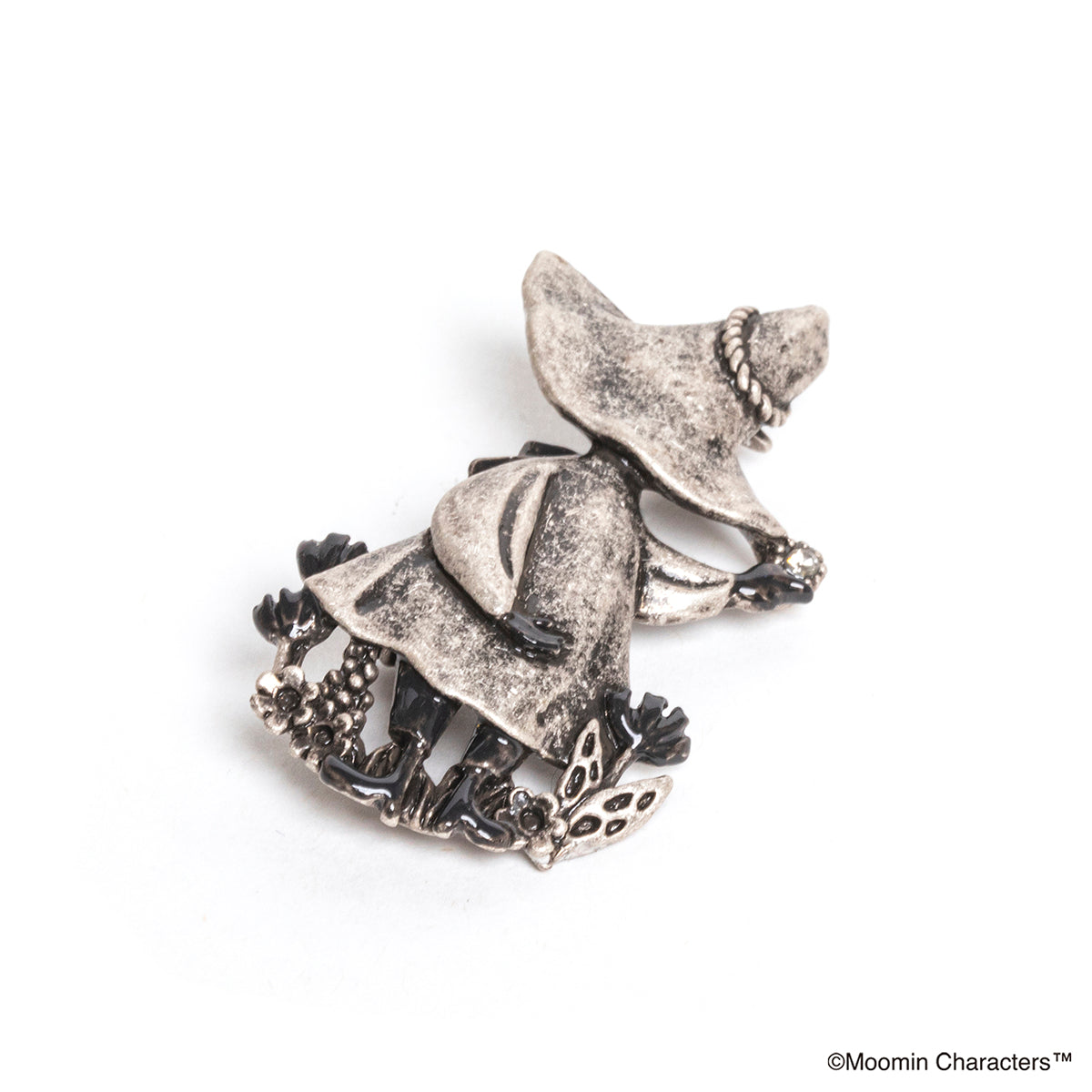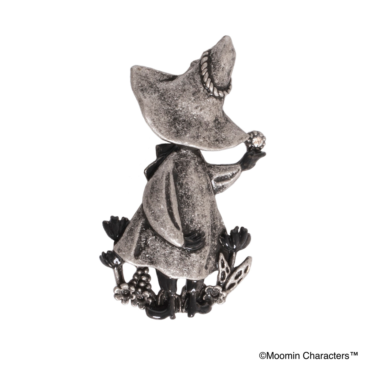 後ろ姿のスナフキンとお花をデザインしたブローチ。