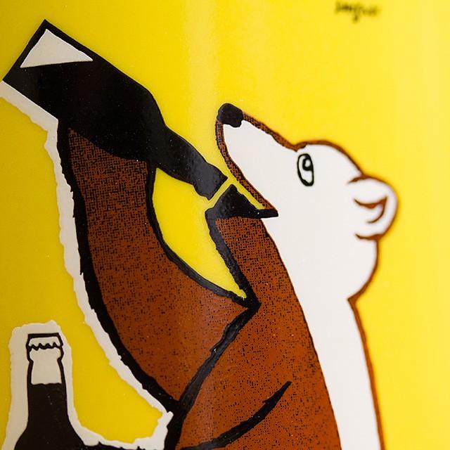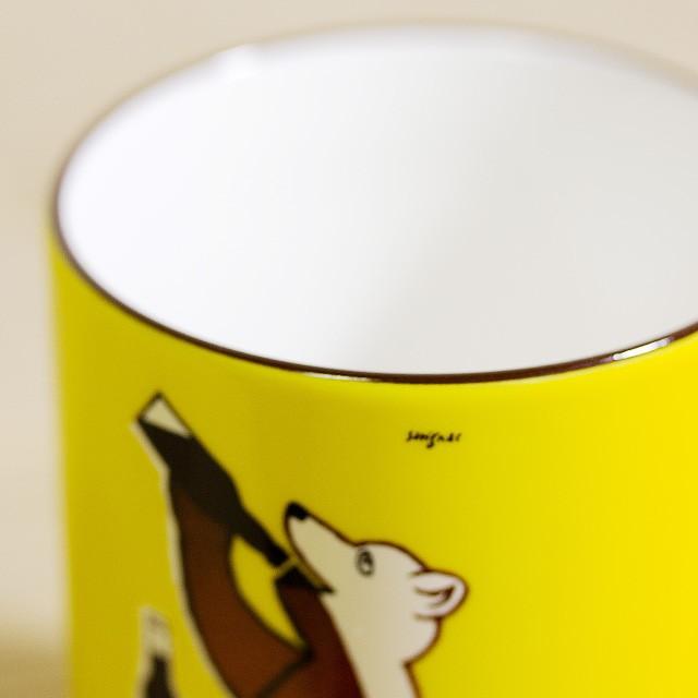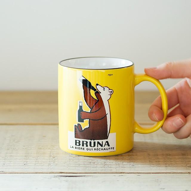 足を投げ出して座りながら、両手にビールですよ。茶色いビールを一気に飲み干すクマさんが何ともかわいくユーモラスなブリュナビールのポスターがマグカップになりました。ふちの茶色がいい味出してます。