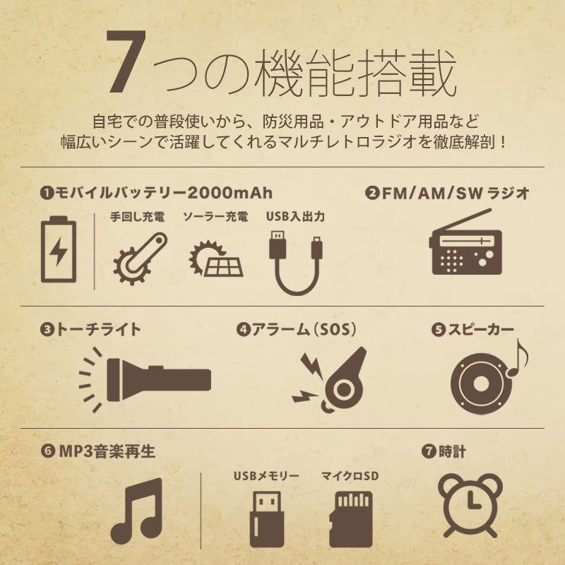 ラジオ・ライト・アラーム(SOS)・モバイルバッテリー・音楽再生・時計・スピーカーの機能を搭載した1台で7役をこなす優れものです。