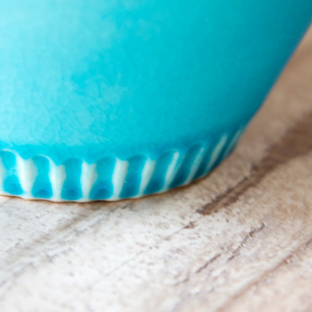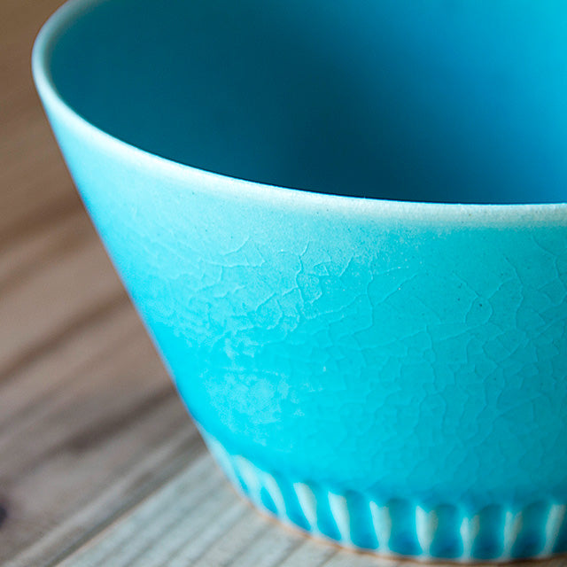 ターコイズとマリンブルーは淡くやさしい輝きと、釉薬の加減でぼんやり漂うむら感、ガラスのひびのような模様が不思議な味わいを出しています。ホワイトとグレーはマットでするするした穏やかな質感。一般的に売られているお皿では、こんな作品のようなお皿は見たことがないかもしれません。美しさとやさしさを是非味わってみてください。