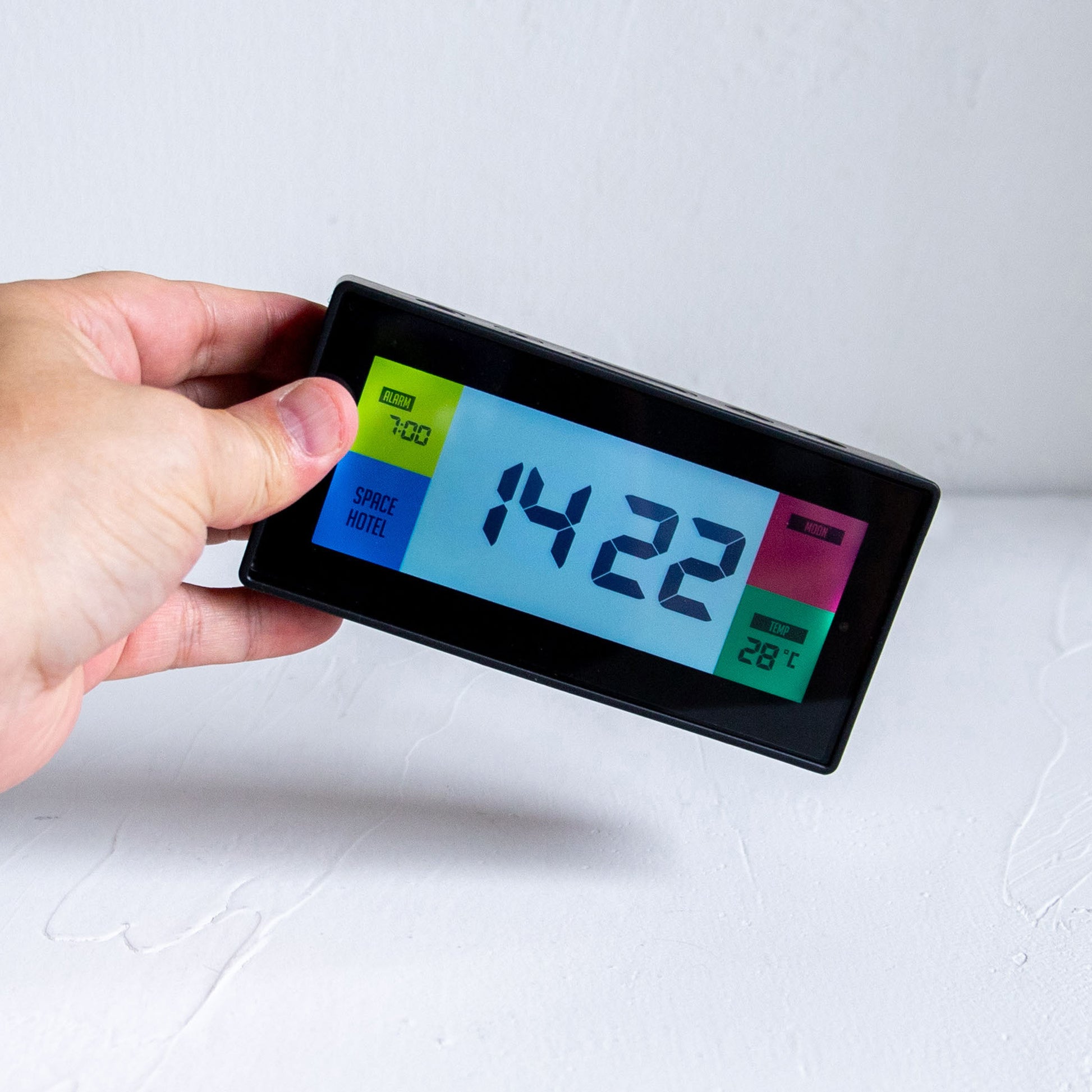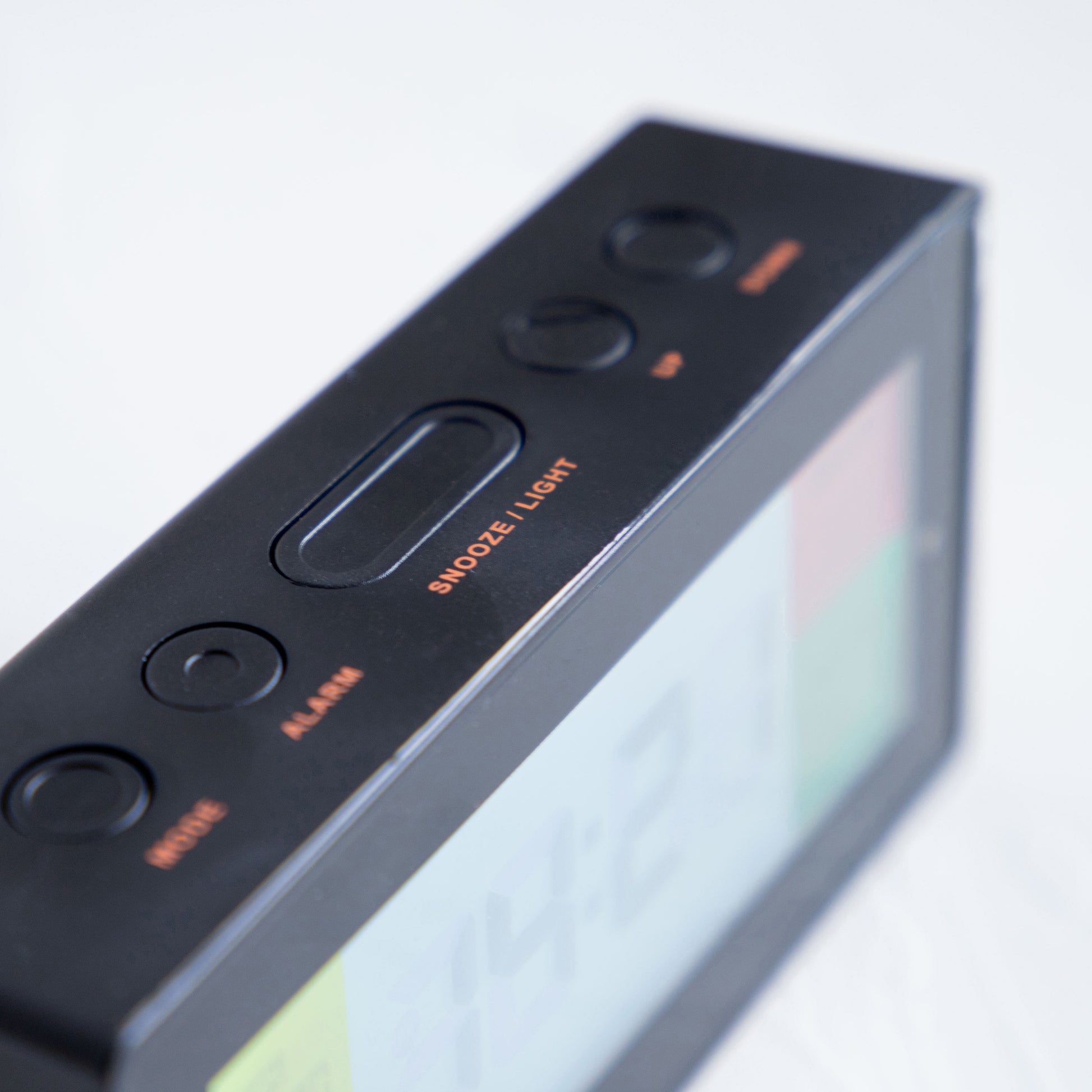 スクエアでシンプルなフォルムとビビッドなディスプレイパネルの組み合わせは、1970〜80年代のヴィンテージクロックを彷彿とさせ、スペーシーな雰囲気は現代に新鮮さを与えてくれます。 コンパクトな本体には多くの機能を持ち合わせており、12時間・24時間表示切り替え、デジタルアラーム・スヌーズ機能、温度表示、月の満ち欠けがわかるムーンフェイズ表示、あらかじめ就寝時に設定することで自動でバックライトの調整が出来るナイトスクリーンの明るさ設定などを搭載しています。