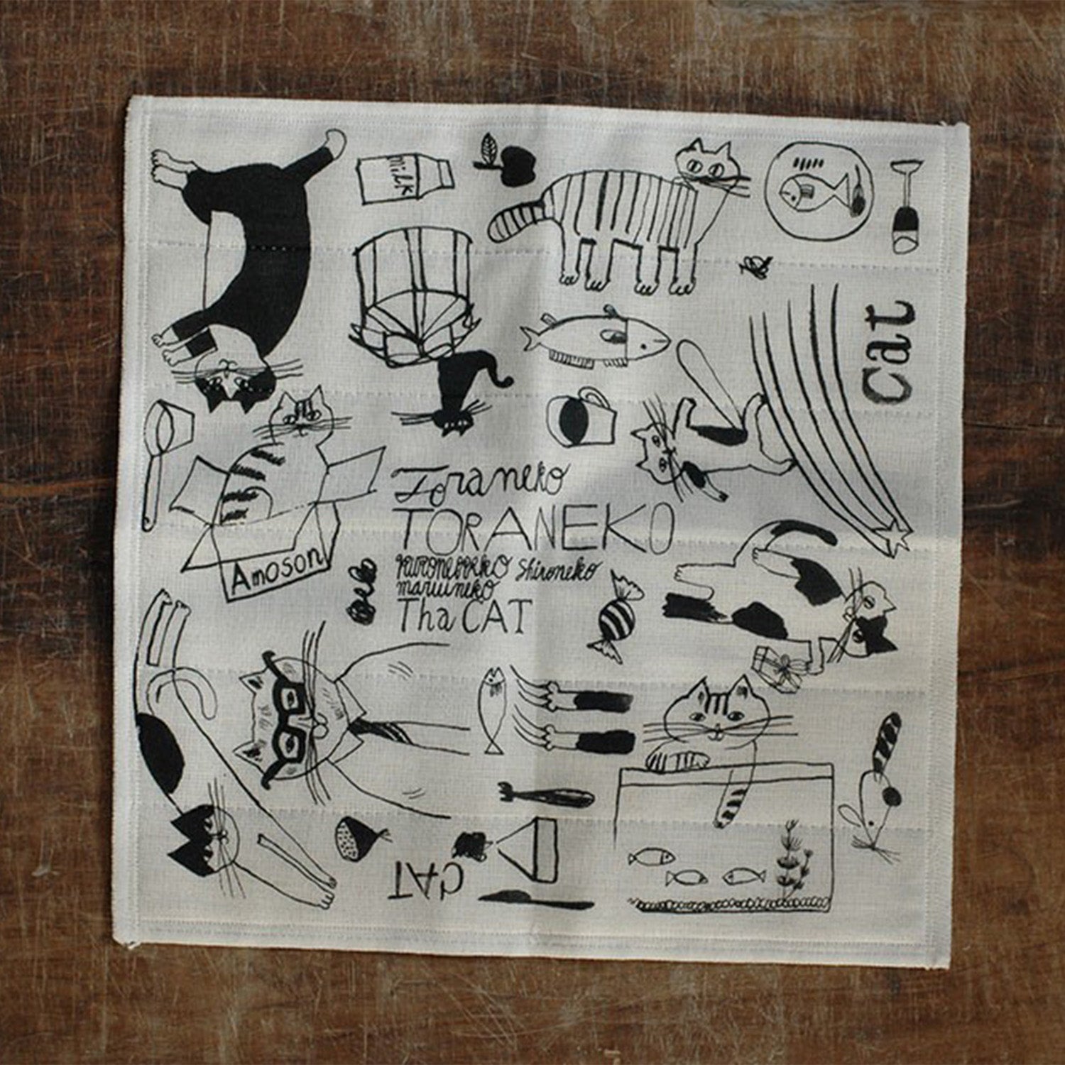 旅するレストラン・トラネコボンボンを主宰する料理人、中西なちおさんデザインの蚊帳生地ふきんです。